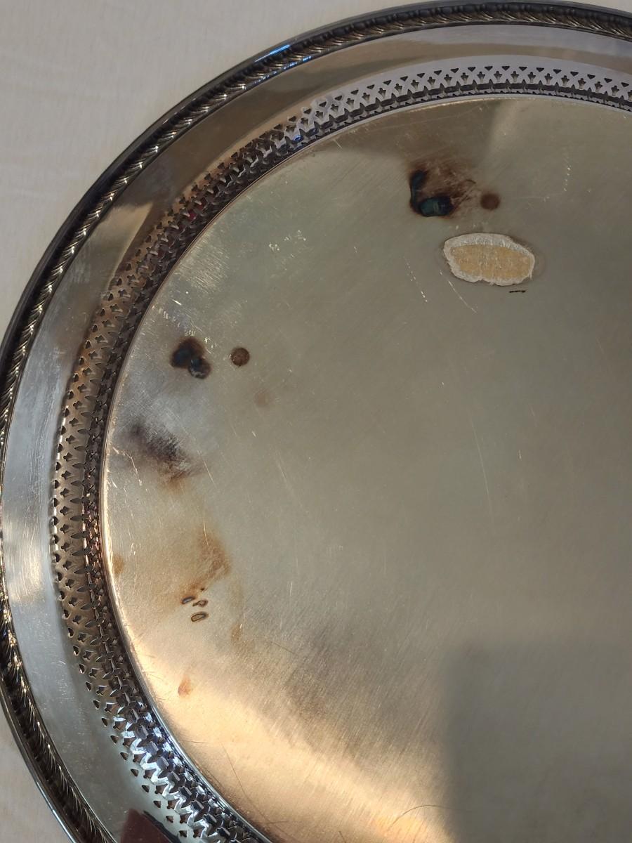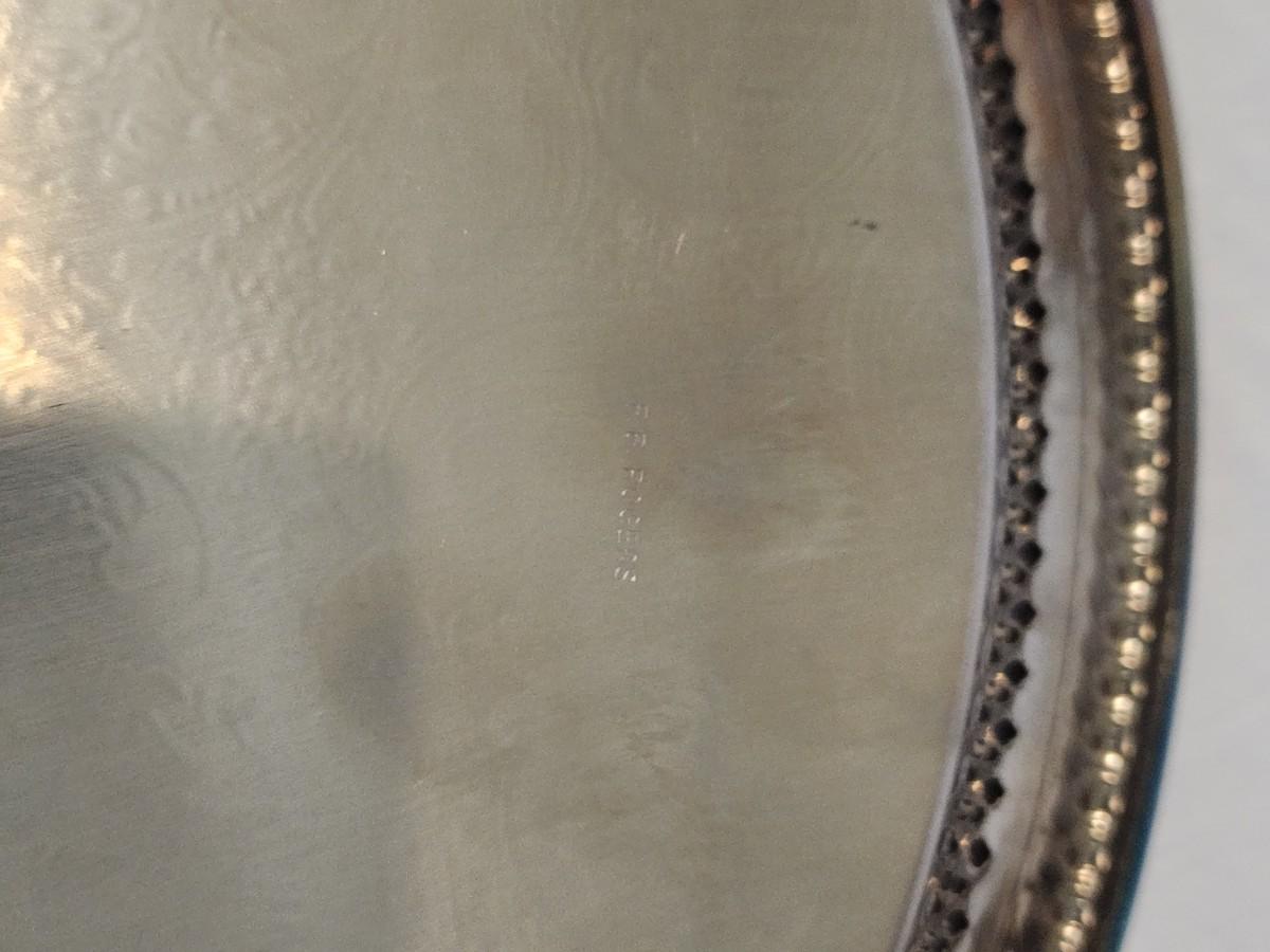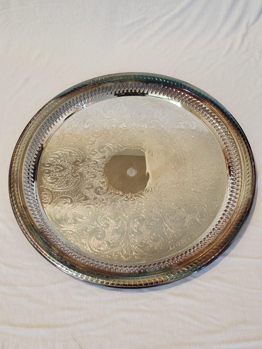 Three good condition ornately designed serving platters with light wear and utensil use.scratches. Small amount of tarnish but no pitting. One large tray has sticker residue in the center top.