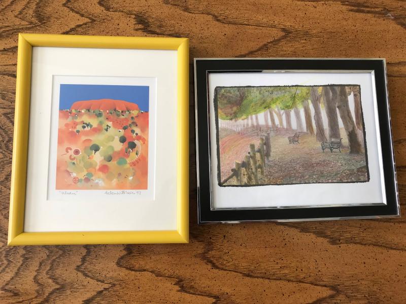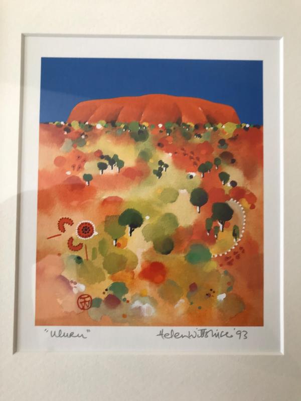 -Nice scenic print "Uluru", in bright blue, green, and orange, by Helen Wiltshire, depicting Uluru Rock in Australia. Matted in white and framed in yellow. 9" x 11"H.