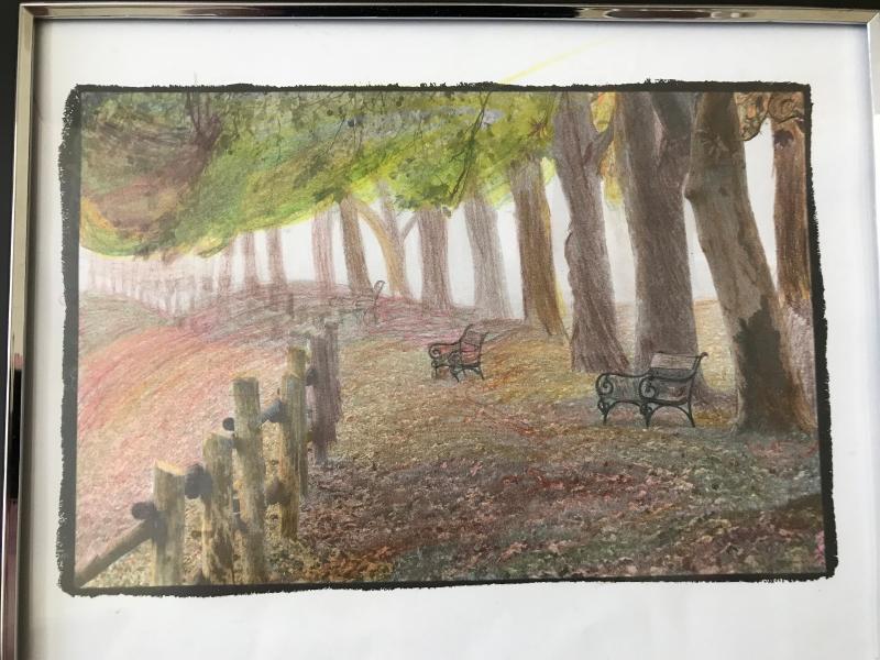 -Nice park scene featuring a fence row with benches and trees. Framed in black and silver. 11" x 9" H