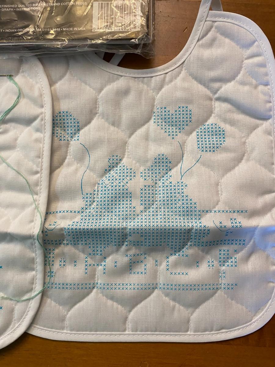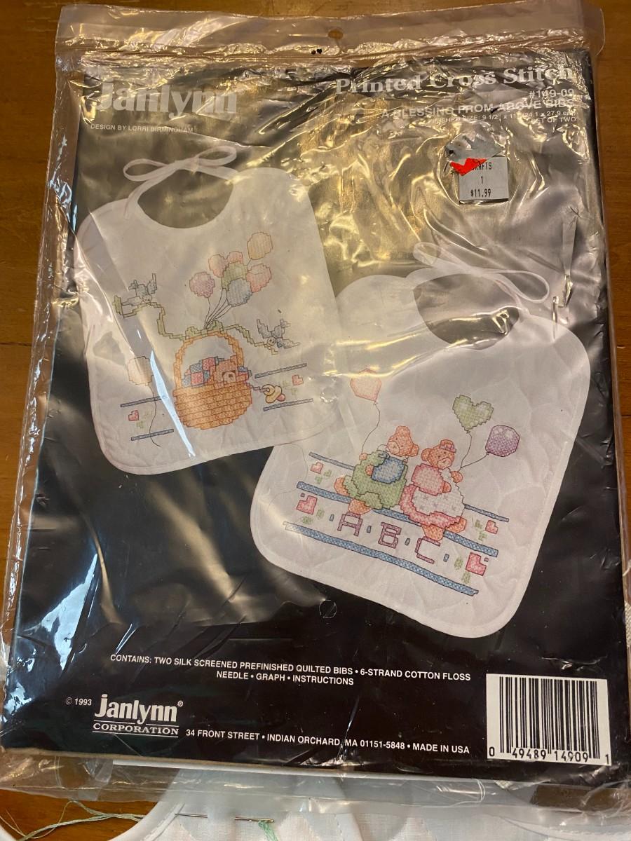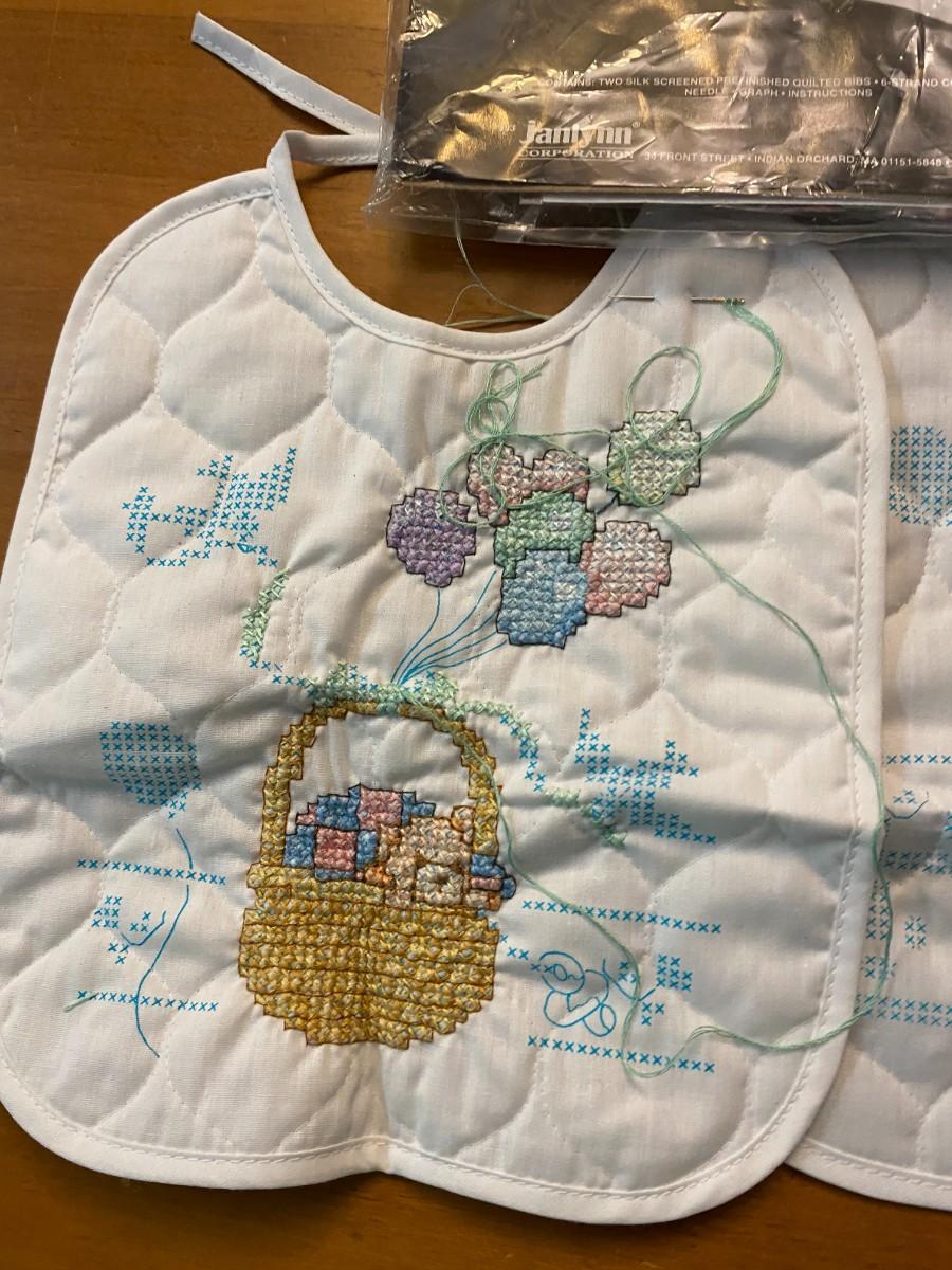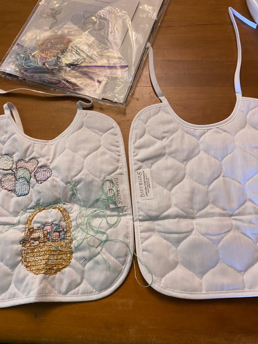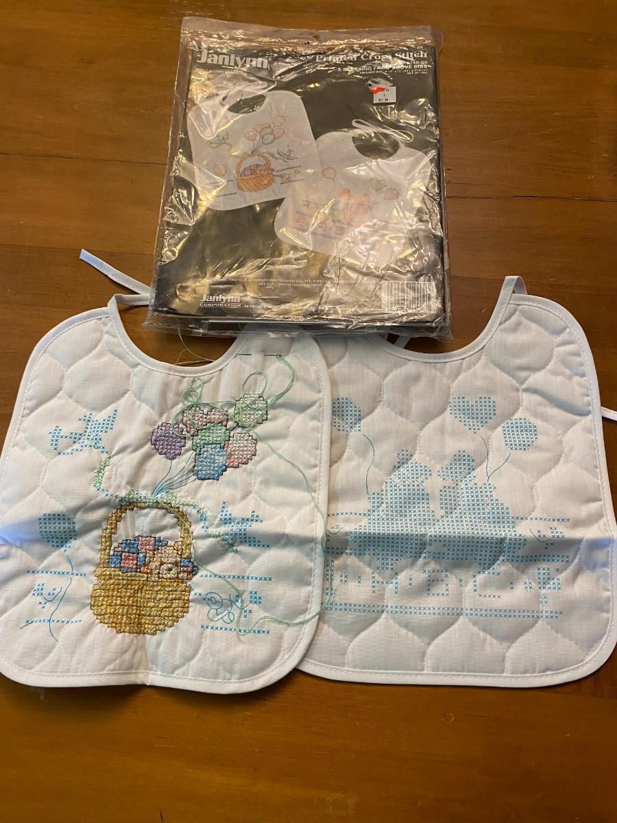 Lot of 2 stamped cross stitch kit baby bibs started