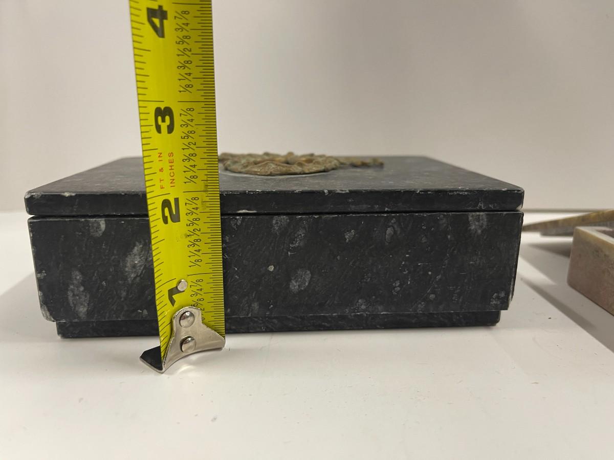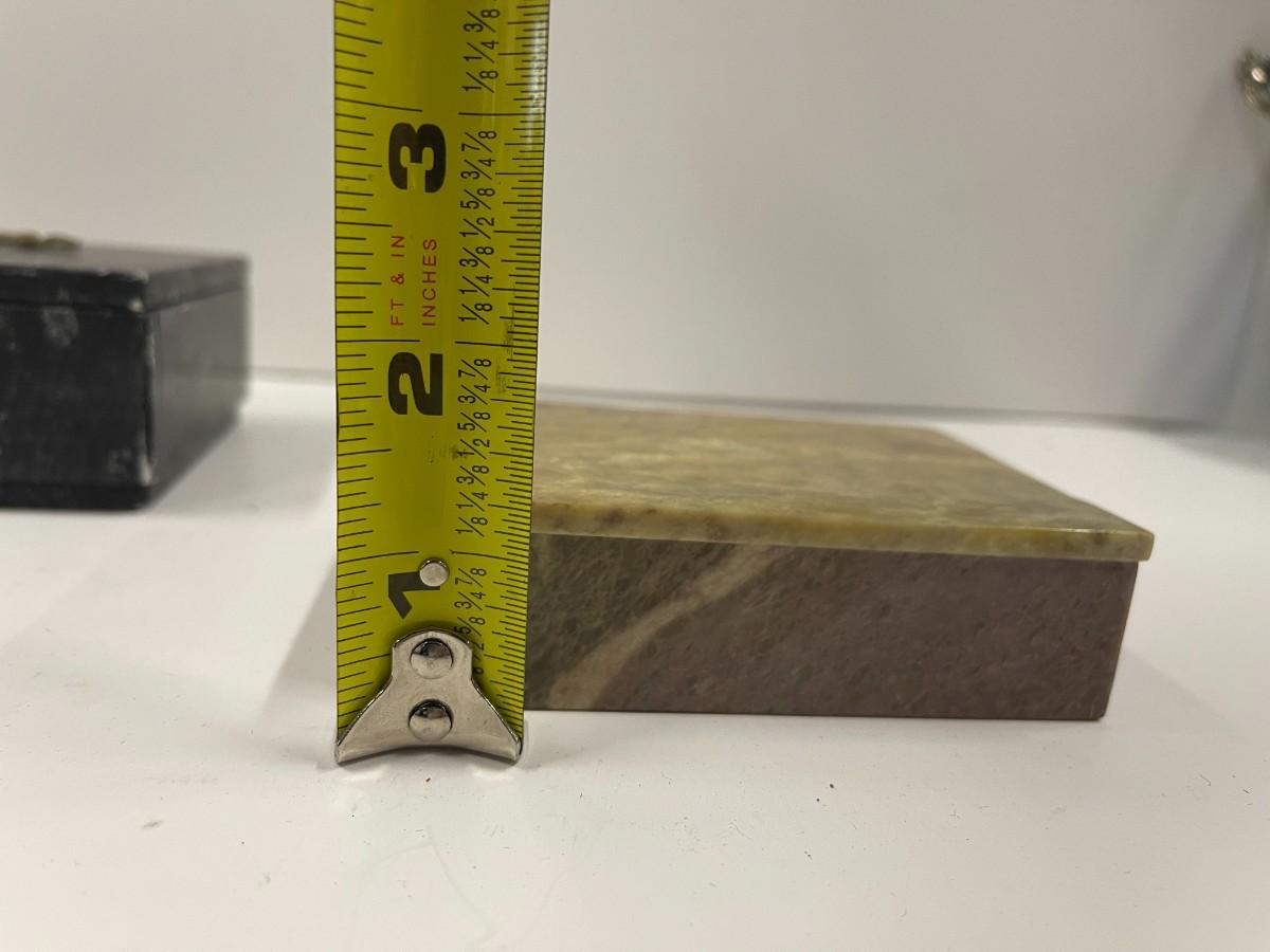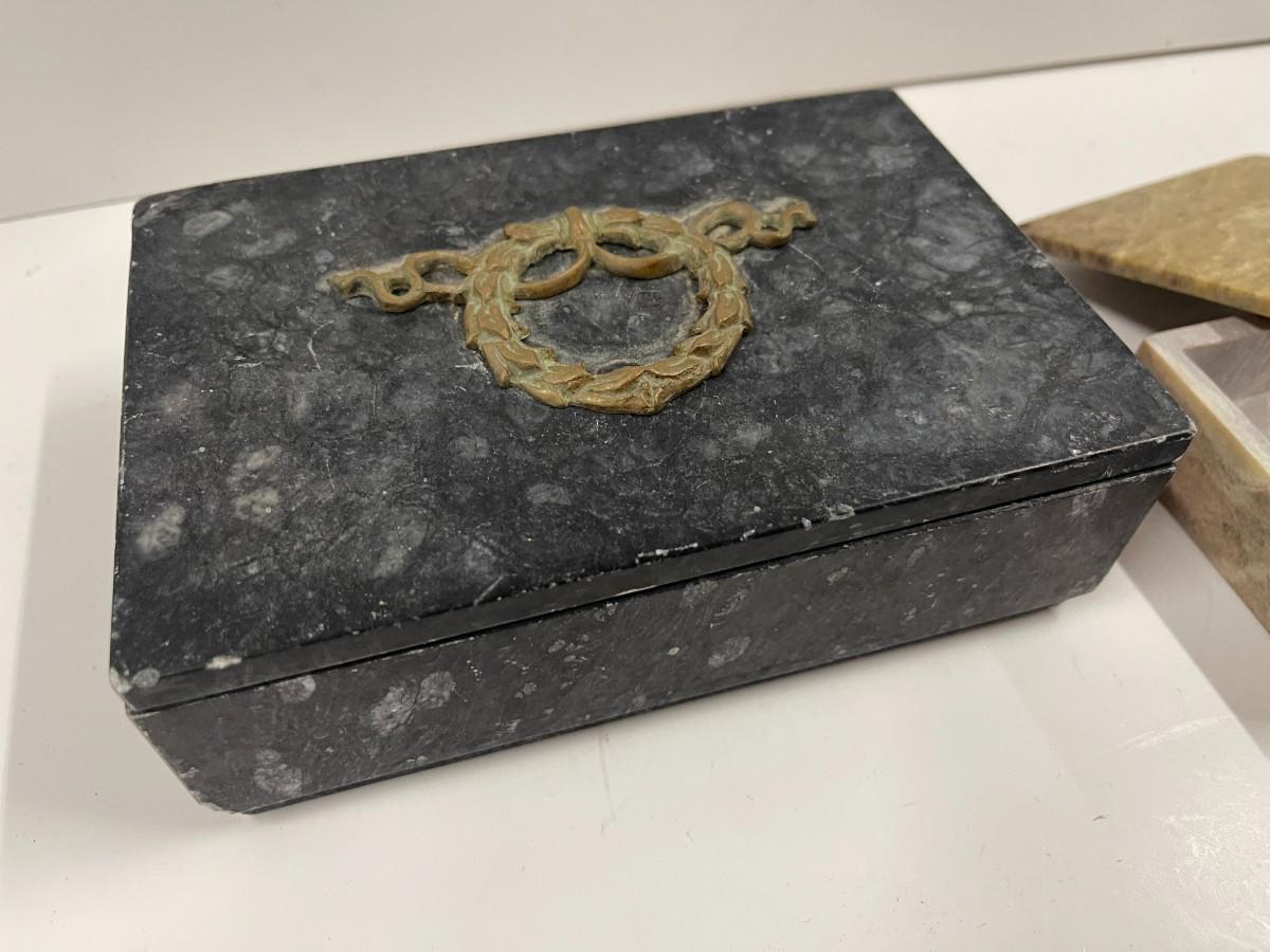 Lot of 2 Stone Trinket Boxes. The decorative ornament on the darker box has fallen off (glue dried out). Just needs to be reglued.