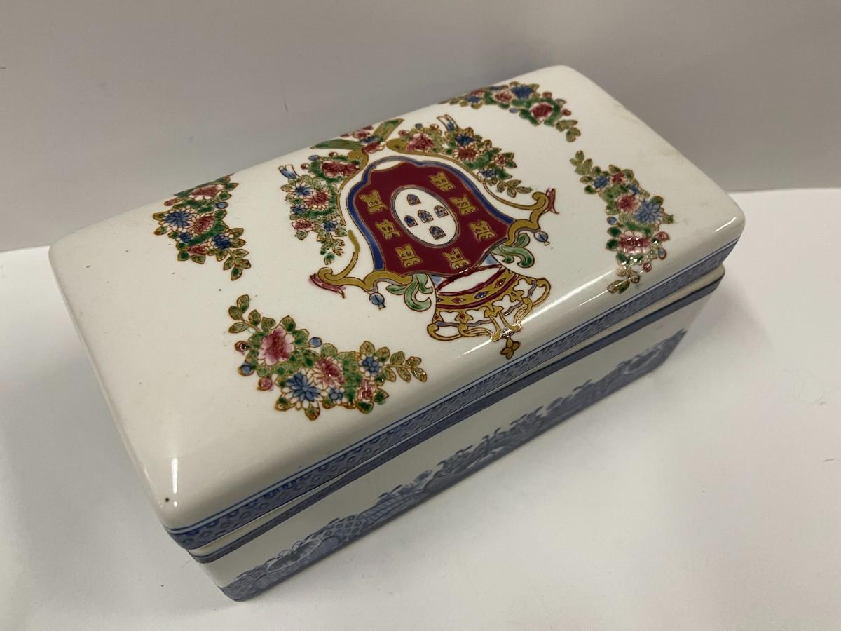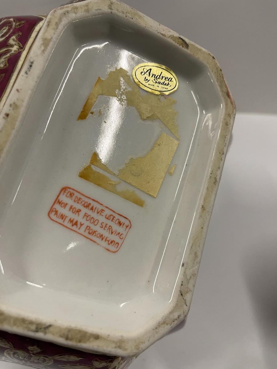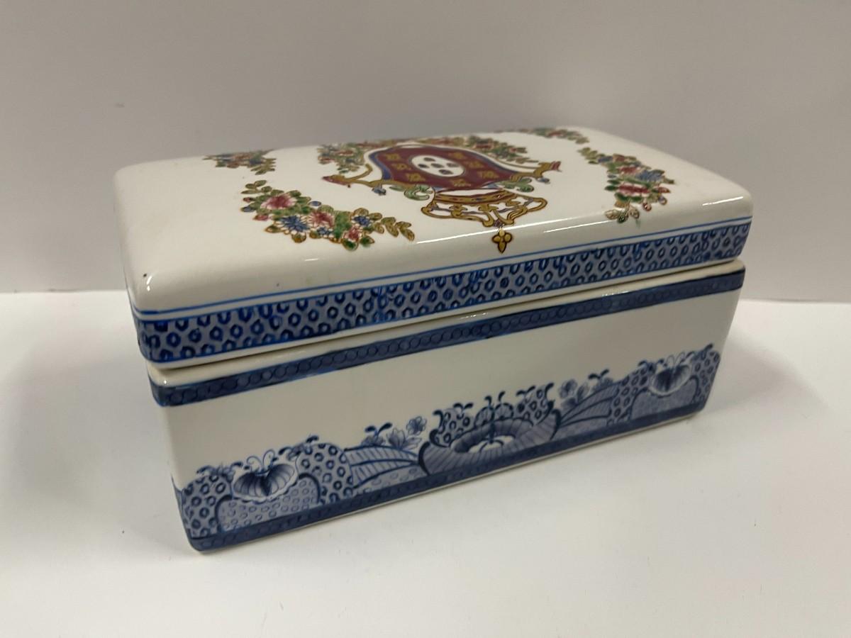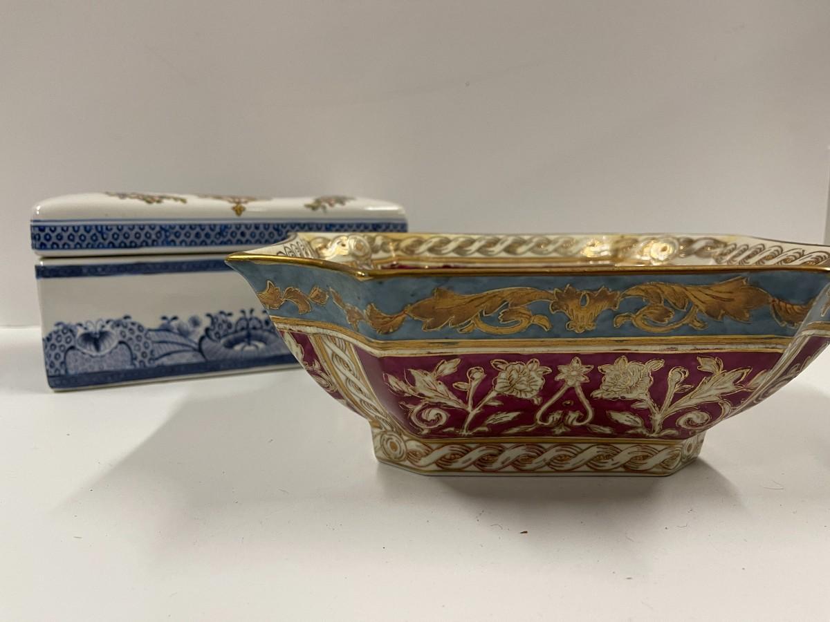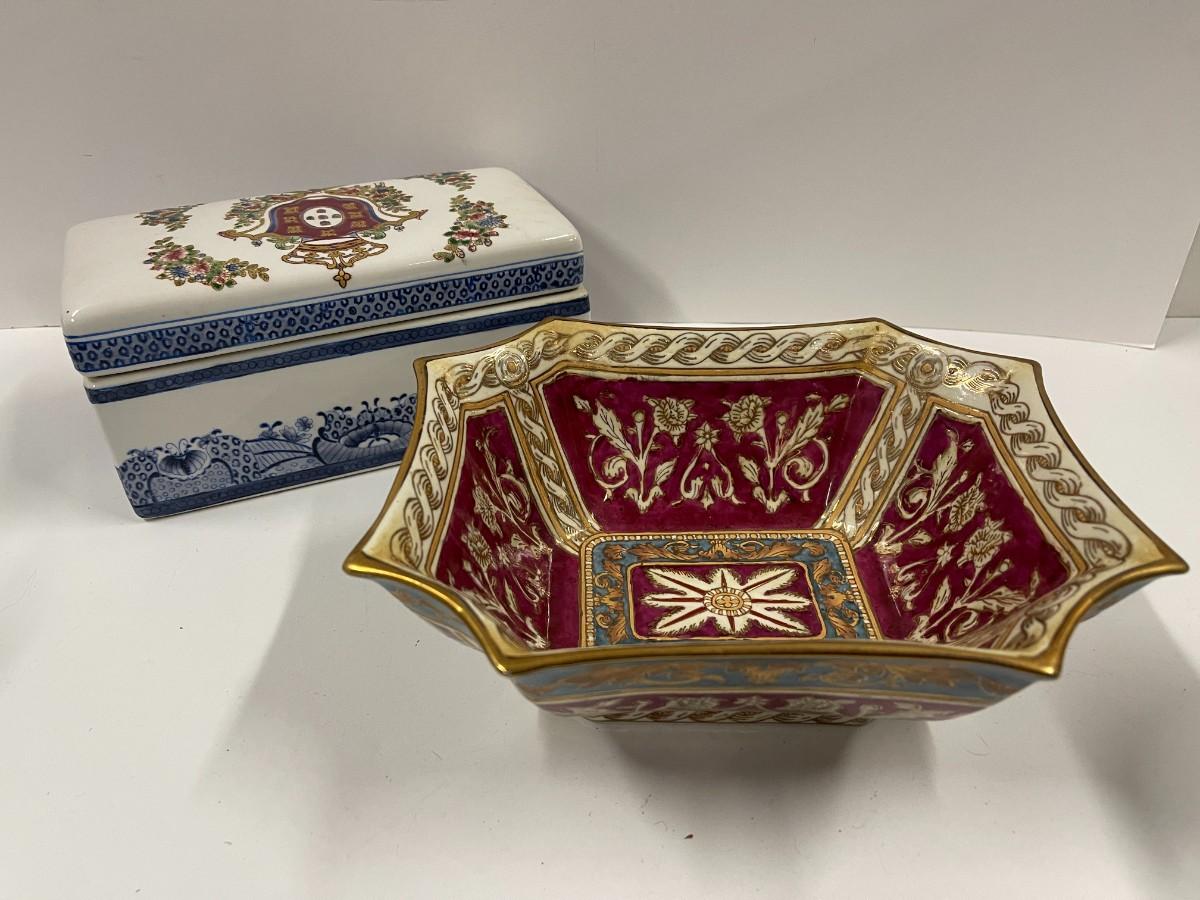 Lot of 2 vintage porcelain pieces: Andrea by Sadek bowl (7" x 9") and Oriental Accent rectangular jar with lid (4" x 8")