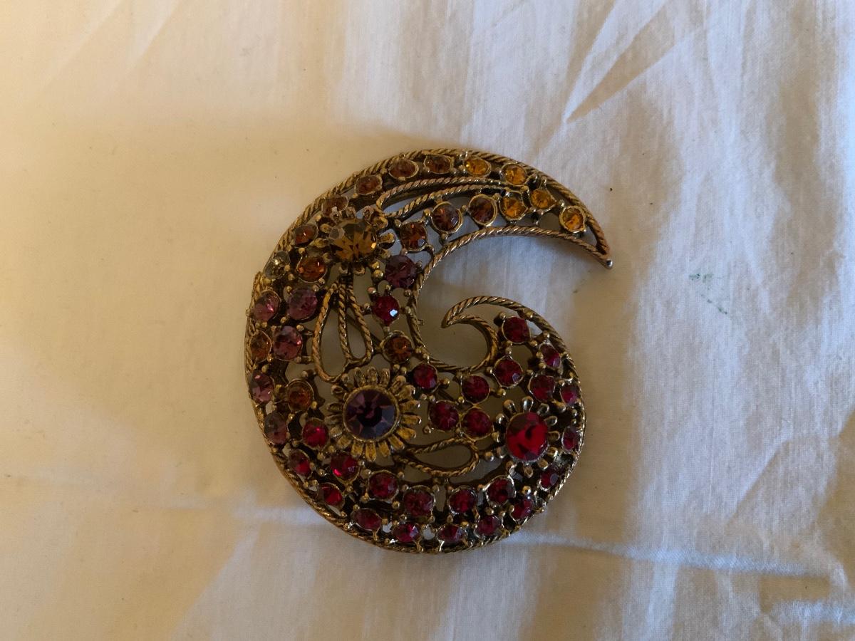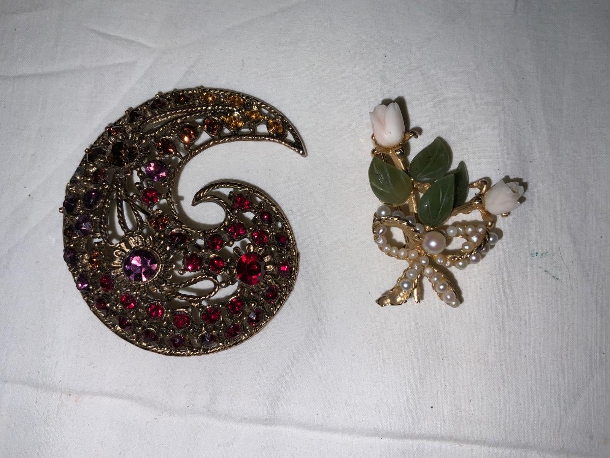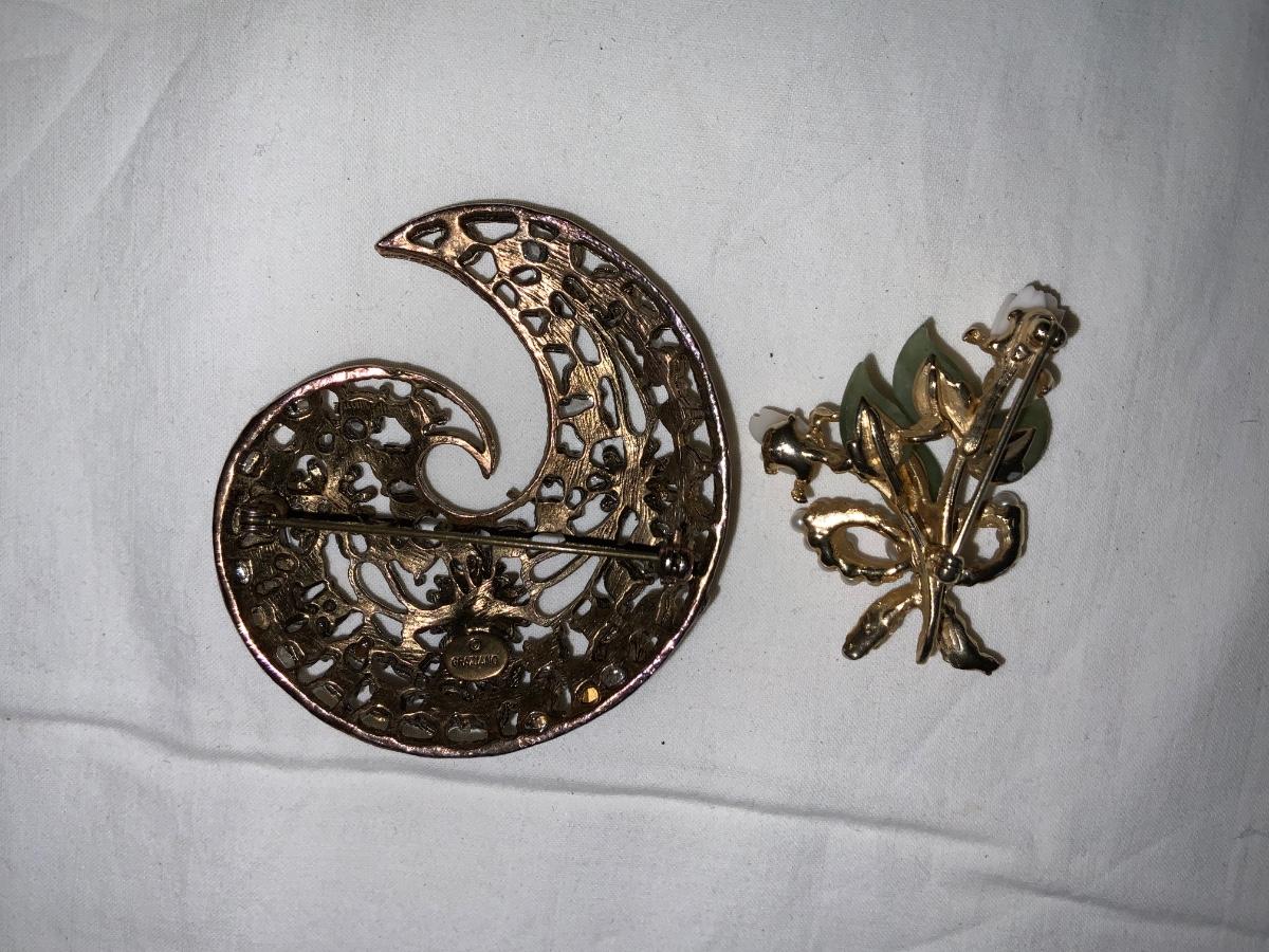 Vintage Brooches. large one marked Graziano. Other Jade Brooch appears to be unmarked and missing 1 small pearl, Not tested or verified please see pics for condition