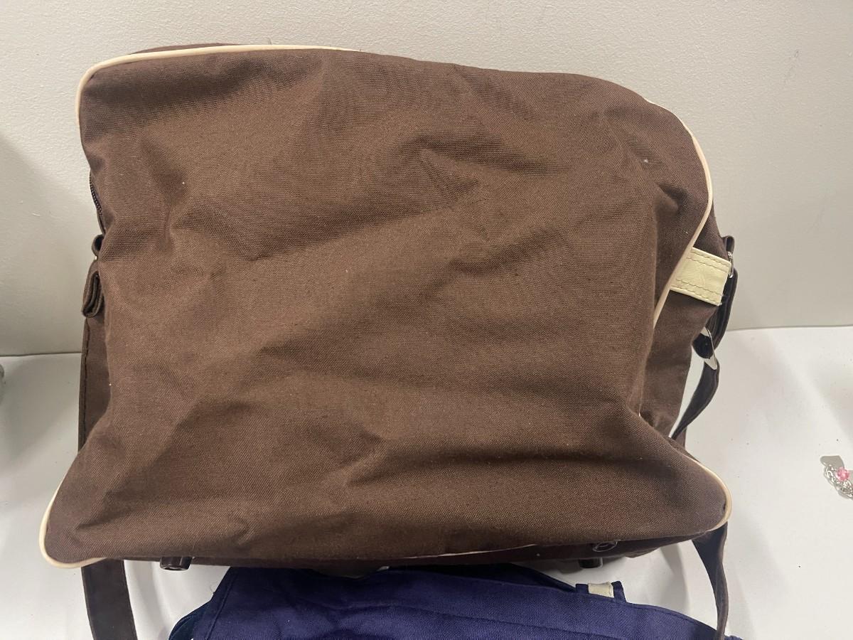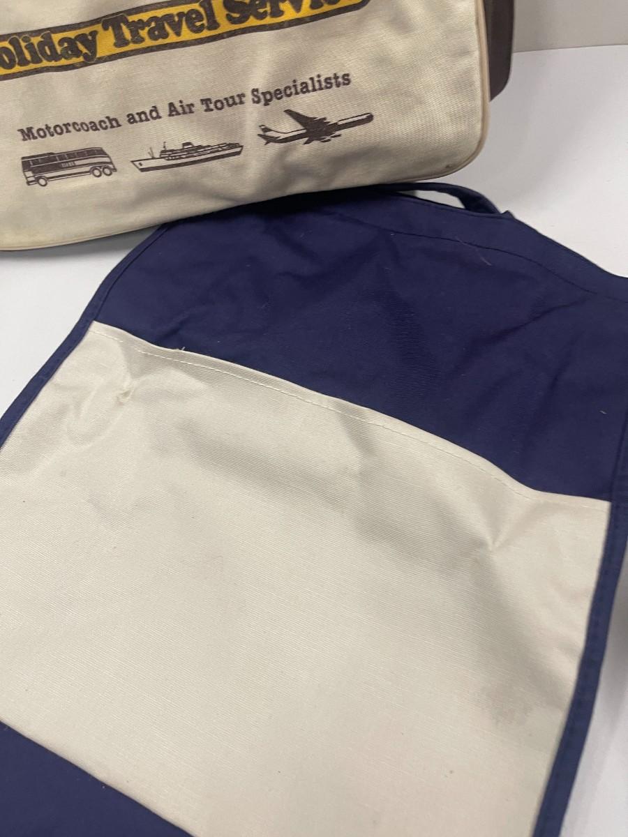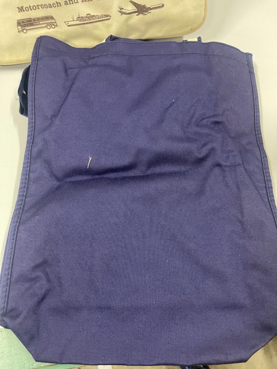 Lot of 2 vintage canvas tote bags. Both in very good condition. The travel bag shows some wear to the faux leather trim.