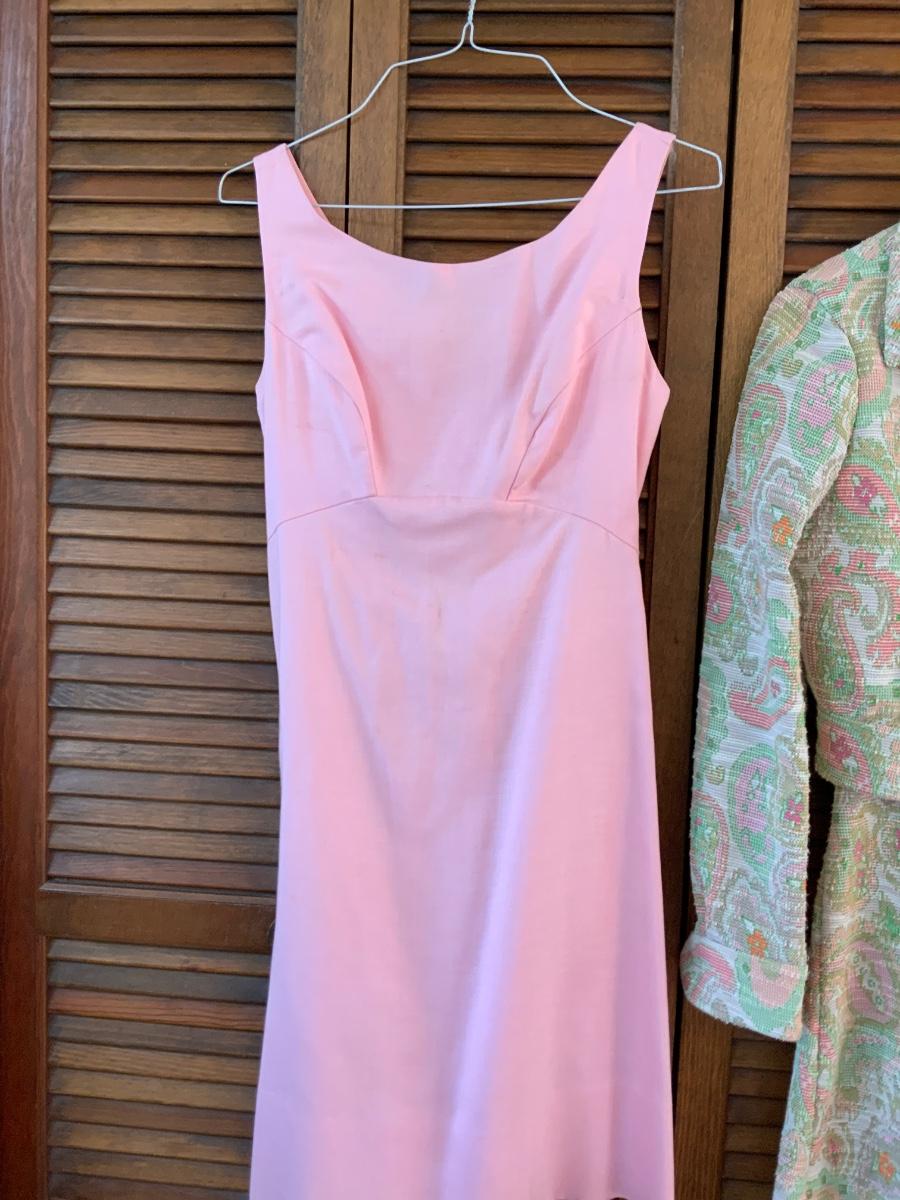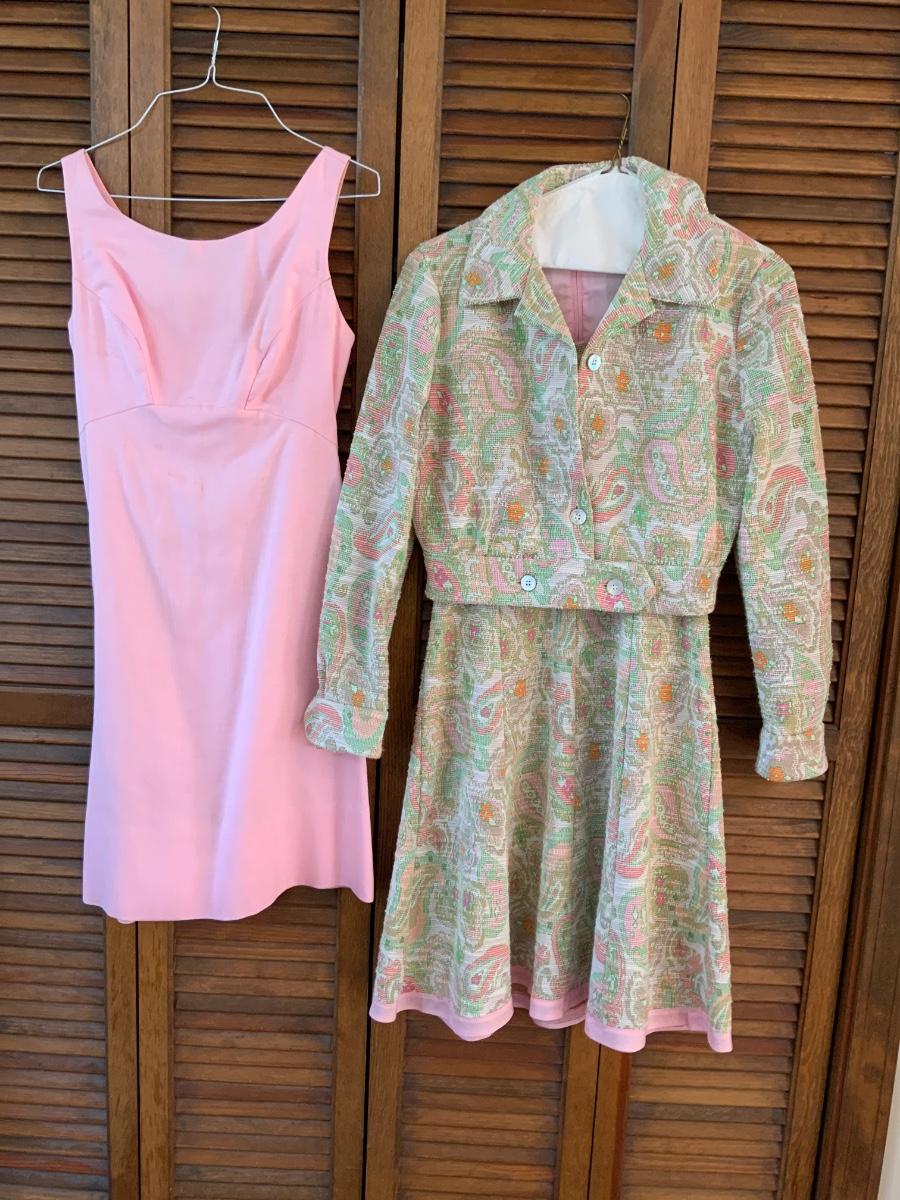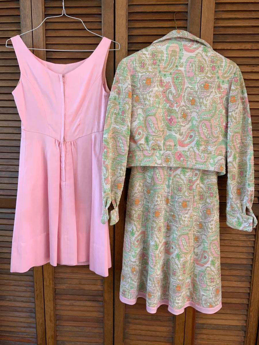 Lot of 2 vintage dresses, Including one with A matching jacket. Dress with matching jacket size 7/8.. pink dress is unmarked.