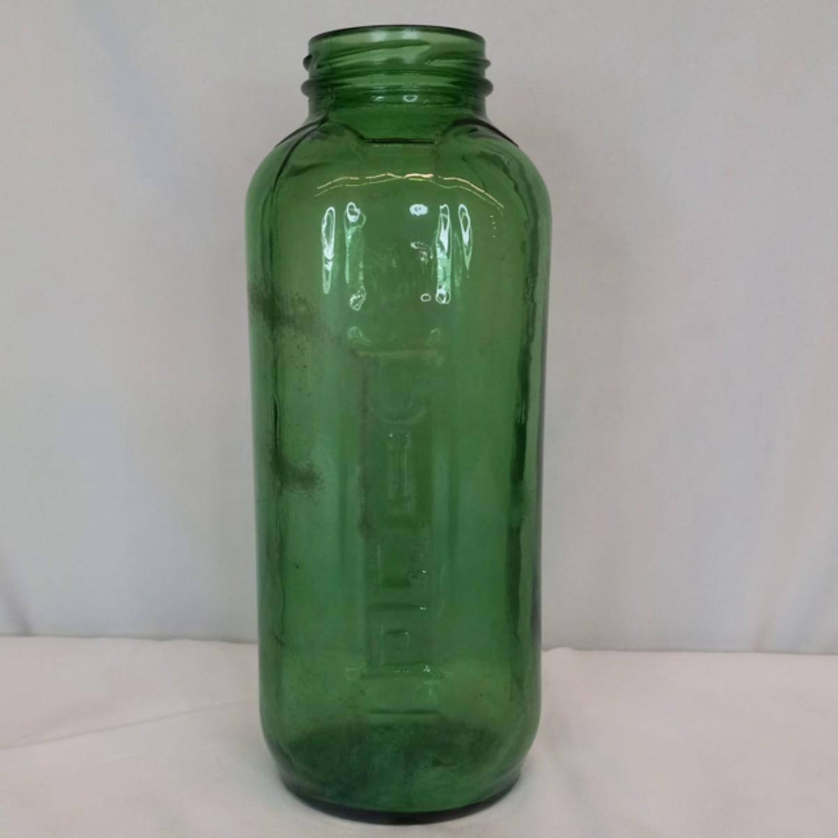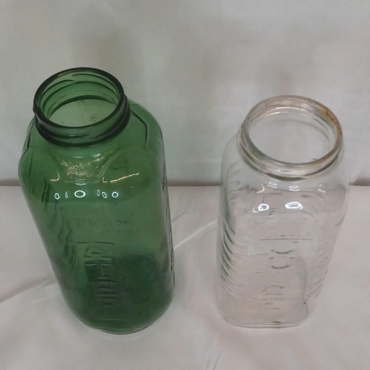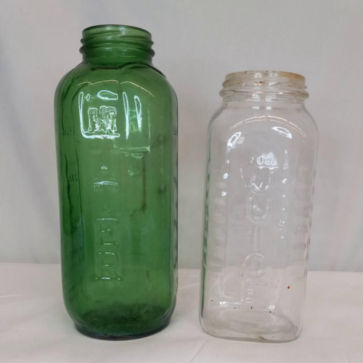 This lot include a vintage green glass juice/water bottle and a clear glass juice/water bottle. The green bottle is approximately 9" tall and the clear bottle is approximately 8" tall.