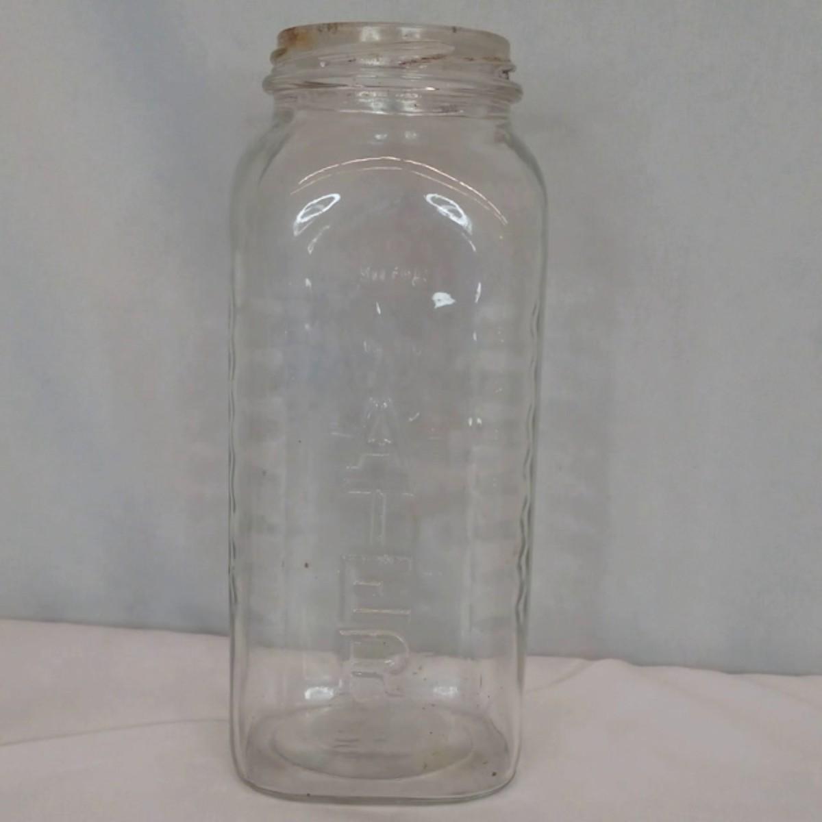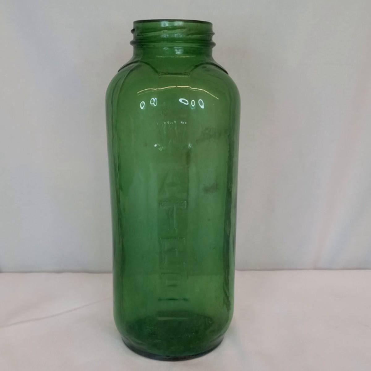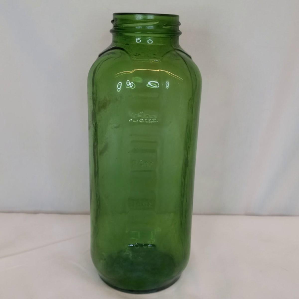 This lot include a vintage green glass juice/water bottle and a clear glass juice/water bottle. The green bottle is approximately 9" tall and the clear bottle is approximately 8" tall.