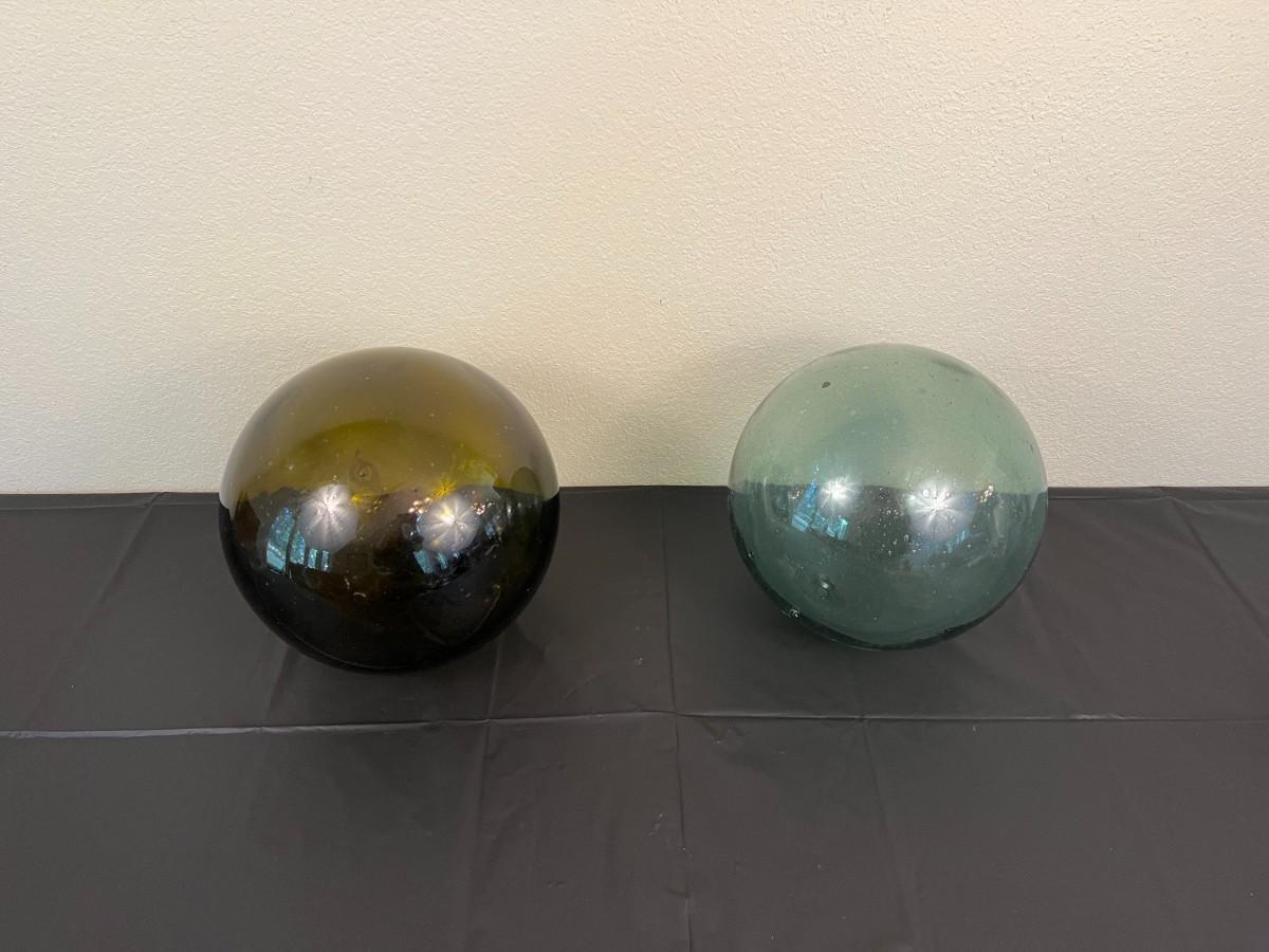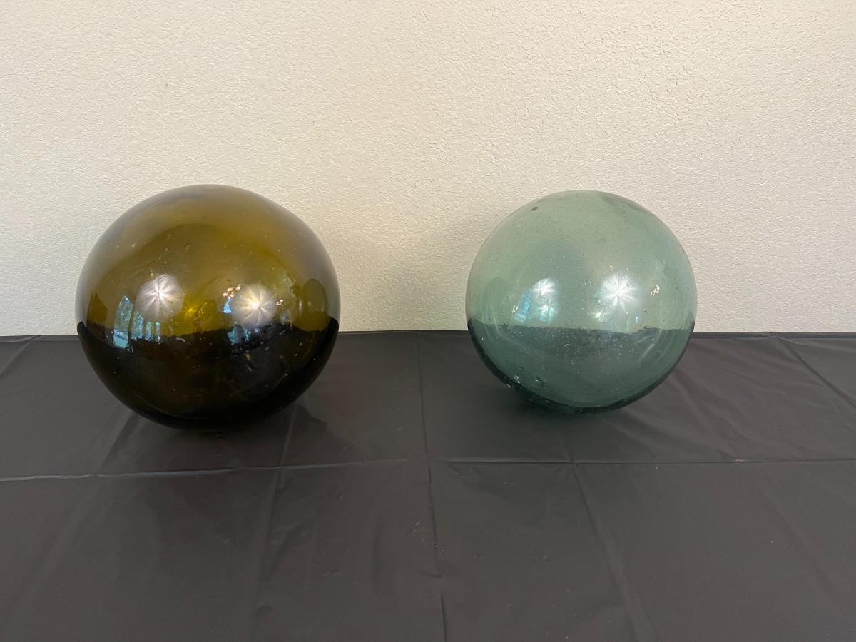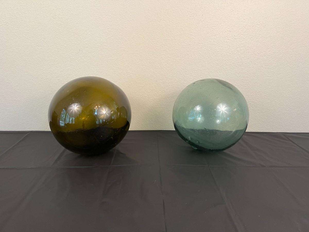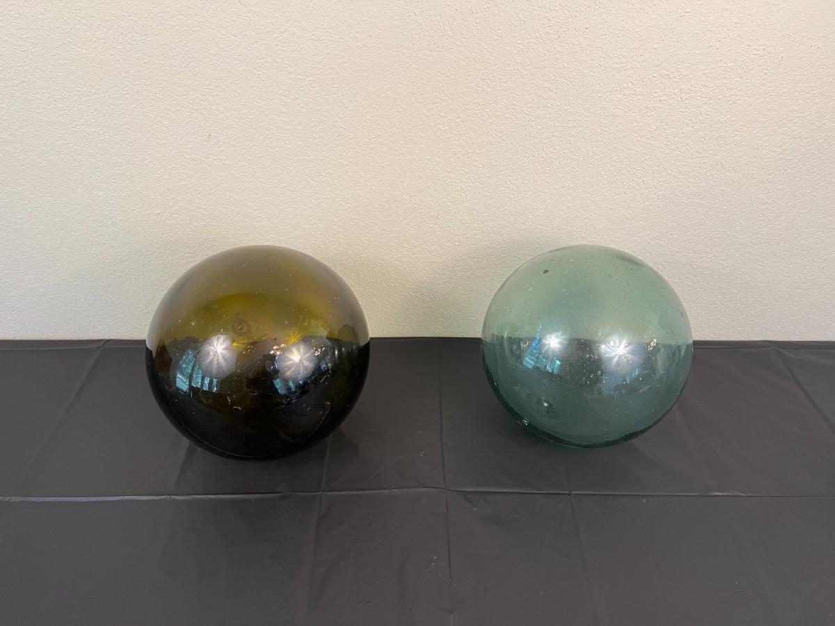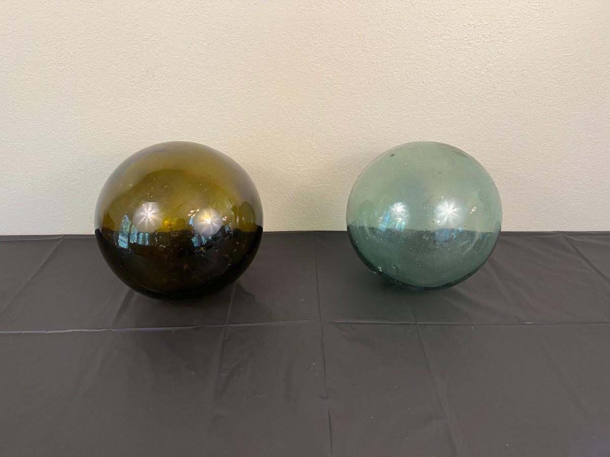 Lot of 2 Vintage Hand Blown Glass Fishing Buoy Balls in Green and Blue glass. In good condition, as shown.
