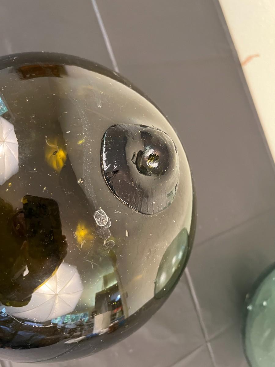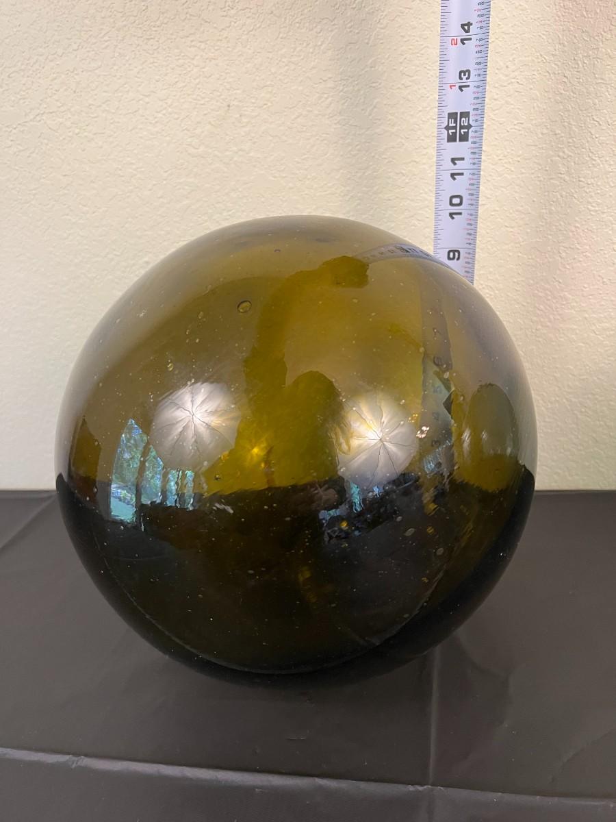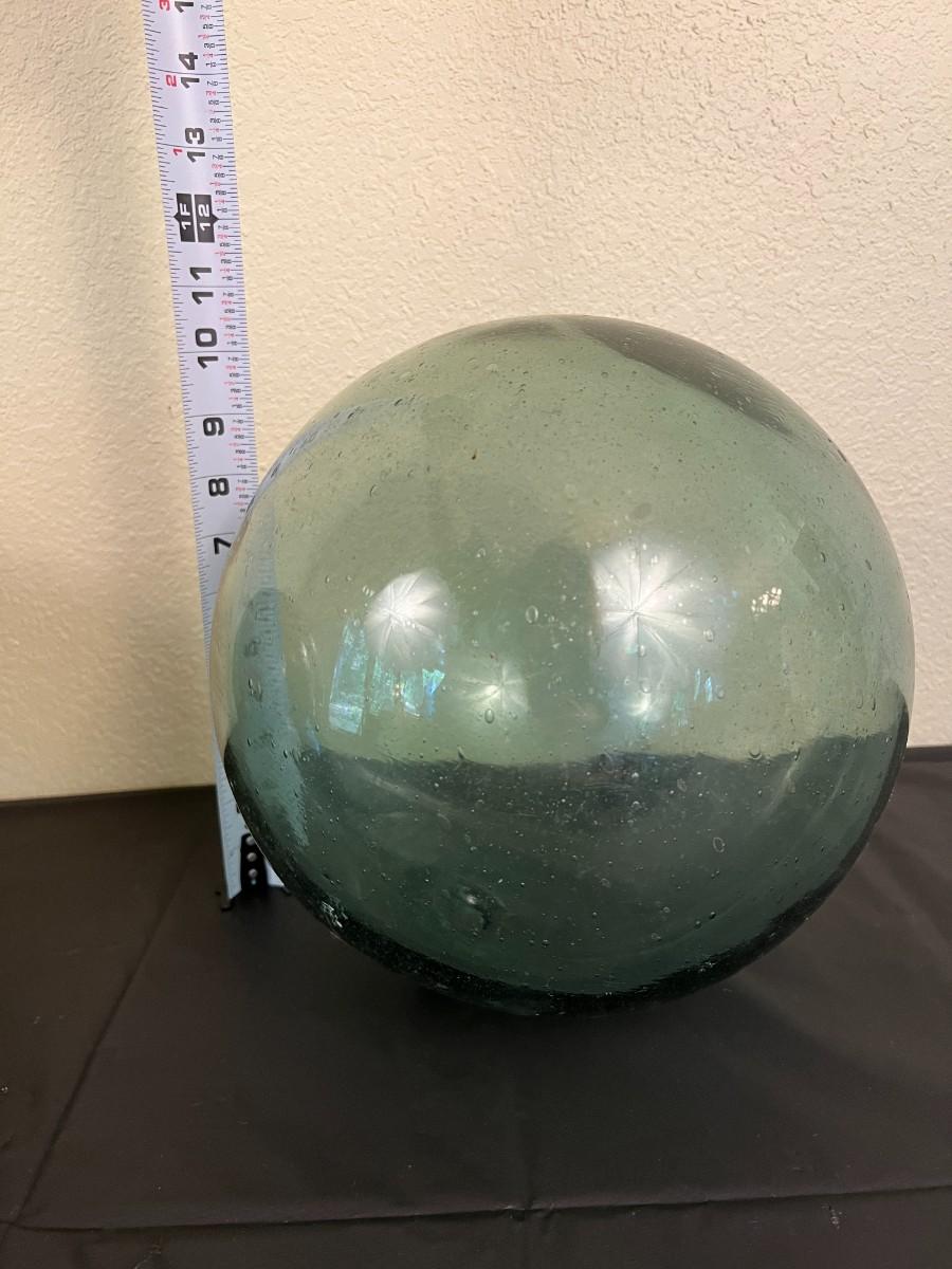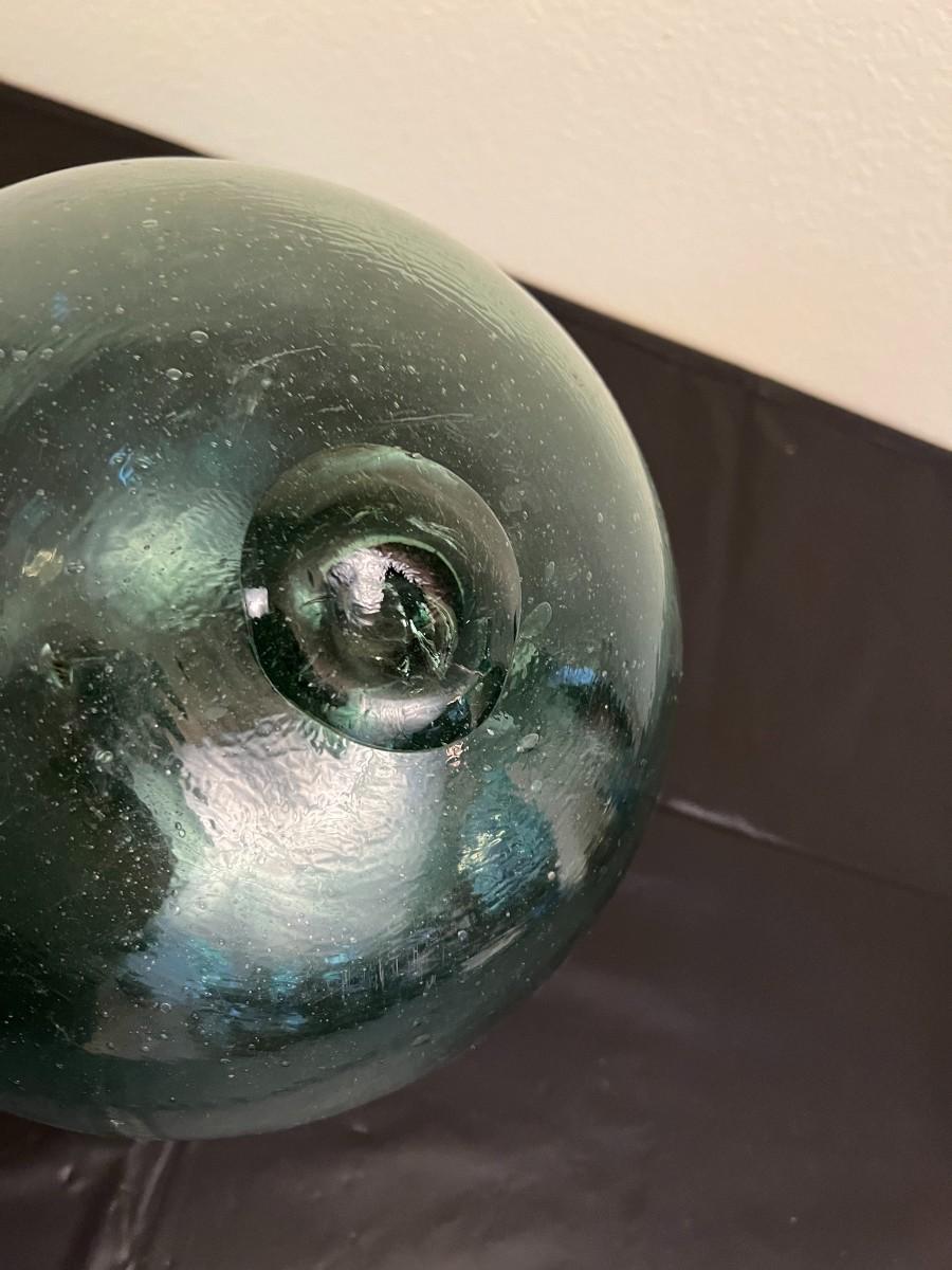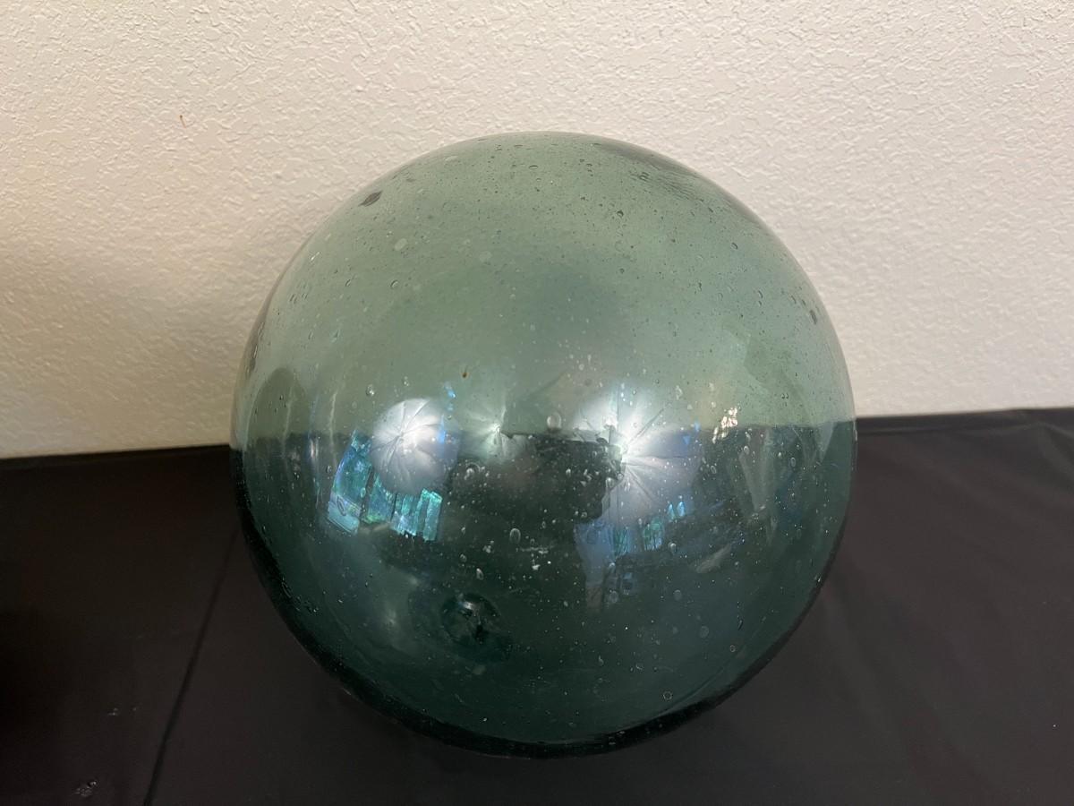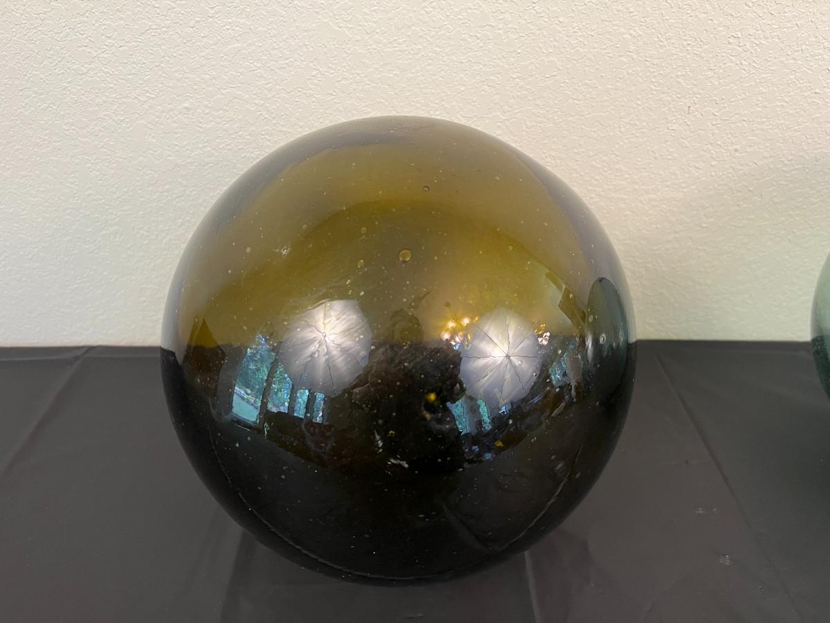 Lot of 2 Vintage Hand Blown Glass Fishing Buoy Balls in Green and Blue glass. In good condition, as shown.