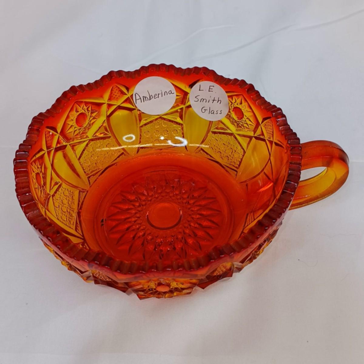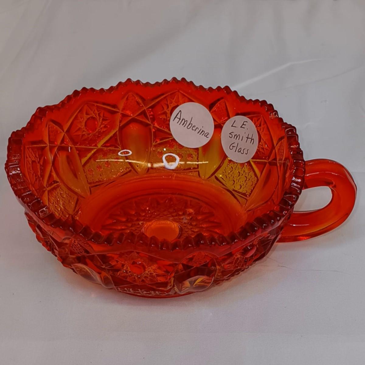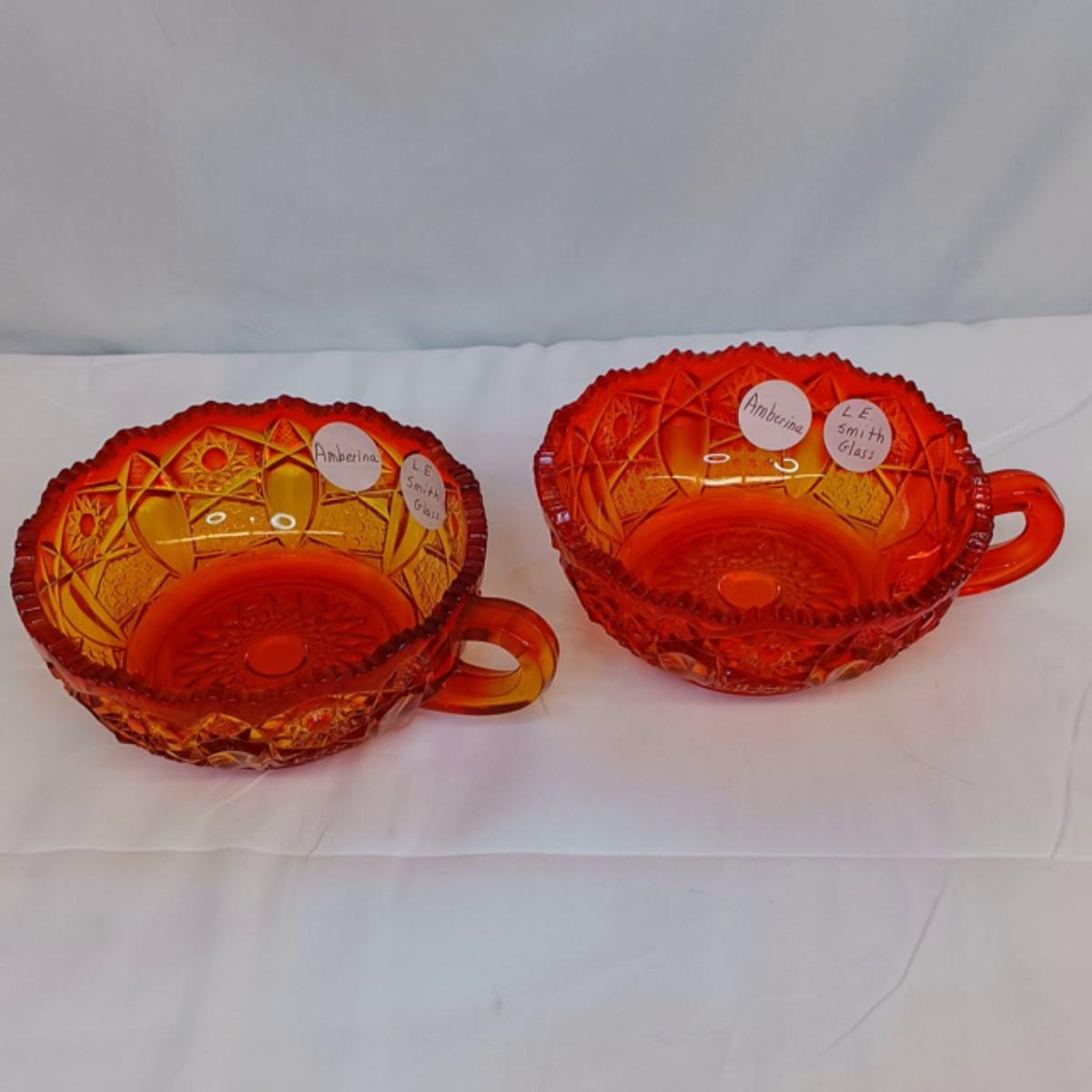 This is a vintage lot of 2 L.E. Smith glass amberina dishes w/ handle. Both pieces are in very good, like new condition. They are free of chips, cracks or other damage.