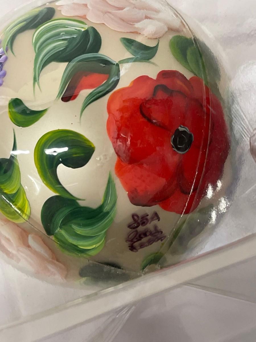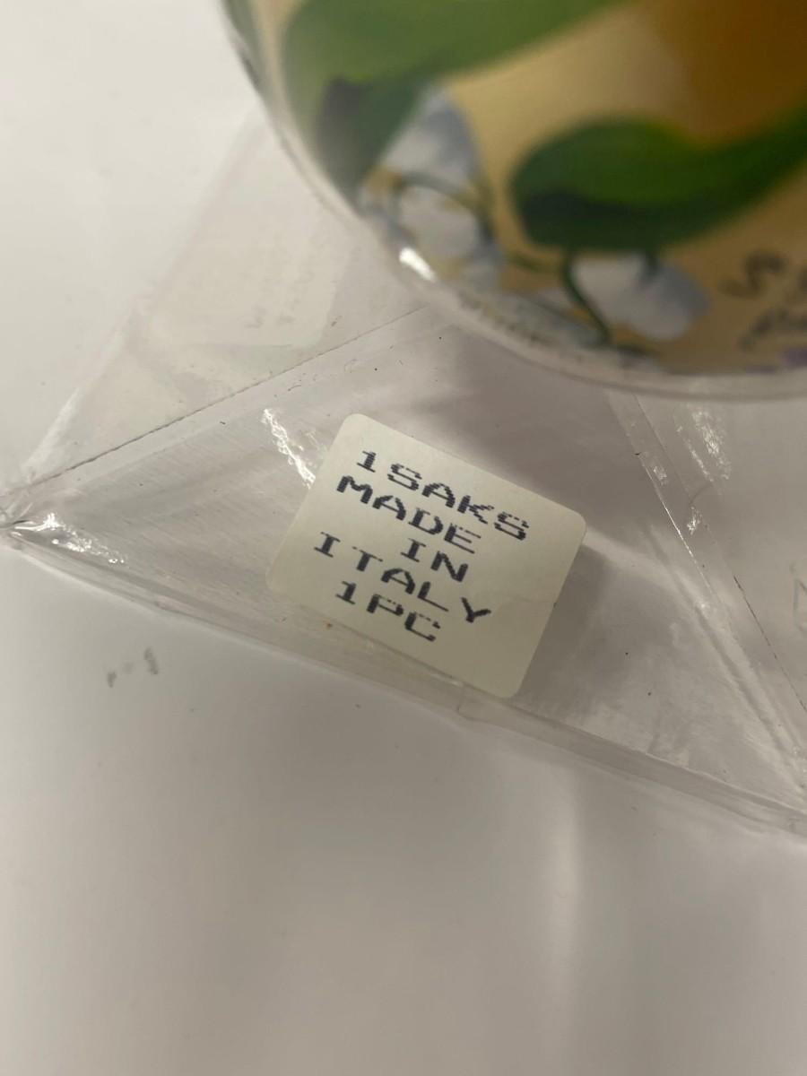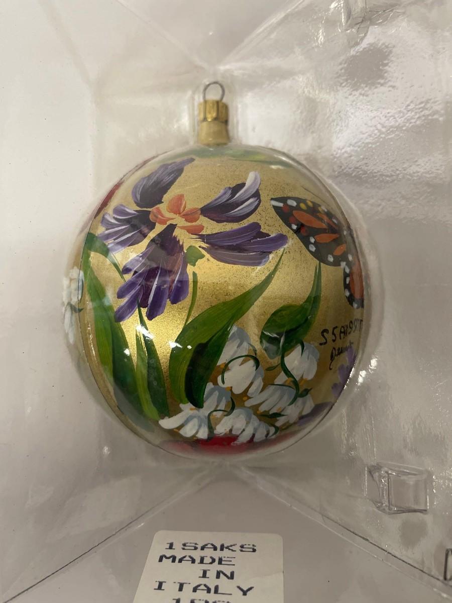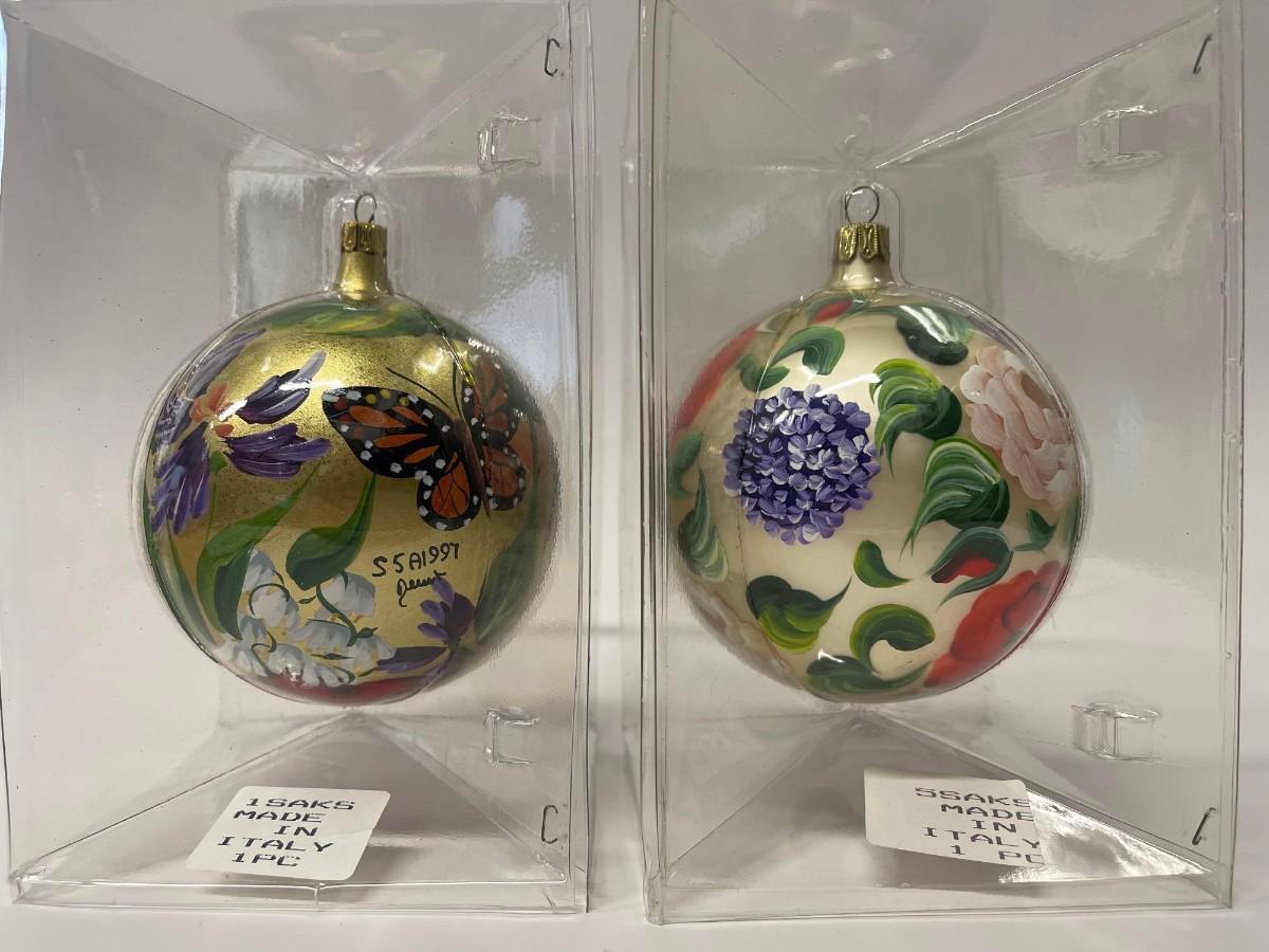 Lot of 2 Vintage Saks Fifth Ave Hand Painted Christmas Ornaments Circa 1997 & 2002. Both in very good condition. One (1997) has some minor imperfections in the paint. Examine photos carefully for condition. Each is 4 1/2”. Signed and dated, made in Italy.