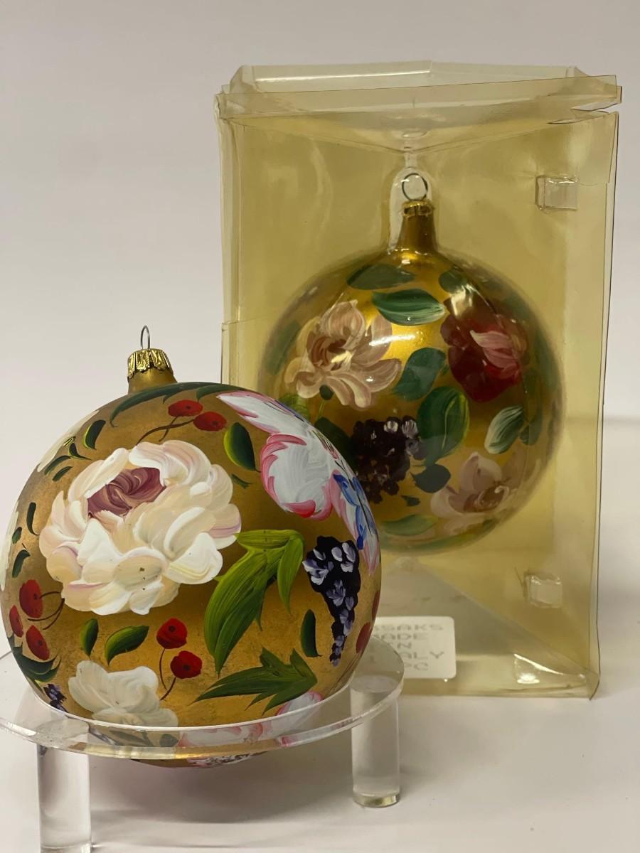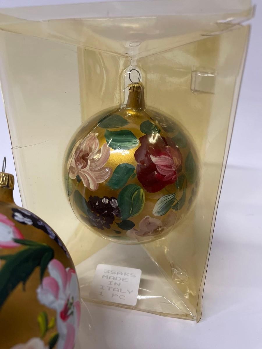 <p>Lot of 2 Vintage Saks Fifth Avenue Hand Made Annual Christmas Holiday Ornament Balls. Each 4”. Hand made for Saks Fifth Avenue. One is in excellent condition and one has some wear to the paint. </p>