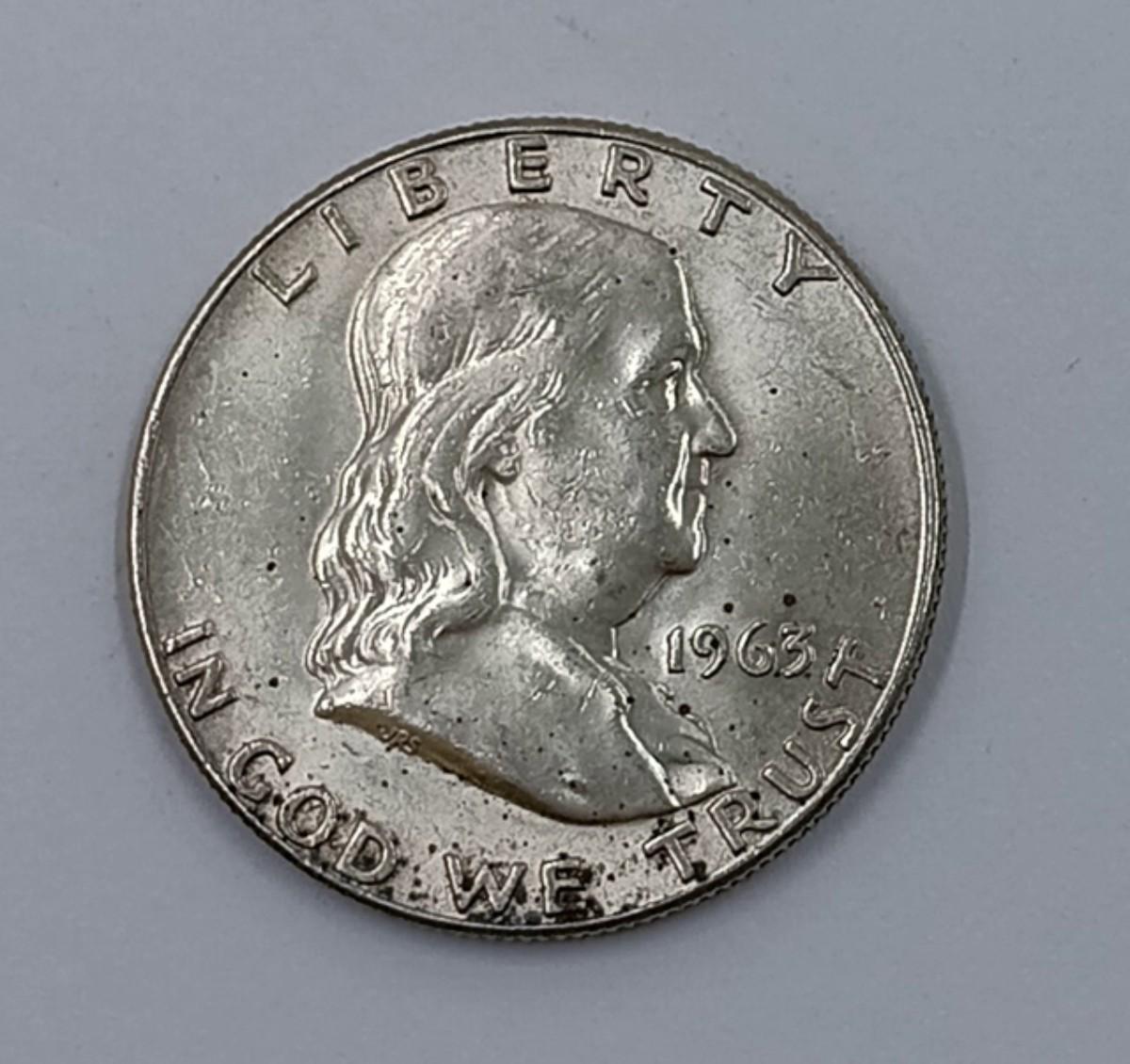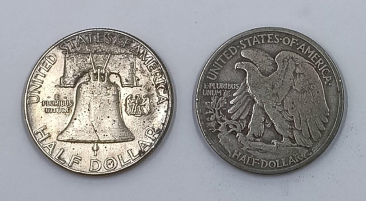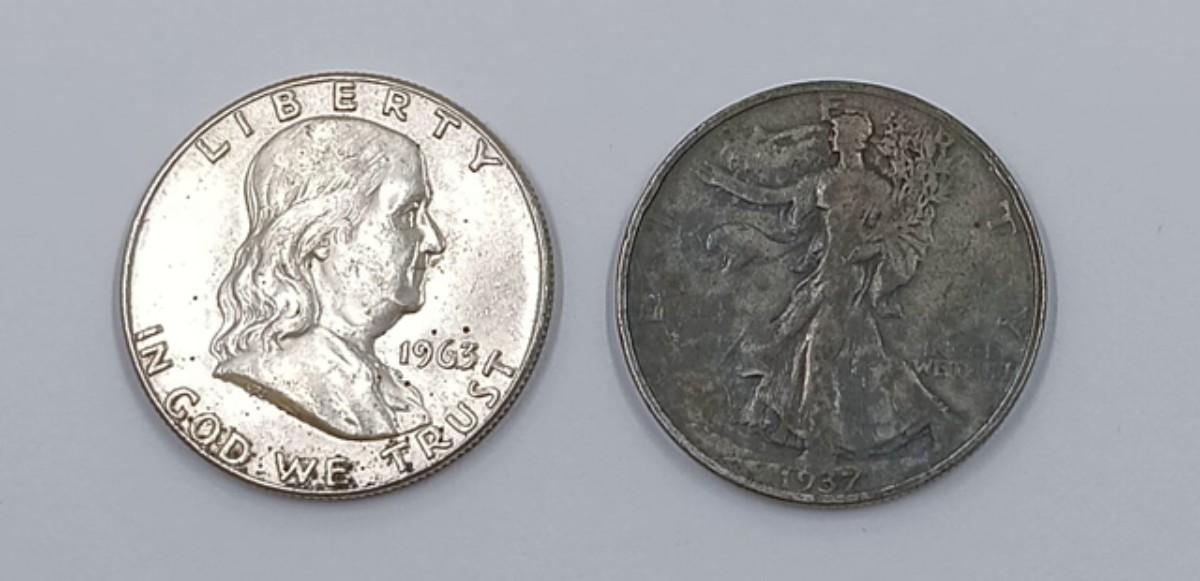 This lot consists of 2 vintage silver half dollar coins. The first is a 1937 silver Walking Liberty half dollar and the second is a 1963 Franklin half dollar.