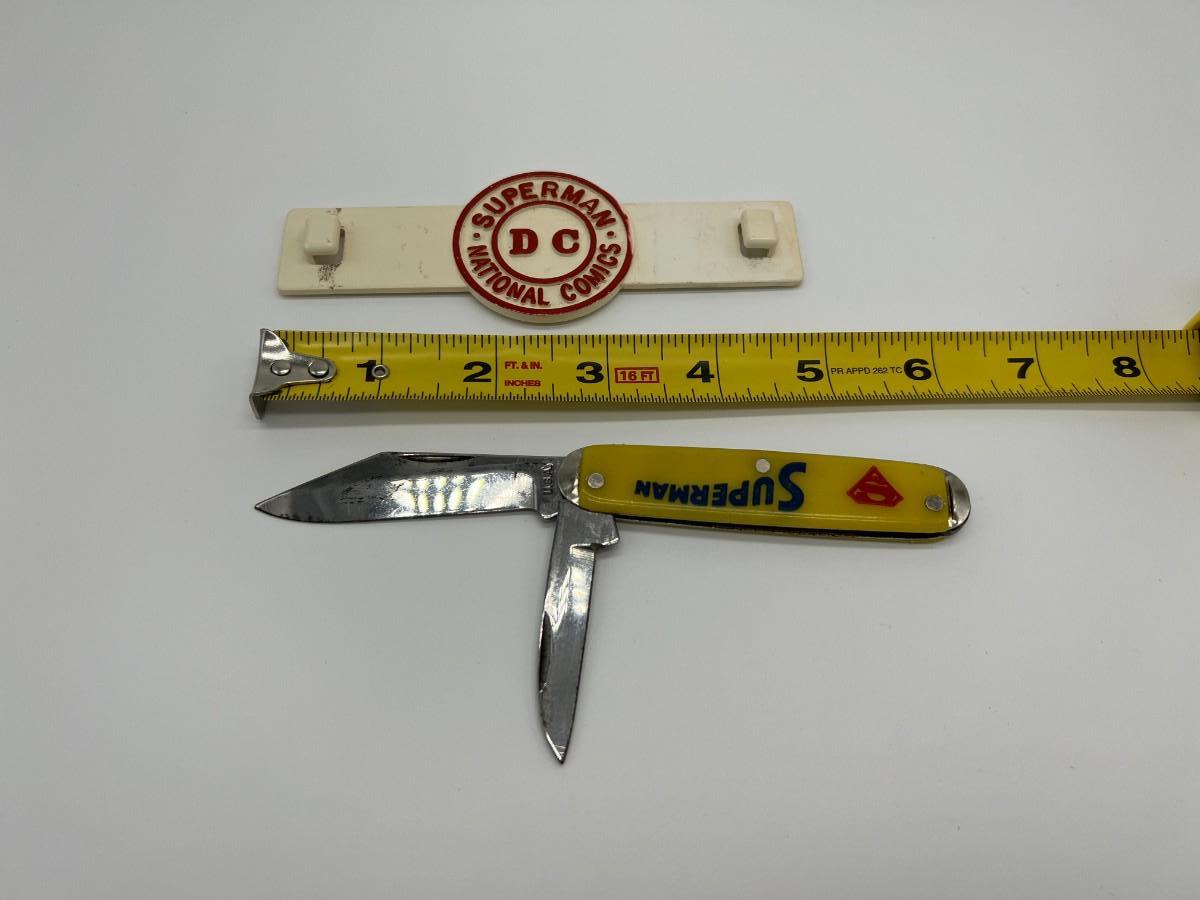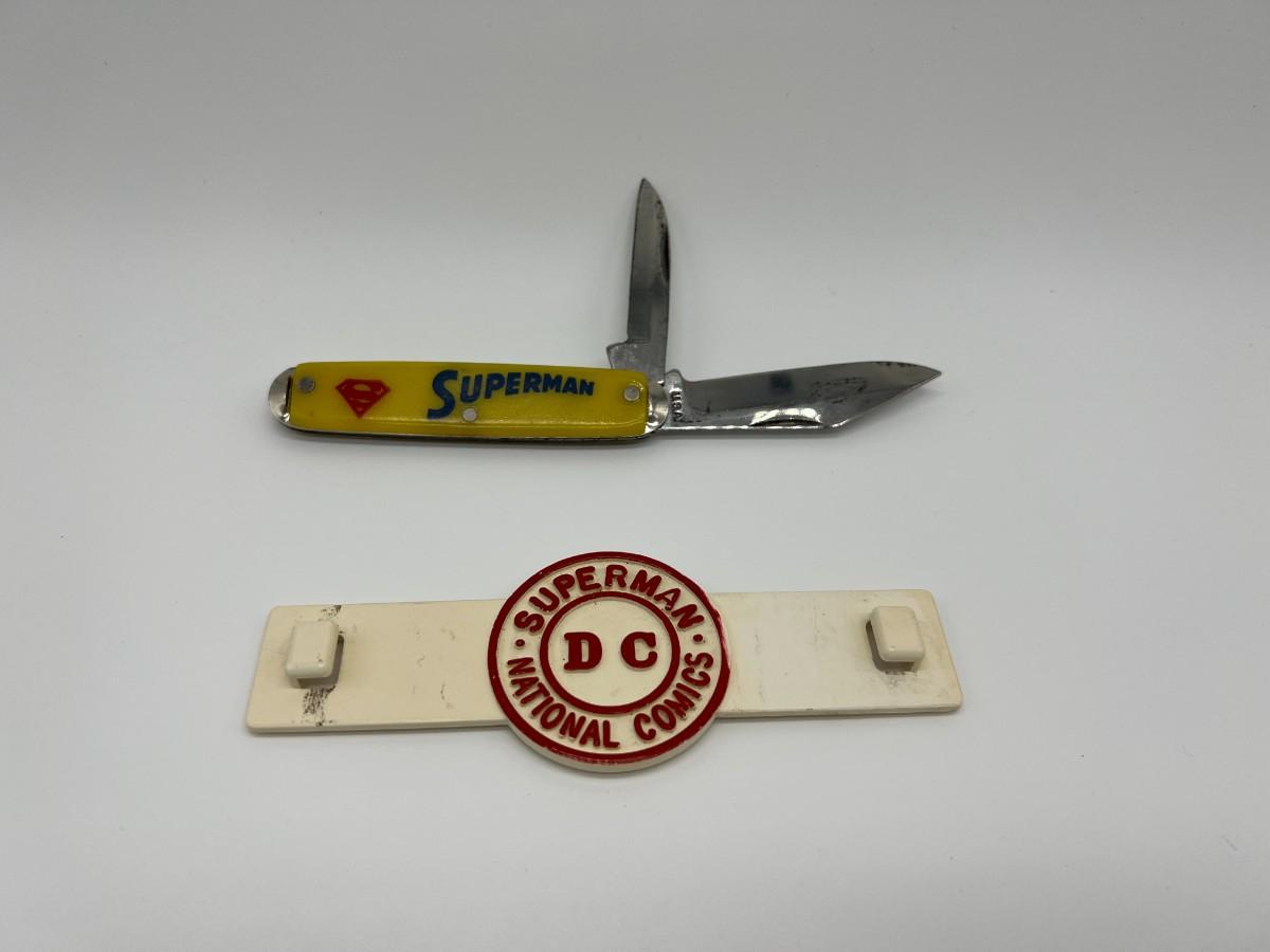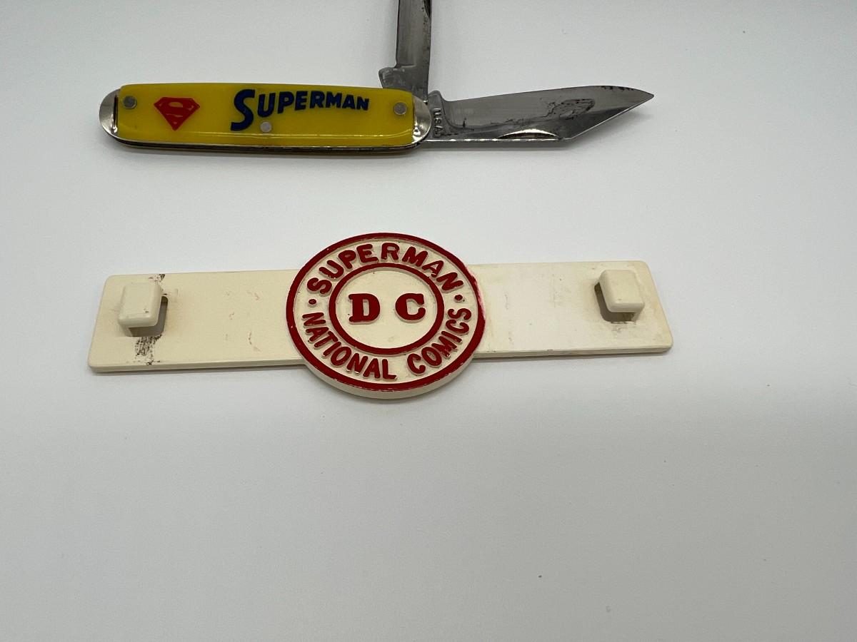 Lot of 2 Vintage Superman Collectibles 1960s Comic Book Rack Attachment (says Superman National Comics DC) and Superman Pocket Knife in yellow color with red and blue designs. Conditions as shown.