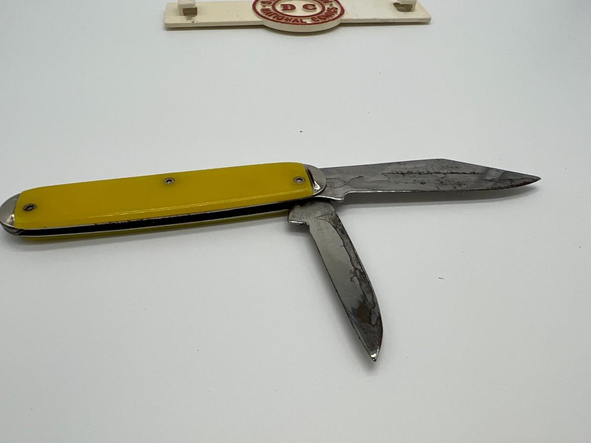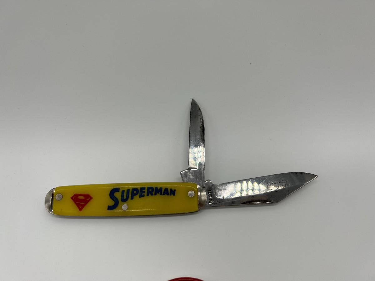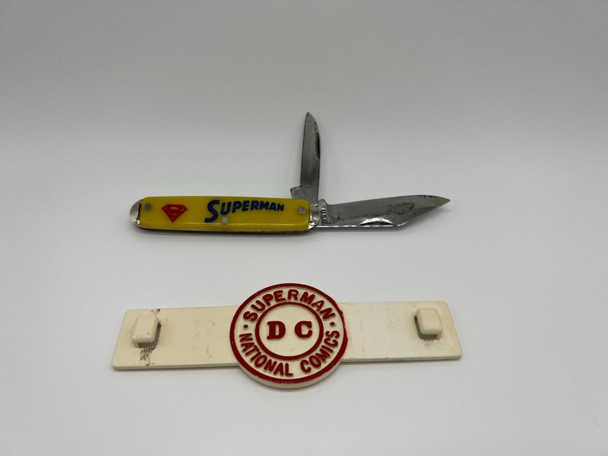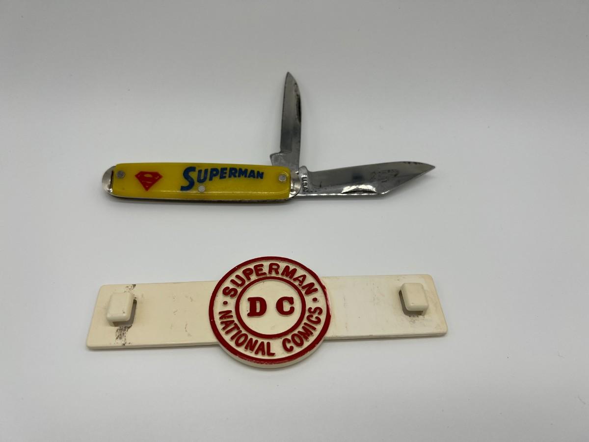 Lot of 2 Vintage Superman Collectibles 1960s Comic Book Rack Attachment (says Superman National Comics DC) and Superman Pocket Knife in yellow color with red and blue designs. Conditions as shown.