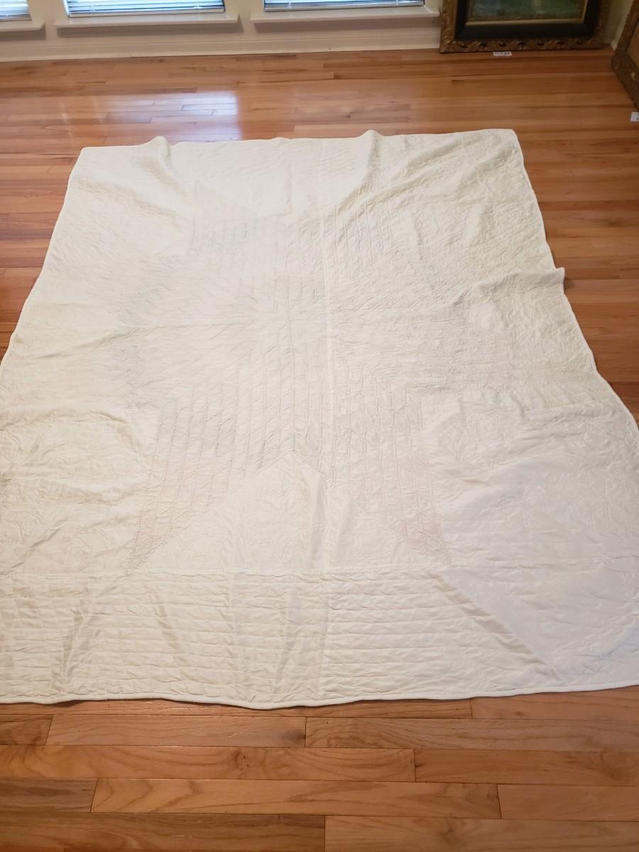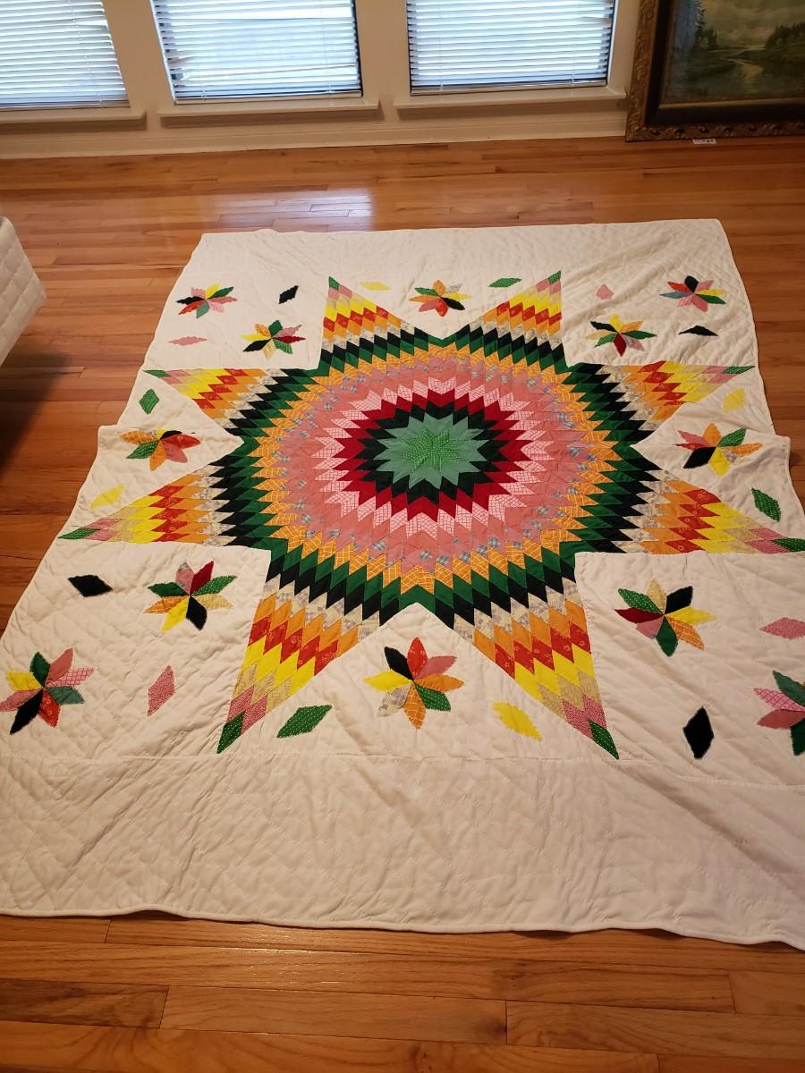 LOT OF 2 Vintage Texas Lone Star quilts with floating applique flowers. Hand pieced & hand quilted on polyester fabric with a satin backing. Twin size. Made in 1953. Very good condition. 72 x 91 & 70 x 93.