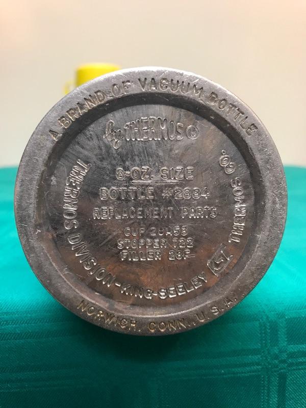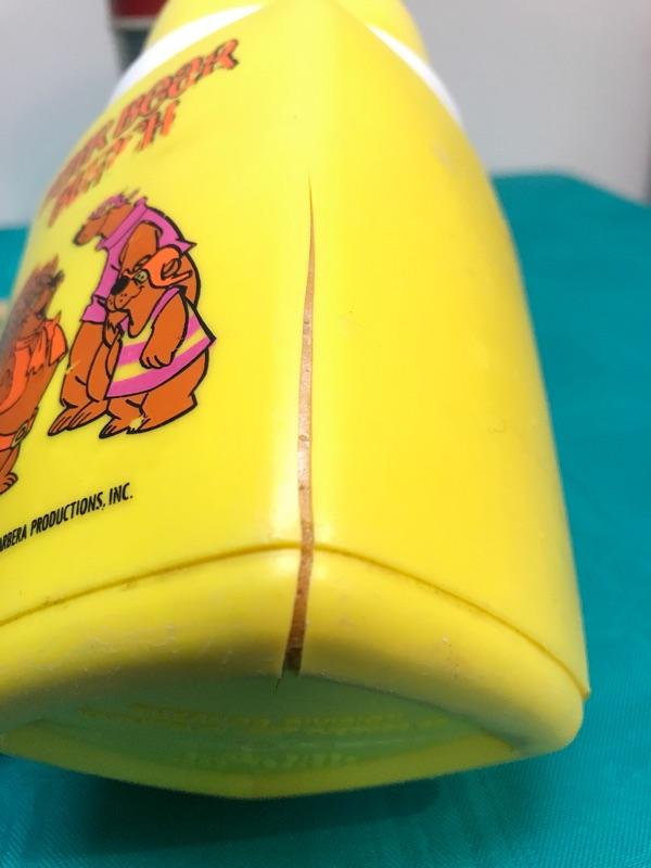 Two thermos branded thermoses the yellow one’s a promotional item for Hanna-Barbera“˜s hair bear bunch, and the red one has an aluminum body. The yellow one is cracked along the body near the 5 o’clock position.