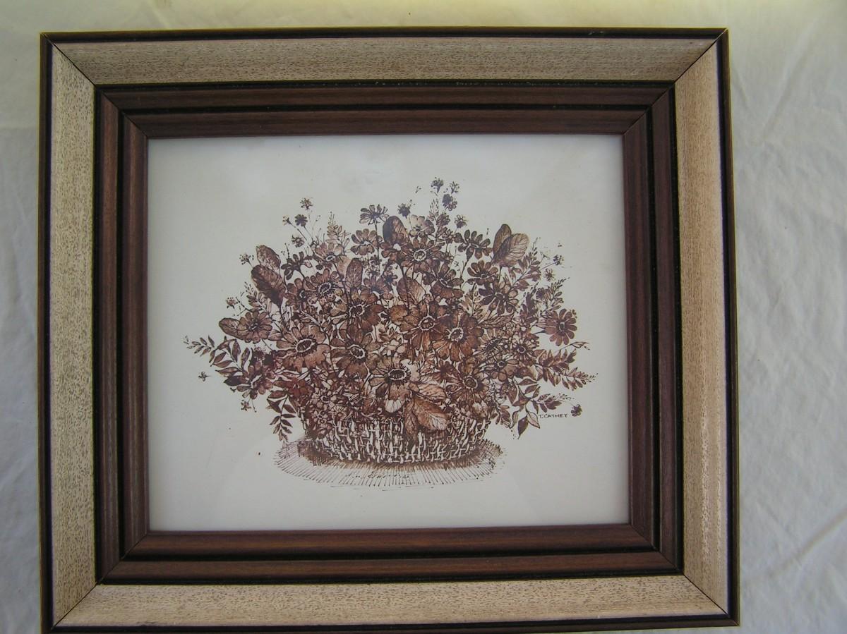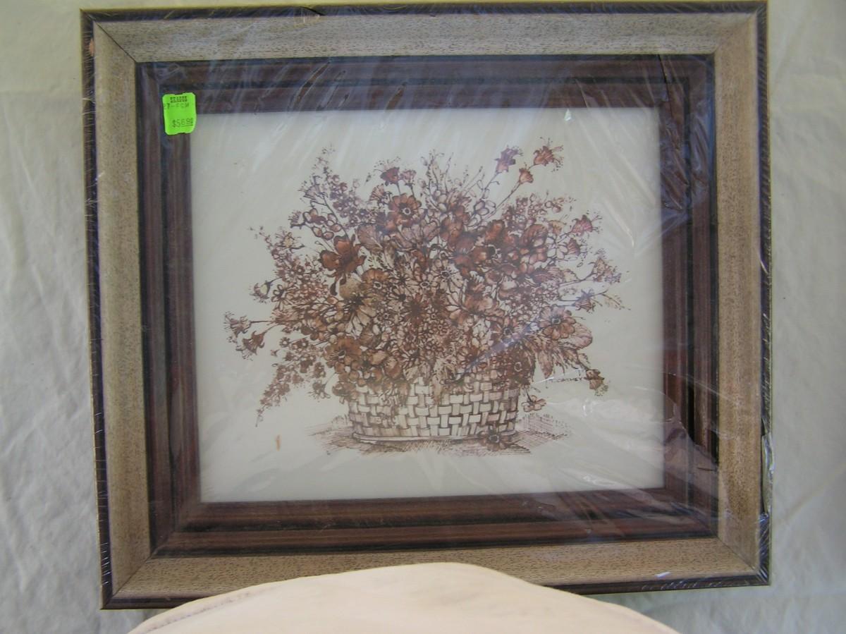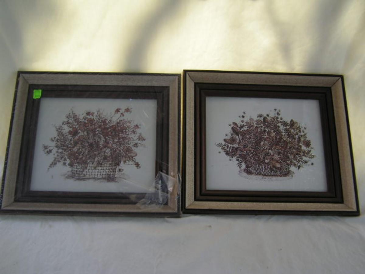 Lot of 2 wall decor, monotone, flower baskets. About 14"x16" including frame. One still in wrapper.