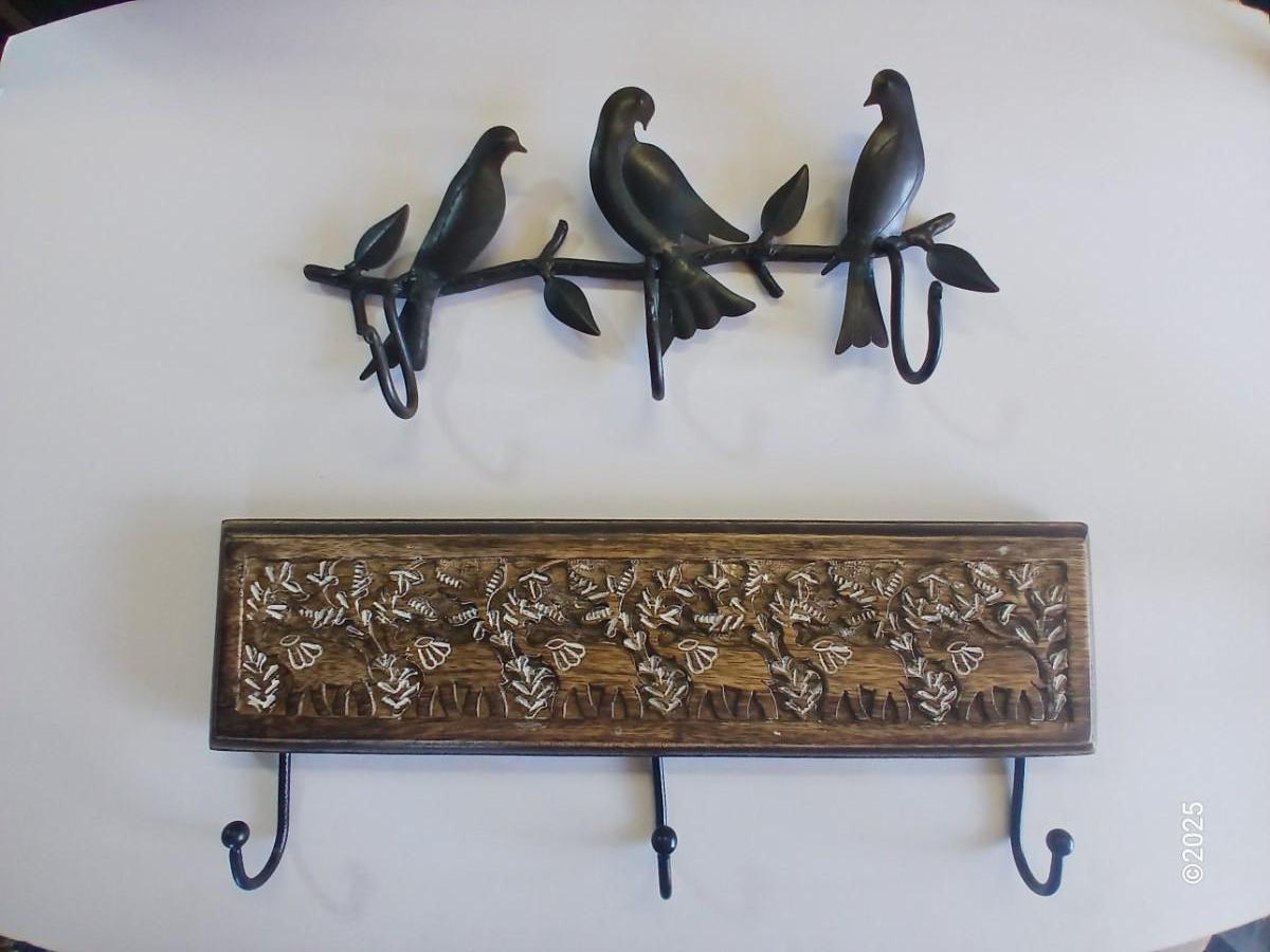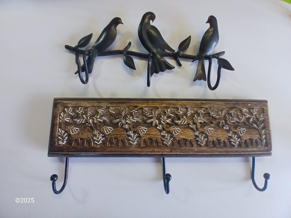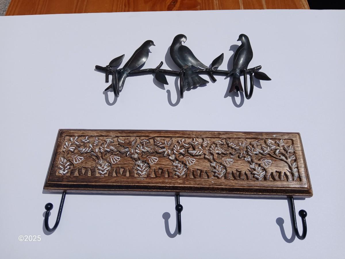 Lot of 2 Wall Hook Racks – Bird Motif & Carved Wood Floral Design