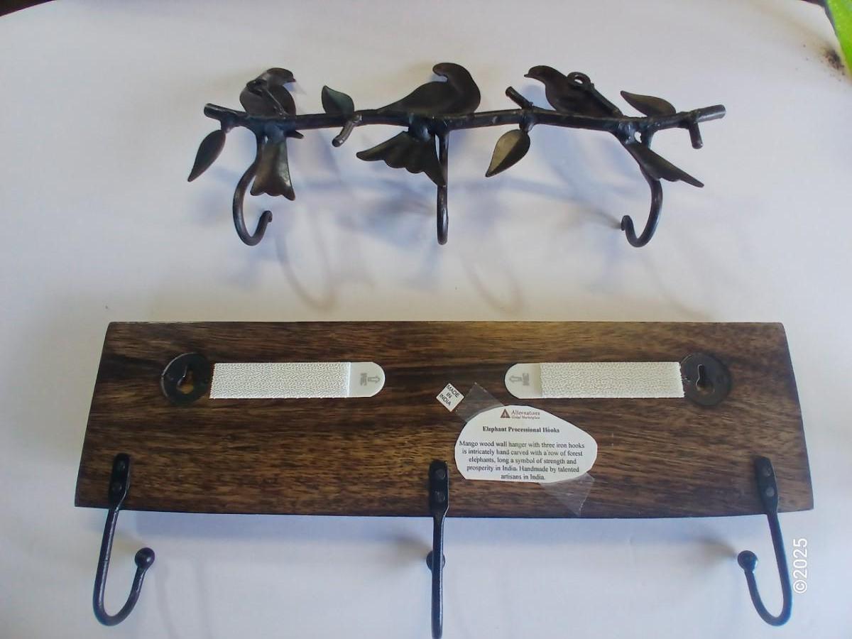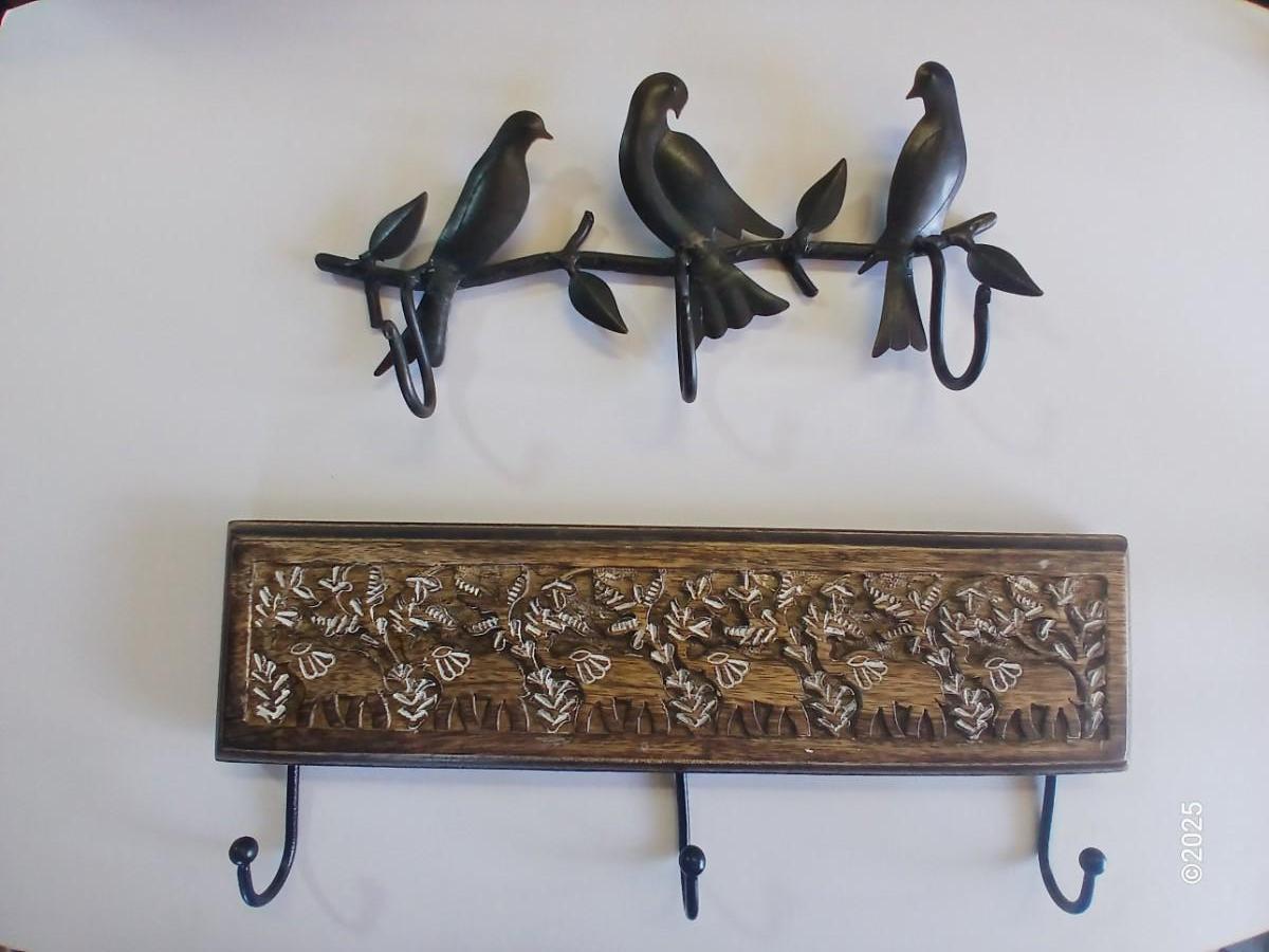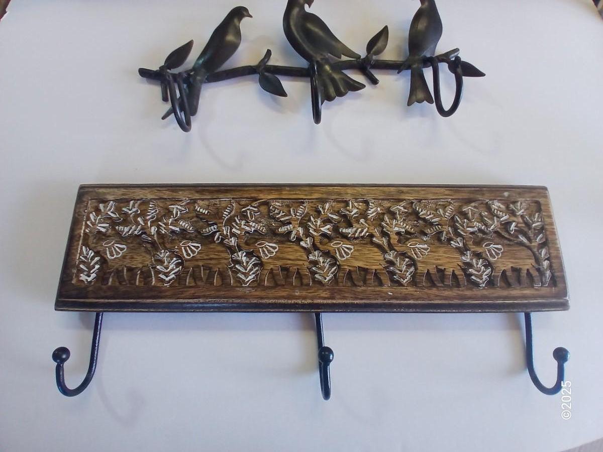 Lot of 2 Wall Hook Racks – Bird Motif & Carved Wood Floral Design