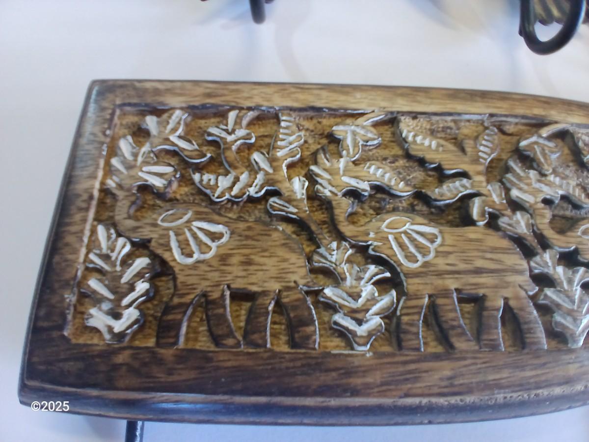 Detailed hand-carved floral and leaf design with elephants