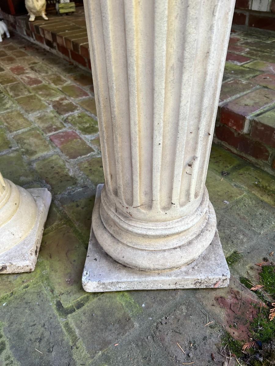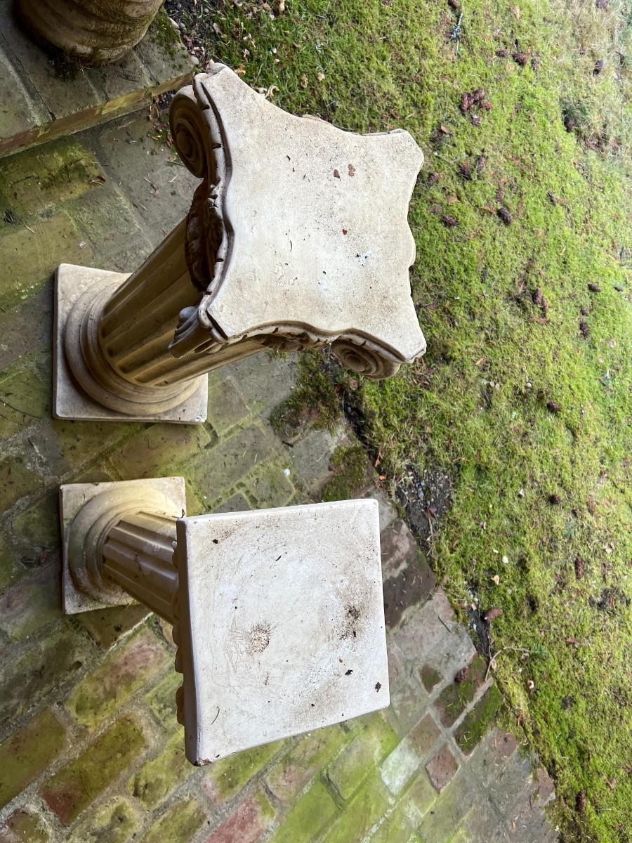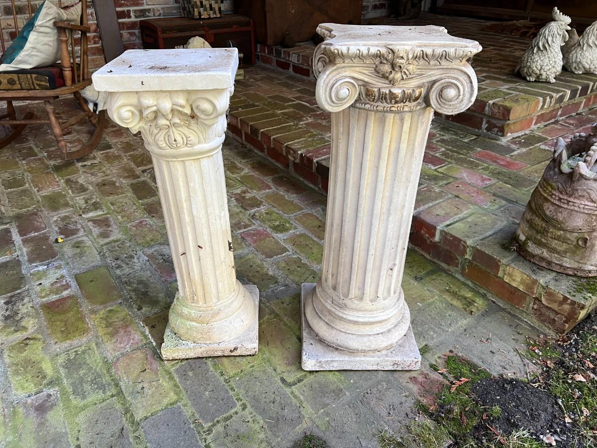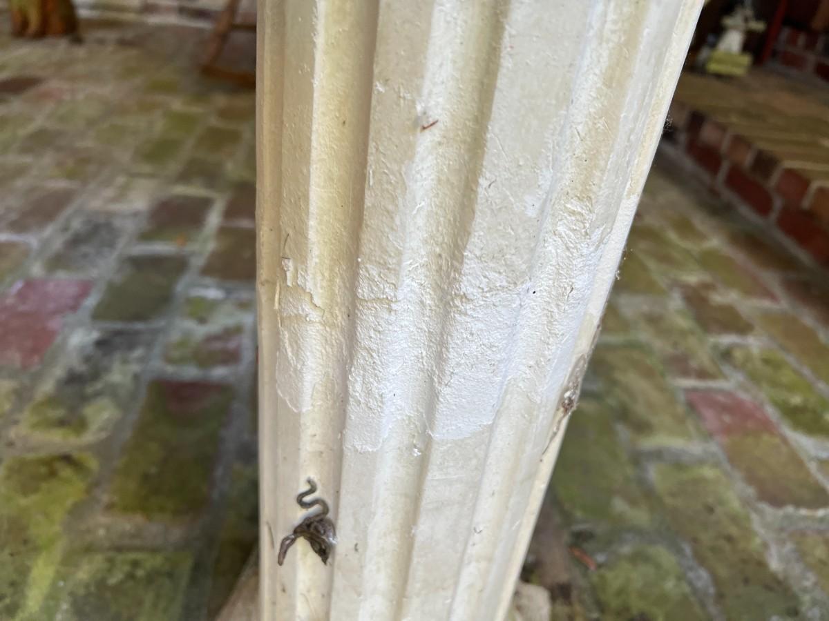 Great lot of two white pillars for your yard or patio space! Or you can clean them up for a lovely indoor plant stand. Add a touch of classic elegance to any space. In good condition, with signs of wear (as shown in photos).