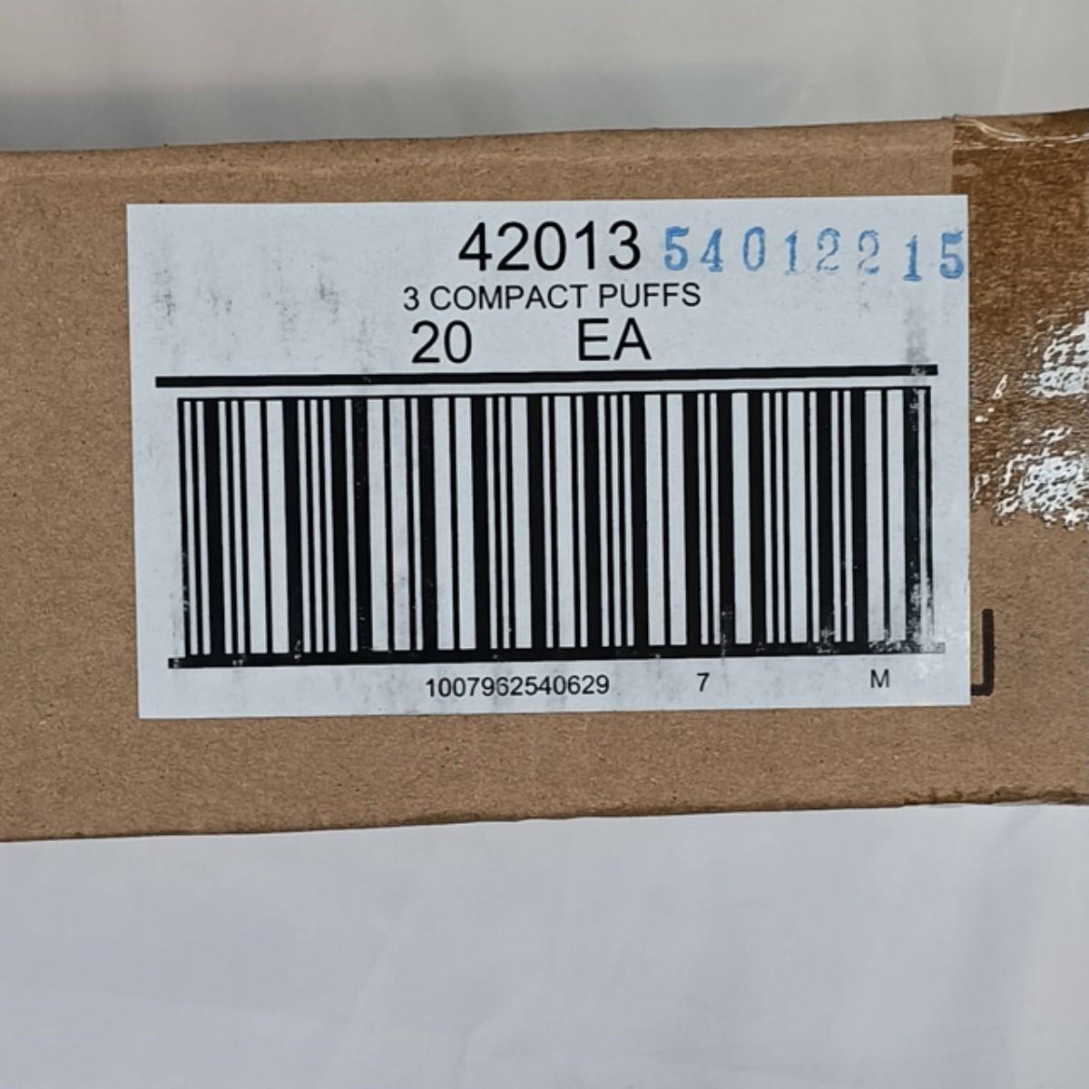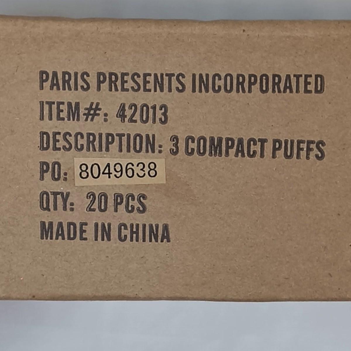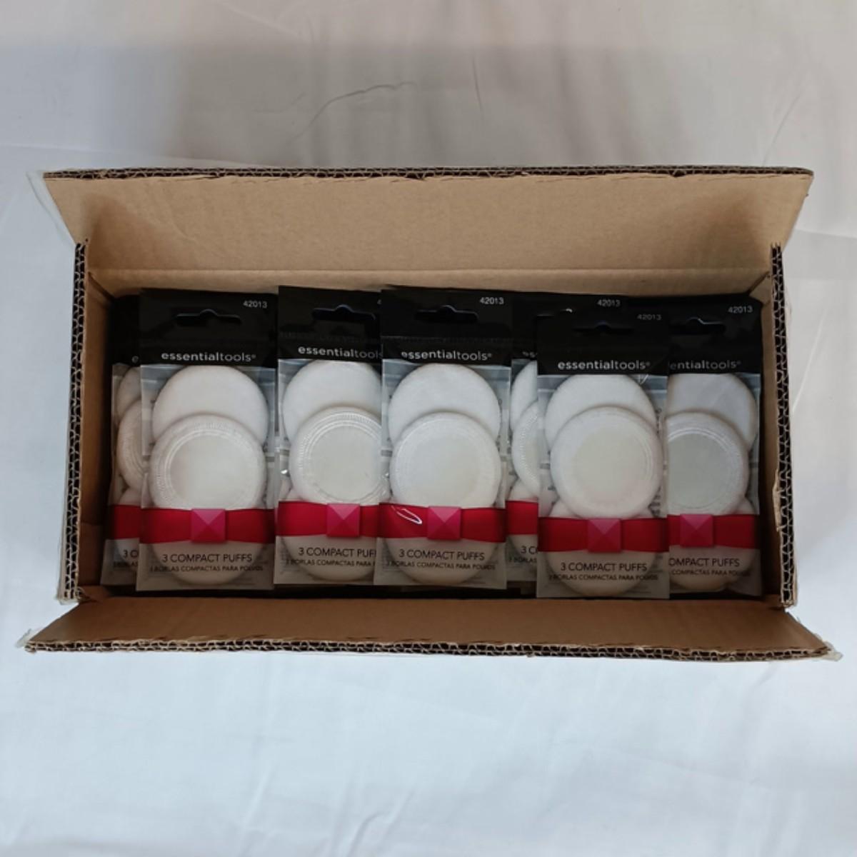 This is a factory sealed box of 20 individual factory sealed packages of compact powder puffs. Each sealed retail package includes 3 powder puffs. This lot includes a total of 60 individual powder puffs.