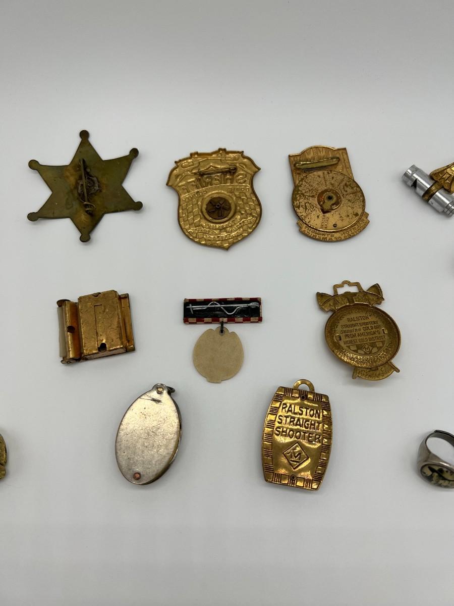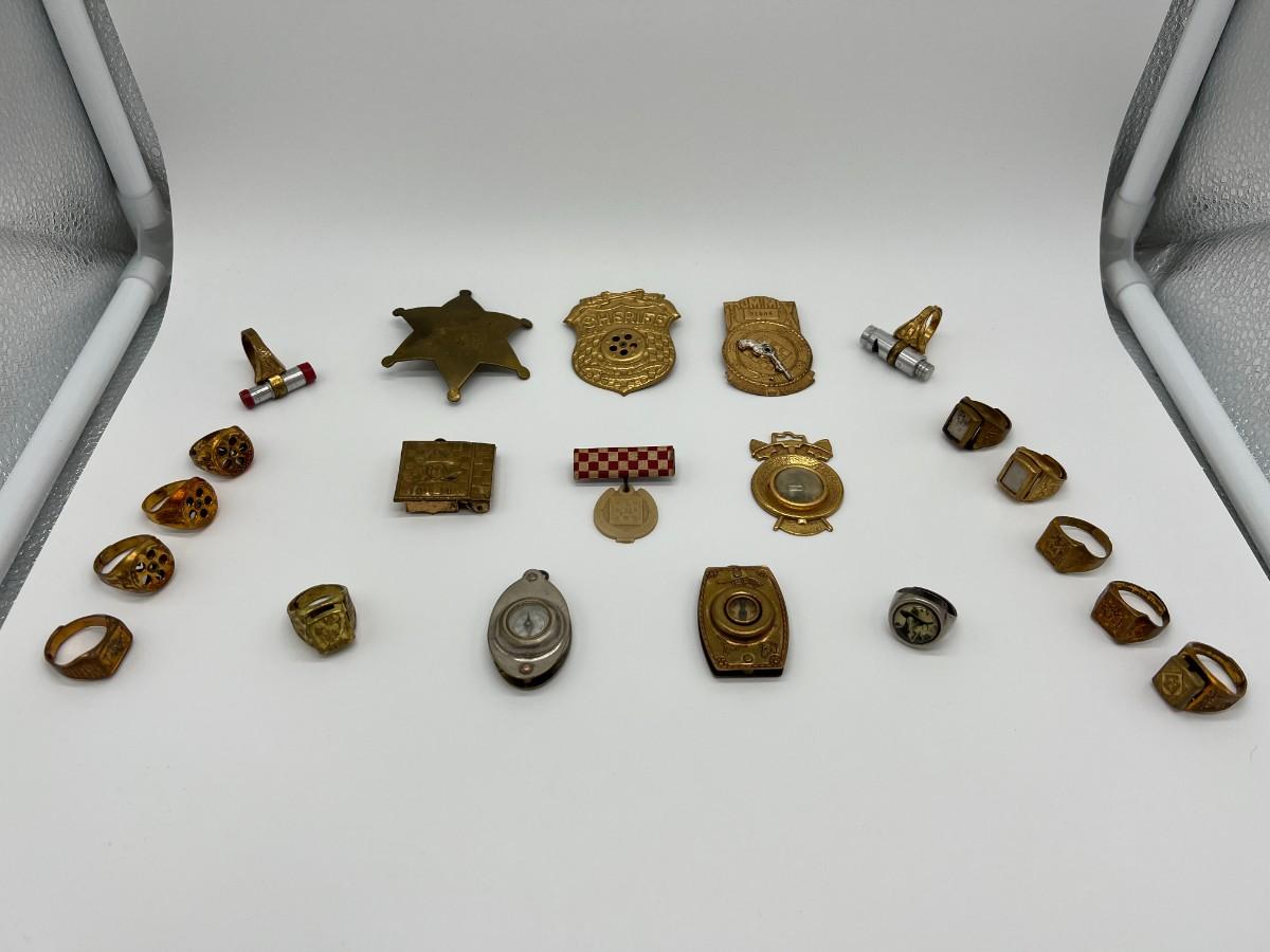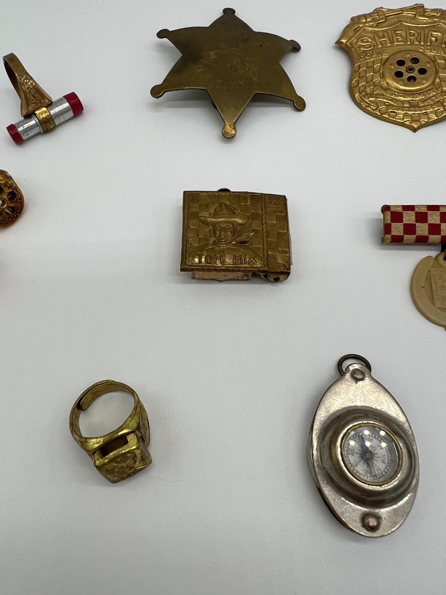 Lot of 21 Tom Mix Rings Badges Pins and Pendants from 1940s and 1950s