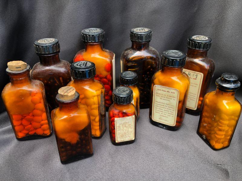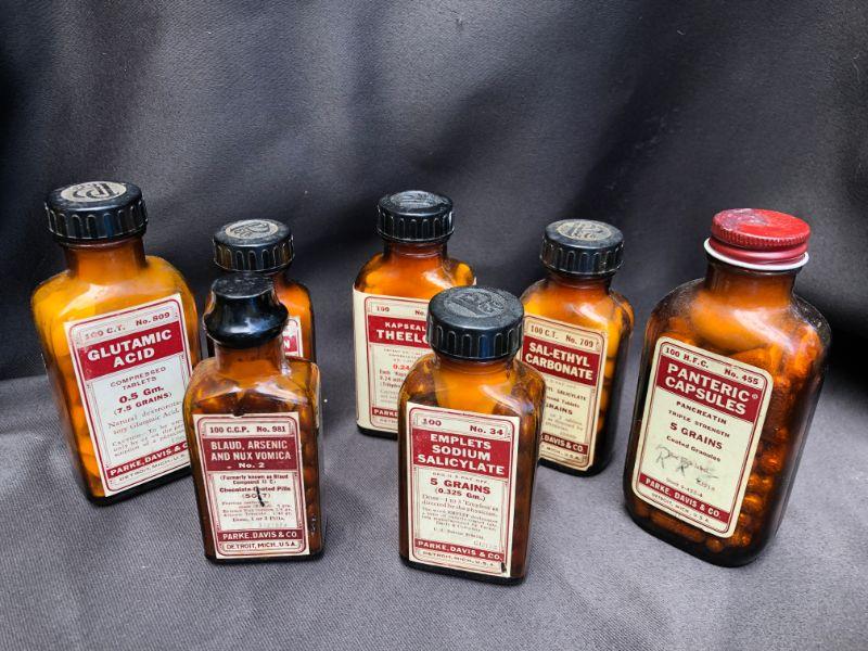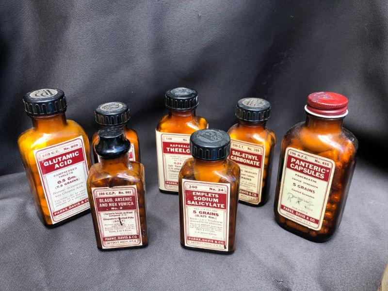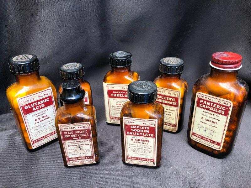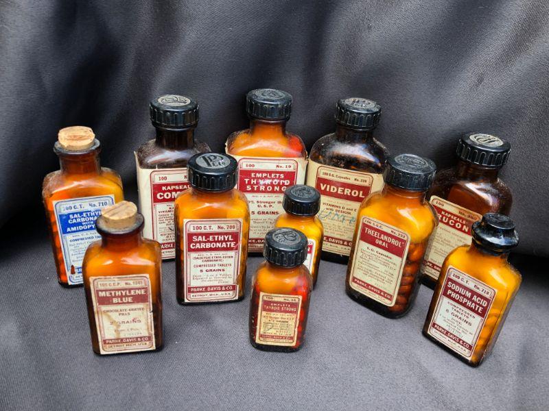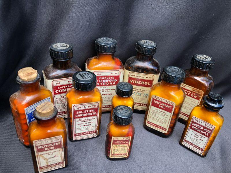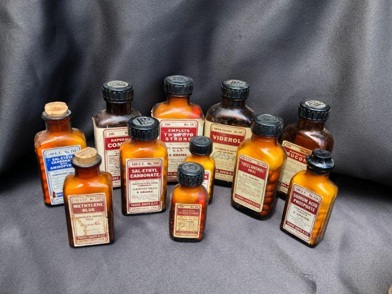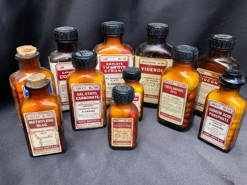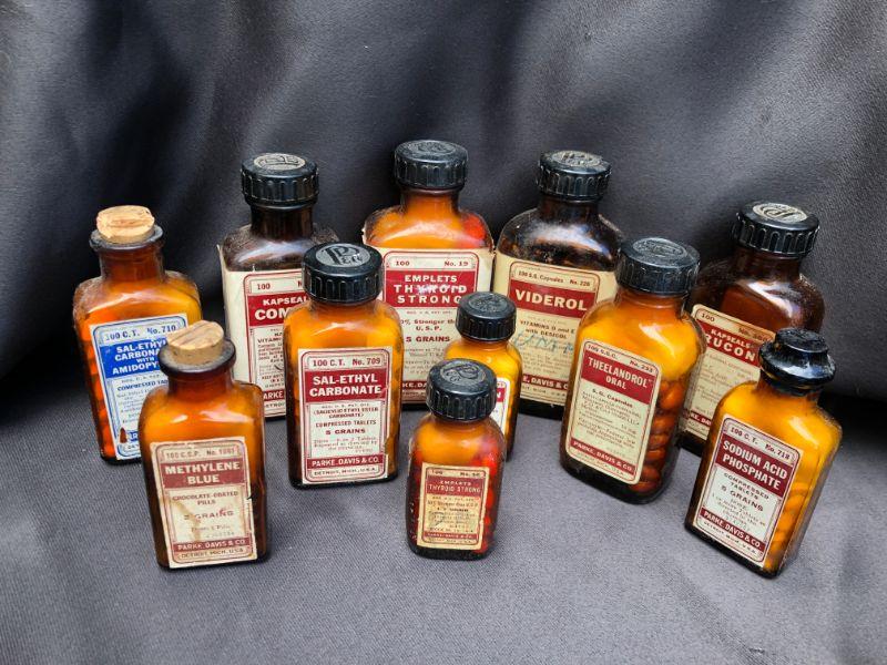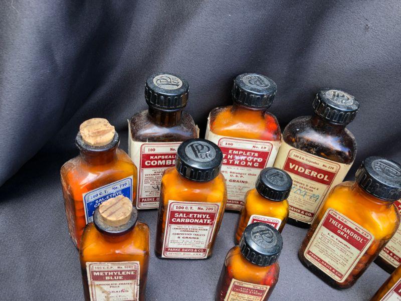 Lot of 21 Vintage Bottles of Parke, Davis& Co Vintage Pharmaceuticals. Includes, Viderol, Glutamic Acid, Emplets (2) Thyroid Strong, Micapon, Panteric Capsules,(2) Sodium Salicylate, (2) Sal-Ethyl Carbonate, Kapseals Theelol, (1) Blaud, Arsenic And Nux Vomica, Serfin, Rucon, Methylene Blue, Theelandrol, Compex, Sodium Acid Phosphate, Sal-Ethul Carbonate. NOT FOR USE OR CONSUMPTION