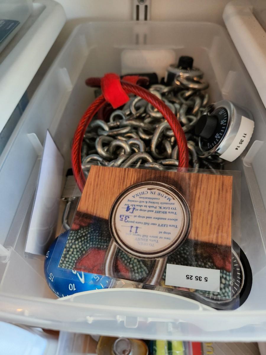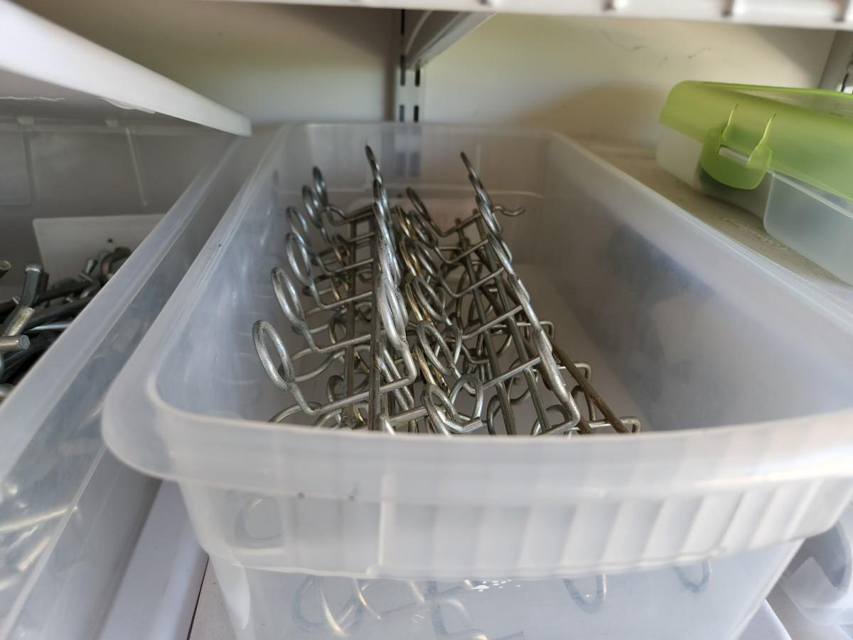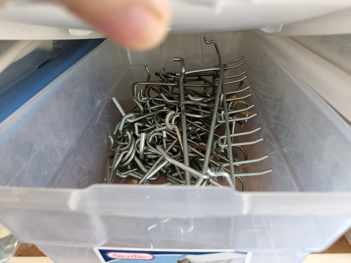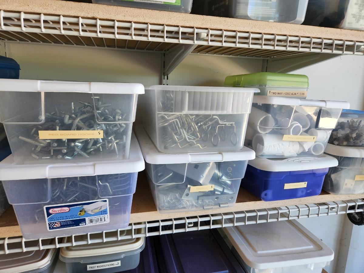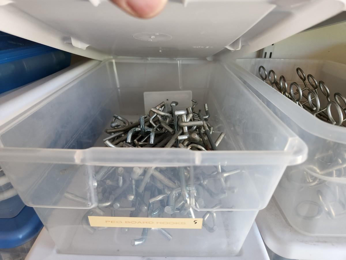 Peg Board Hooks, Power Cords, Chains and Combo Locks, Picture hooks, Steak Knives, Fittings, and More. See labels on Containers.