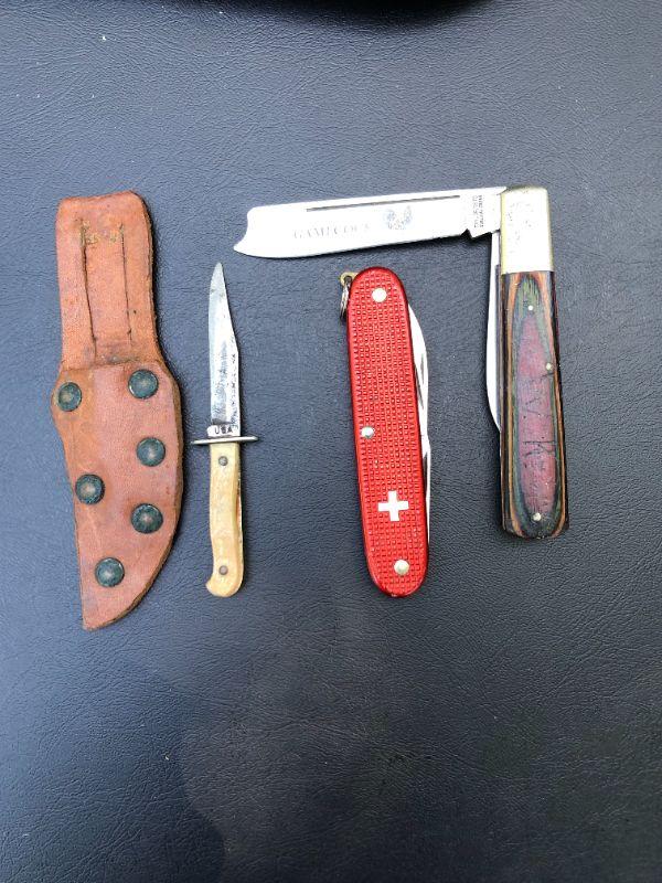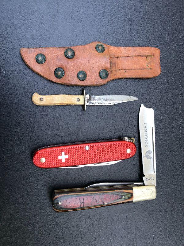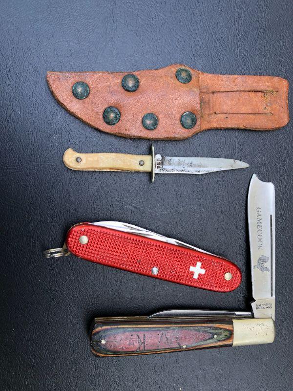 Small Carving Knife Including with Leather Sheath. Blade marked USA. 2 Jack knives One Red Textured Case with No Brand and one Wood Case Taylor Seto Surgical Knife "Game Cock"