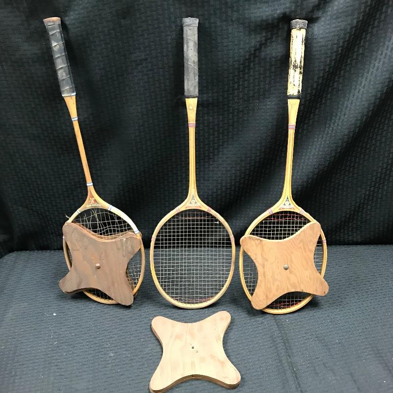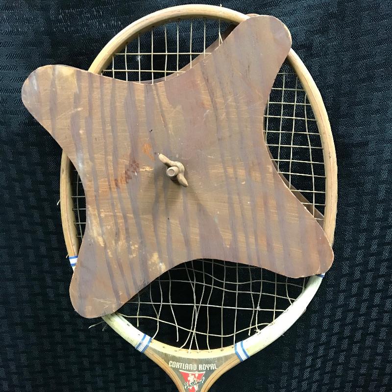 Up for auction are three vintage 1940s tennis racket two of them have these wooden dividers held in place by a wing nut threaded to a bolt. Two of them are Spaulding Jubilee models, and one is a Cortland Royal model. All three are in slightly rough shape; see pictures.