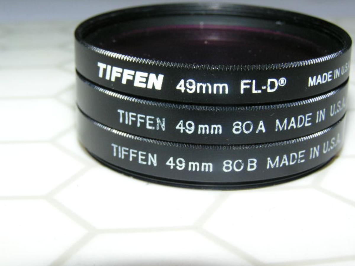 Lot of 3: 49mm Tiffen brand camera lens filters, 1 FL-D florescent light correction, 1 80A blue correction, 1 80B blue correction. Clean scratch free glass in excellent condition.