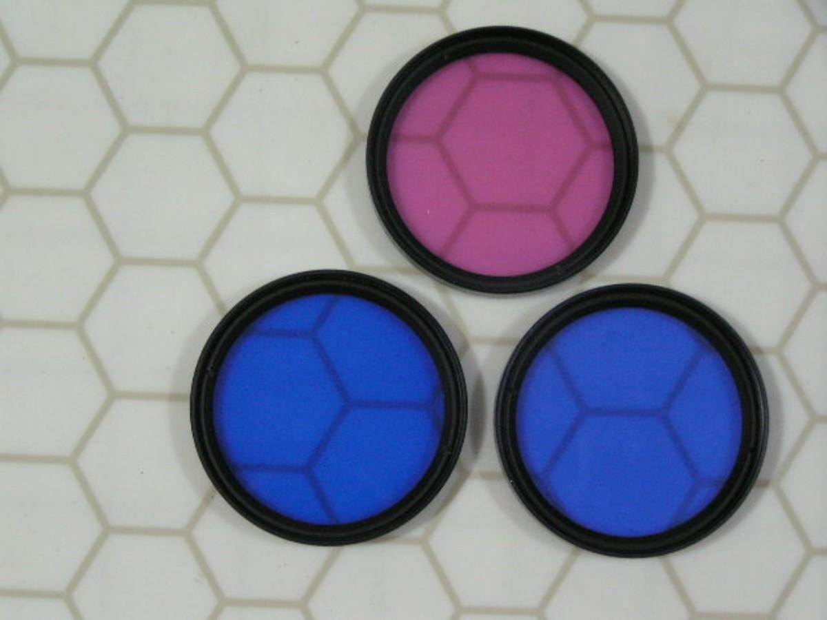 Lot of 3: 49mm Tiffen brand camera lens filters, 1 FL-D florescent light correction, 1 80A blue correction, 1 80B blue correction. Clean scratch free glass in excellent condition.