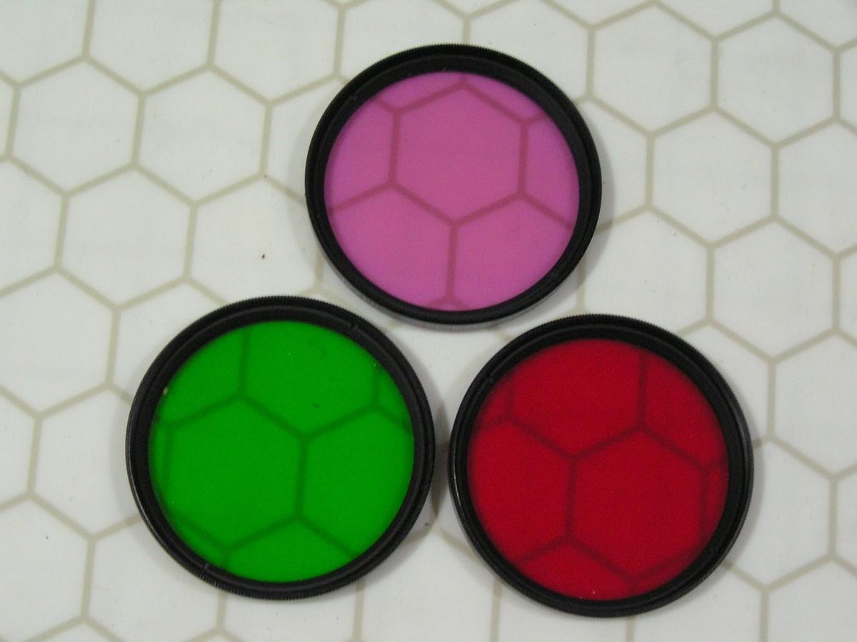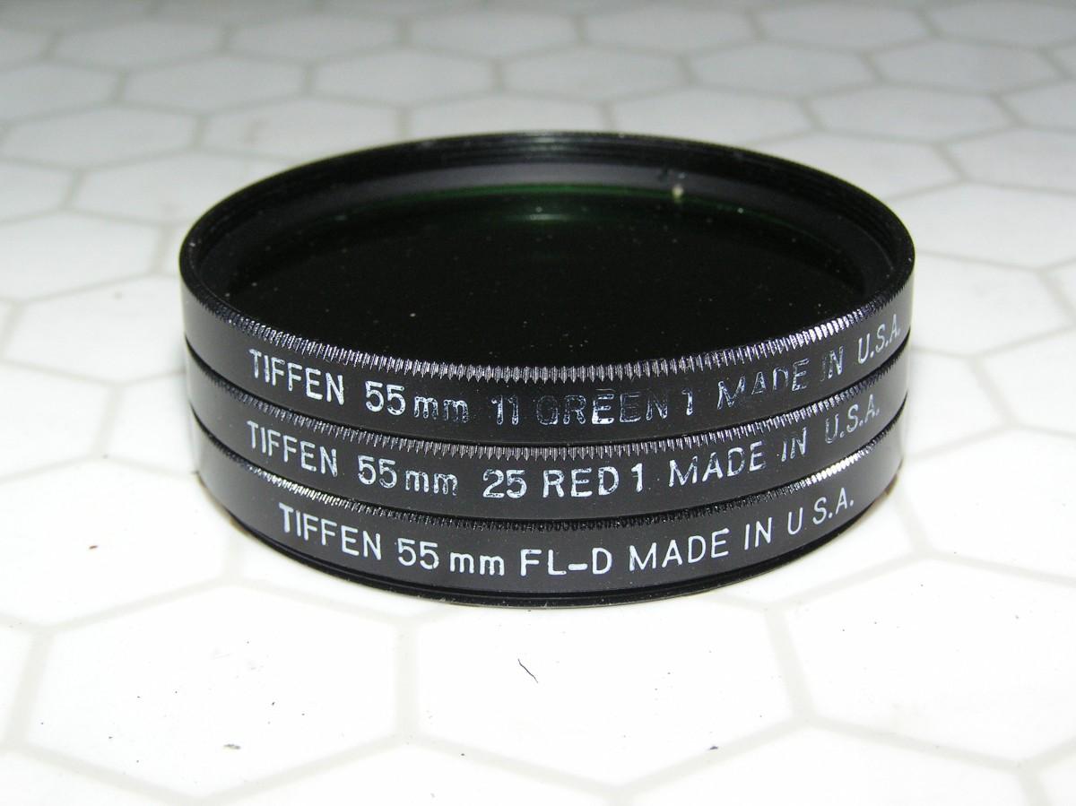 Lot of 3 - 55mm Tiffen photographers correction lens filters: 1 #25 Red(1), 1 #11 Green(1), 1 FL-D. Clean scratch free glass in excellent condition