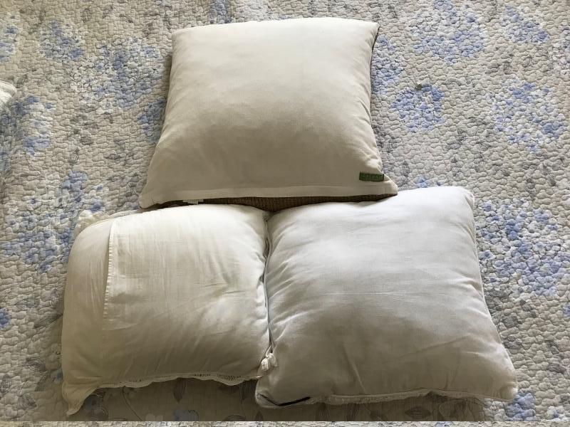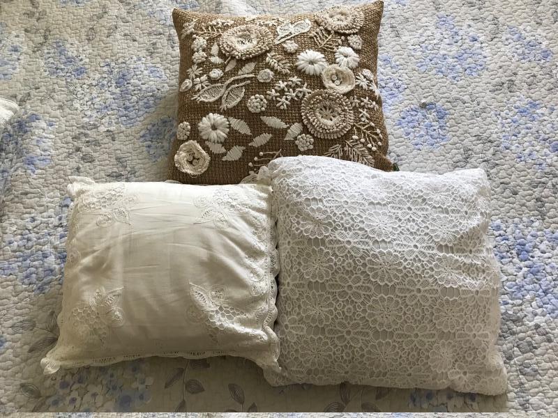 Lot includes one white crochet lace pillow, one white Battenburg lace pillow, and one jute and cotton embroidered pillow. Largest is 20" x 20"H