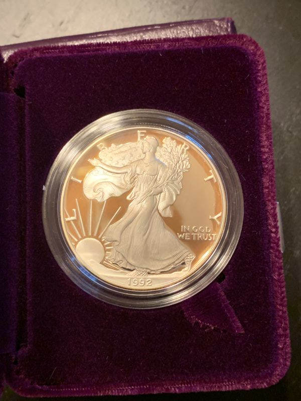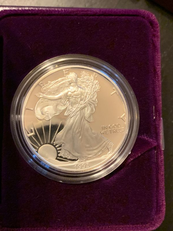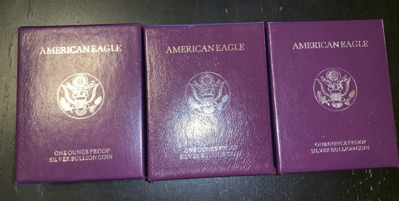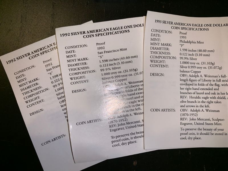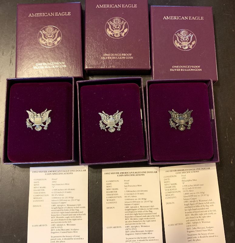 Winning bidder will receive all 3 coins in their boxes, as pictured. Each of the coins is .999 silver! Great lot of silver bullion coins! Two are 1992 San Francisco Mints and one is 1993 Philadelphia Mint. . Priority Shipping is available at the flat fee of $10.00