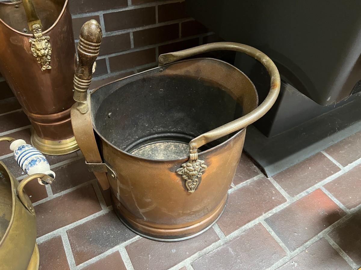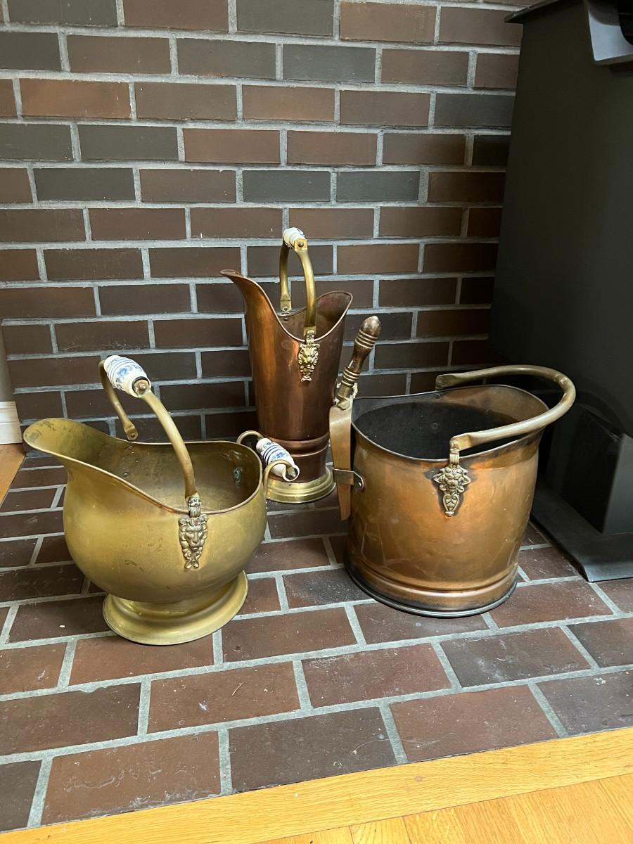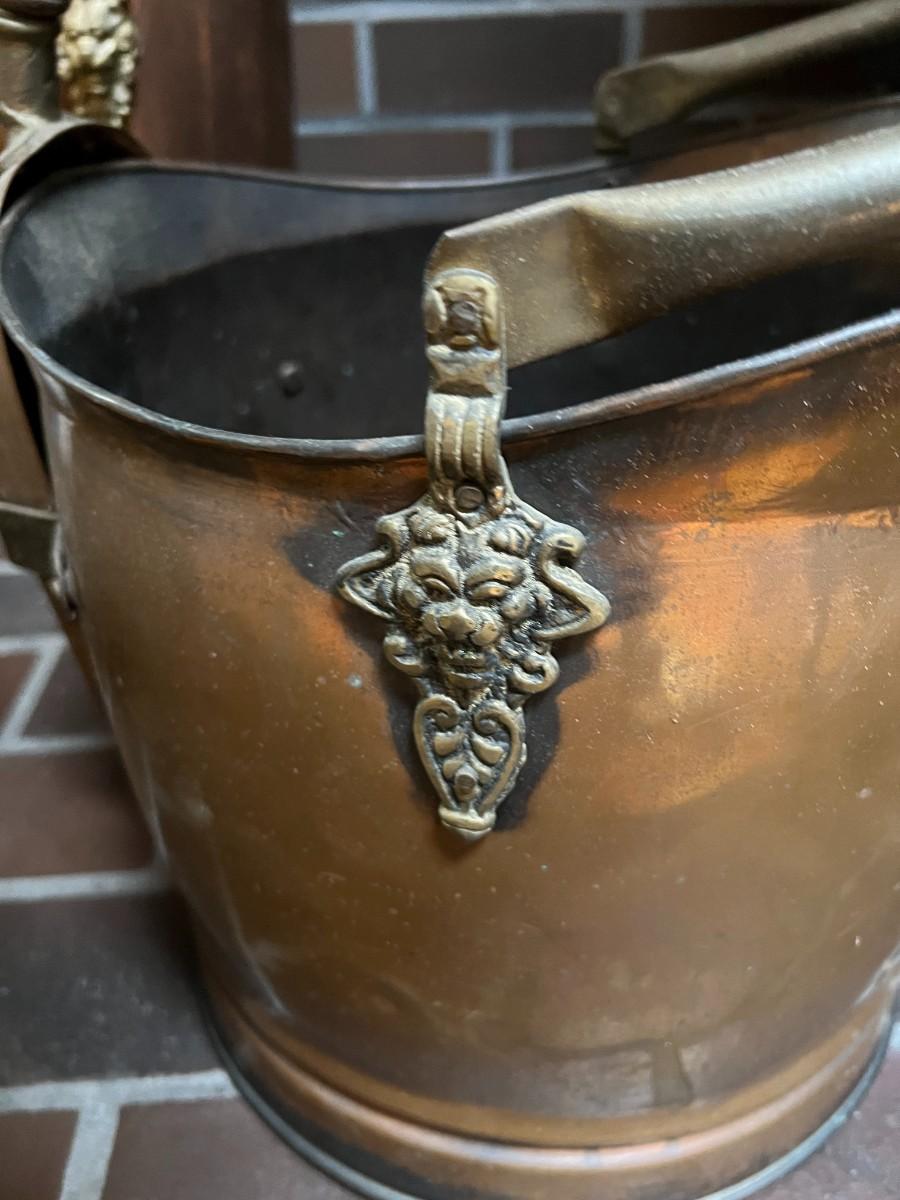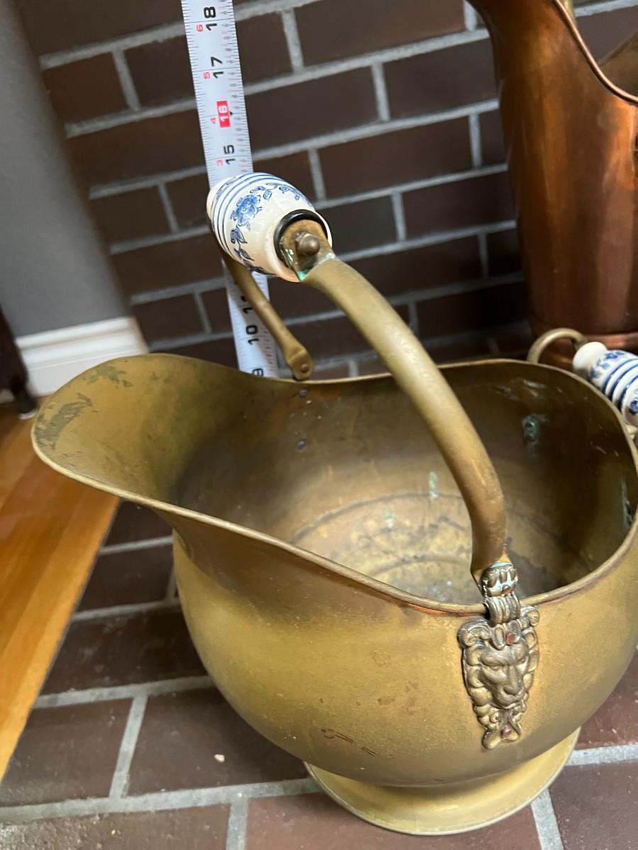 Lot of 3 Antique Copper and Brass Coal Scuttle Buckets, 2 with Porcelain Handles, and 1 with a shovel. All 3 feature a lion head design at the handle base (potentially made in Holland).