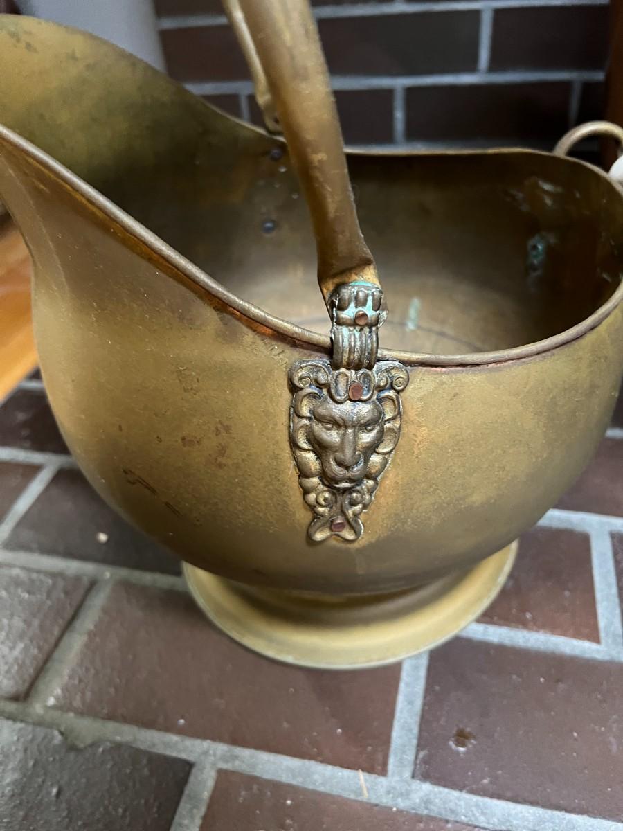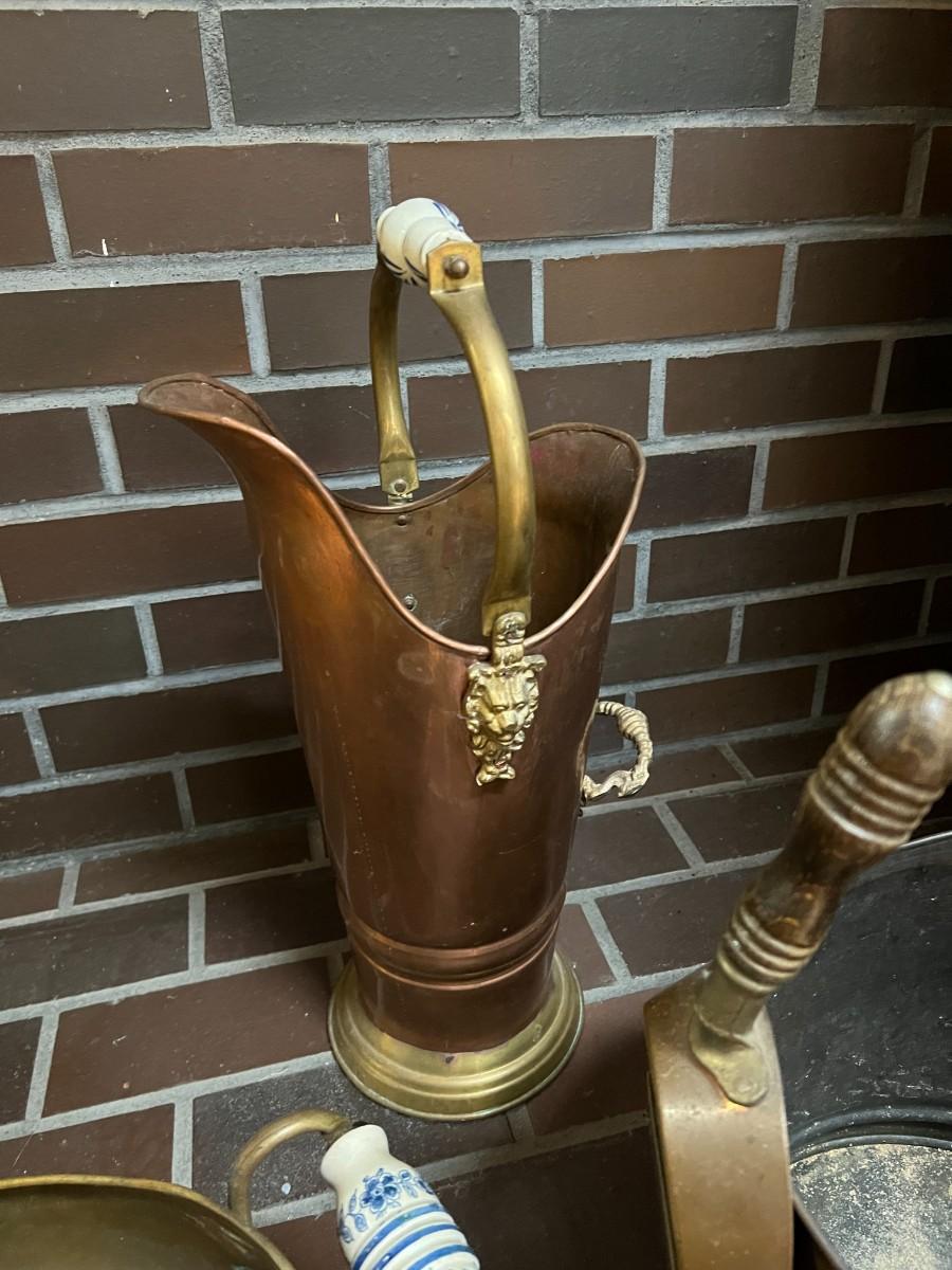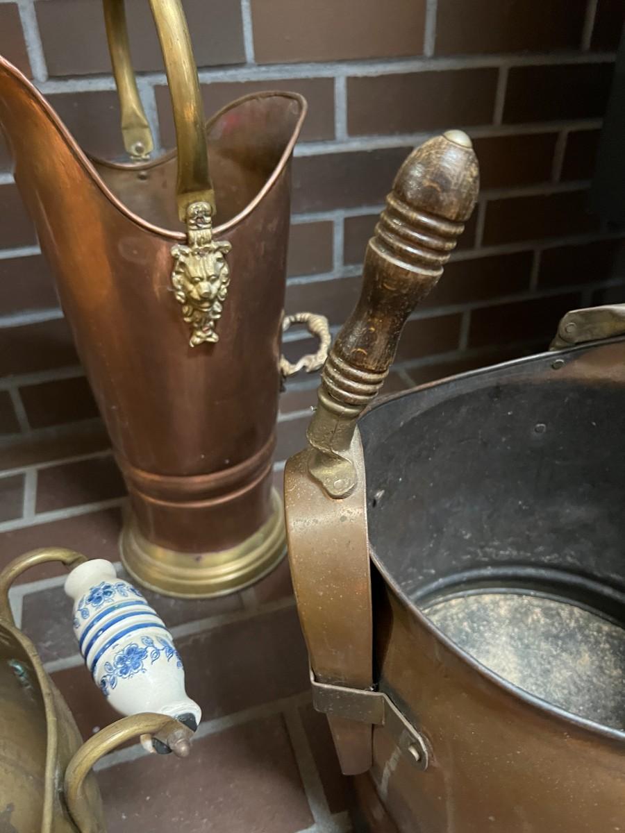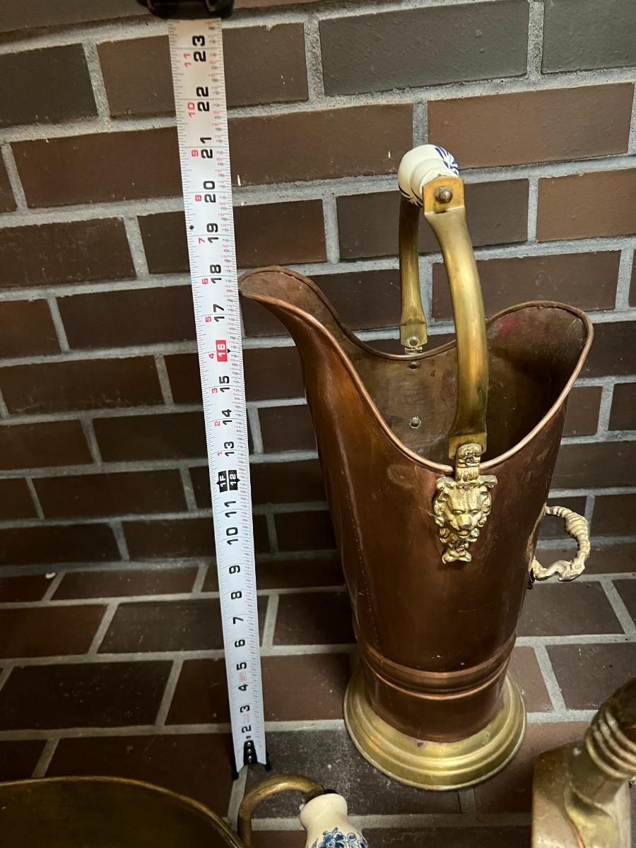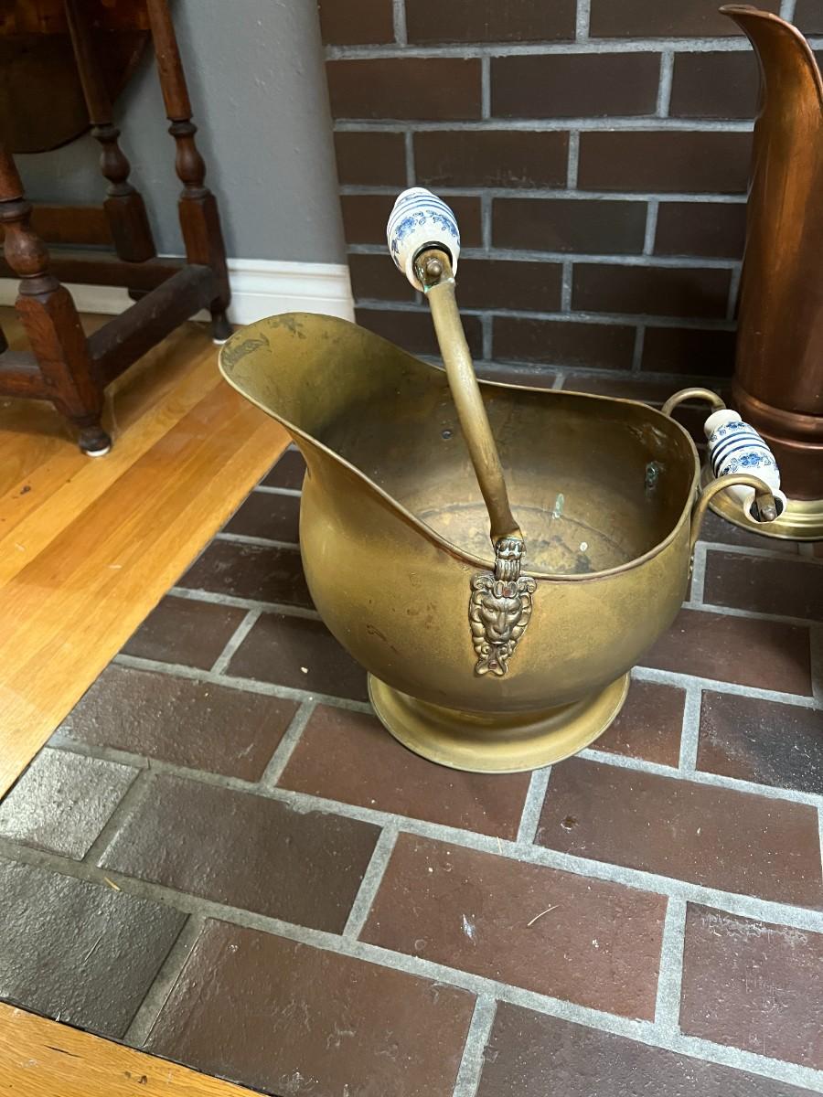 Lot of 3 Antique Copper and Brass Coal Scuttle Buckets, 2 with Porcelain Handles, and 1 with a shovel. All 3 feature a lion head design at the handle base (potentially made in Holland).