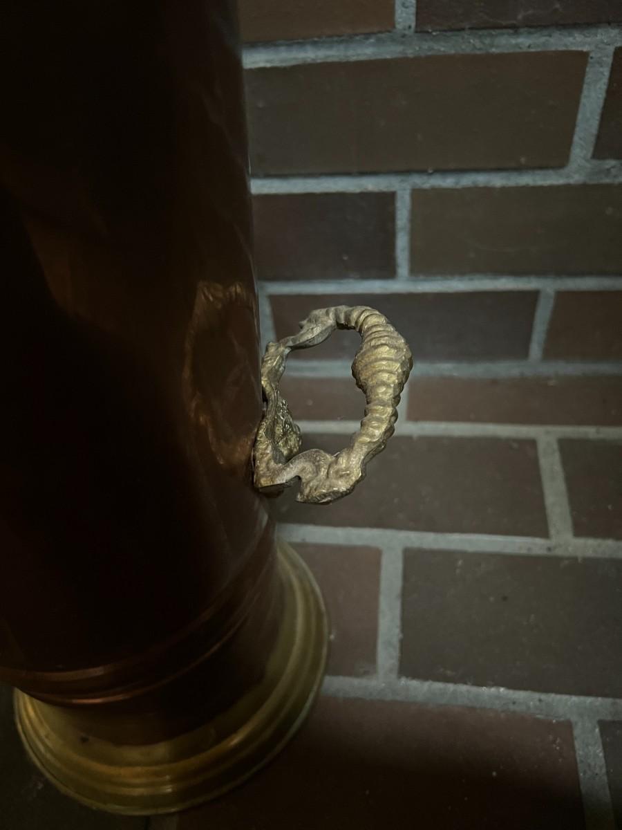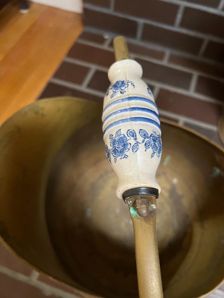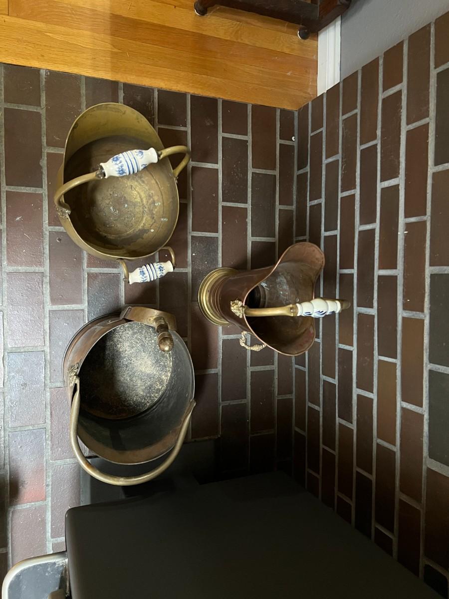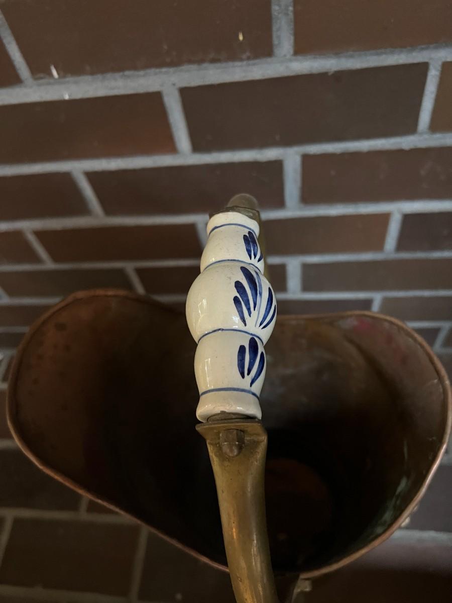 Lot of 3 Antique Copper and Brass Coal Scuttle Buckets, 2 with Porcelain Handles, and 1 with a shovel. All 3 feature a lion head design at the handle base (potentially made in Holland).