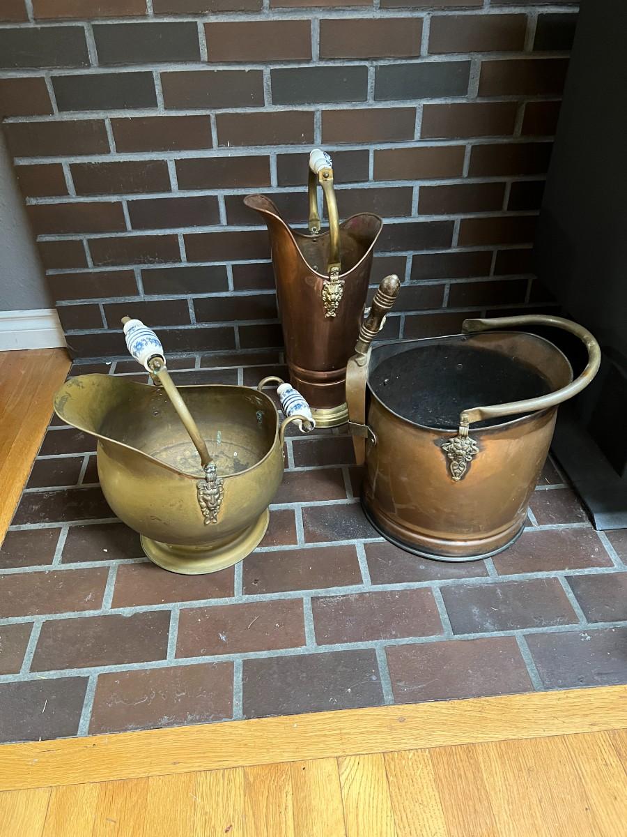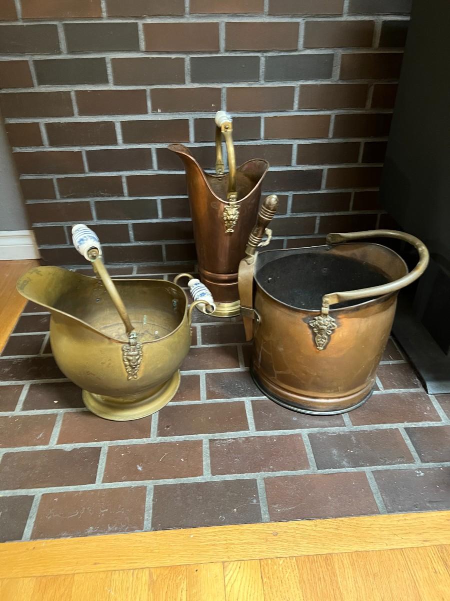 Lot of 3 Antique Copper and Brass Coal Scuttle Buckets with Handles