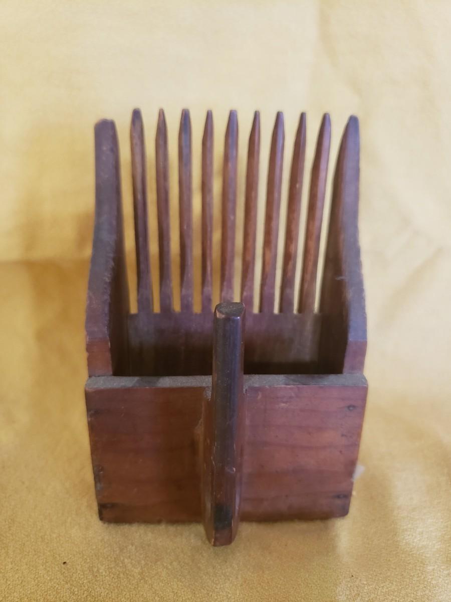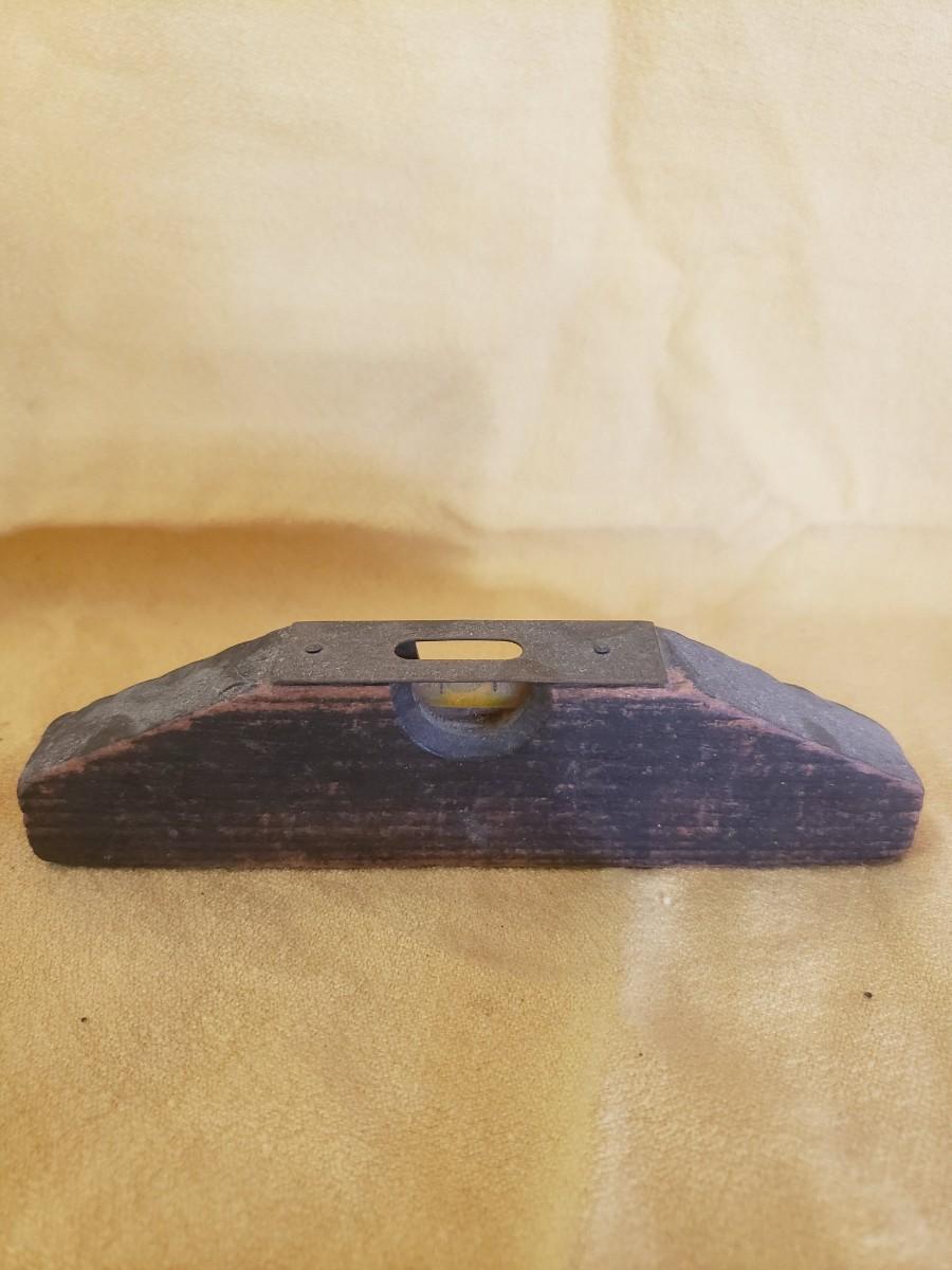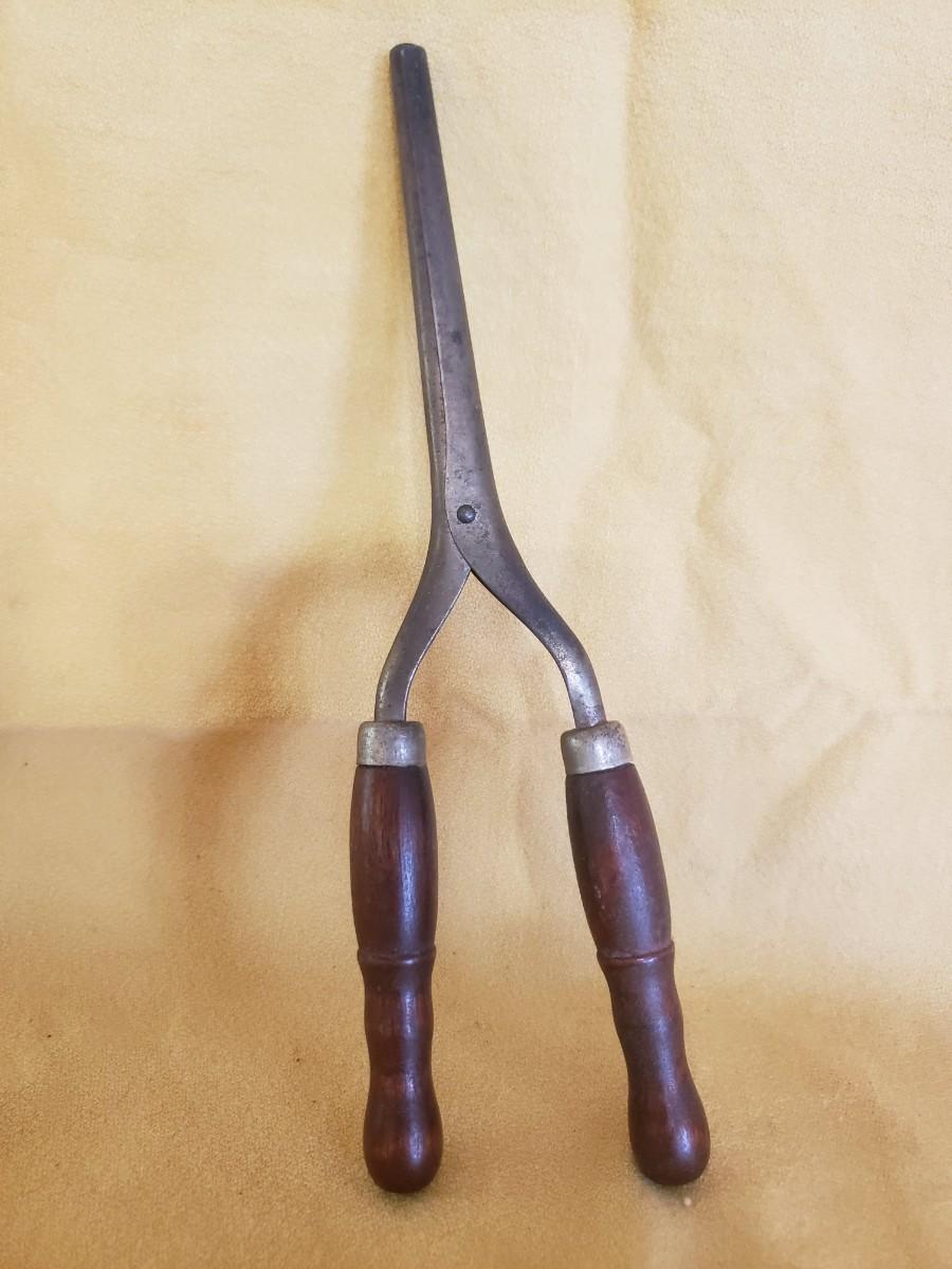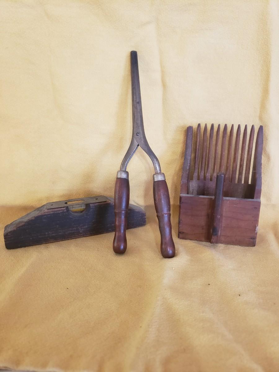 Lot if 3 antique items. Antique curling iron , antique wooden scoop, and antique wooden level.