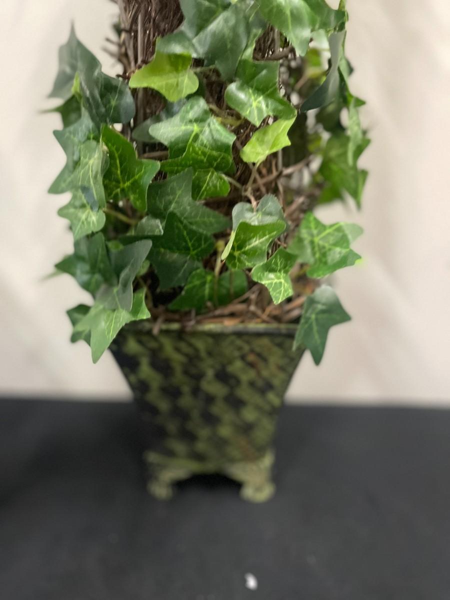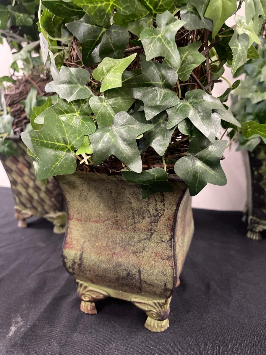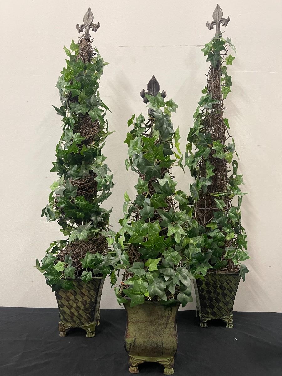 Lot of 3 spiral artificial ivy topiaries in metal planters. Each in excellent condition with fleur de lis finials.