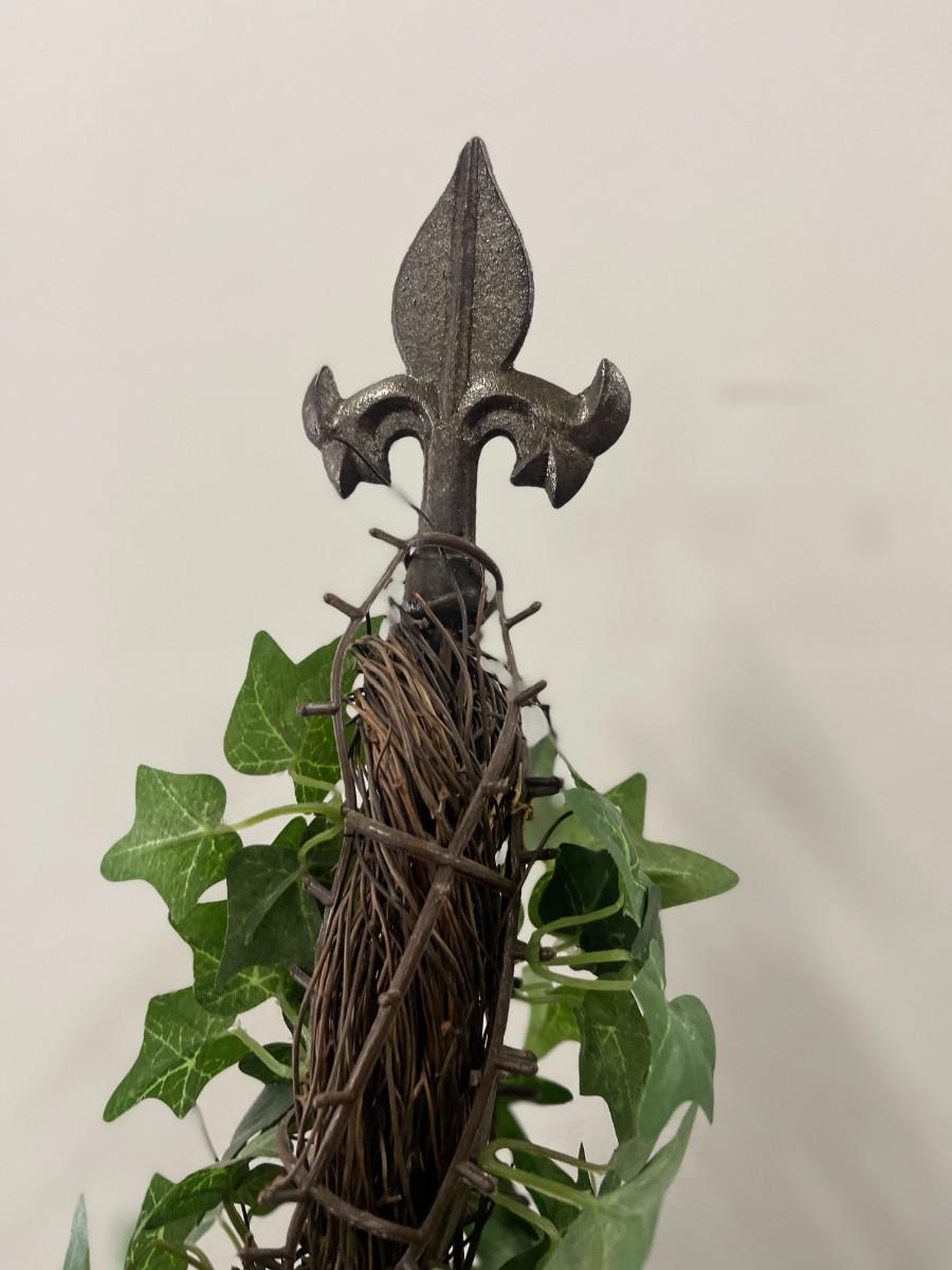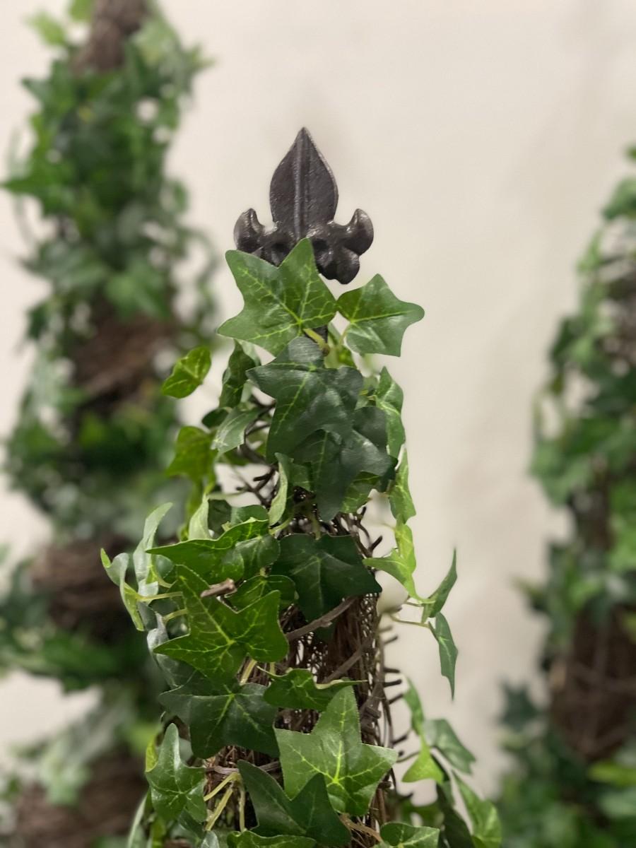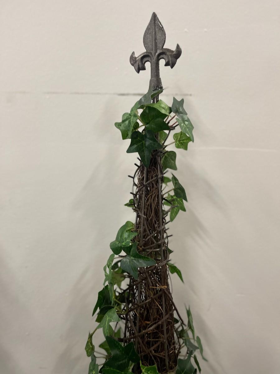 Lot of 3 spiral artificial ivy topiaries in metal planters. Each in excellent condition with fleur de lis finials.