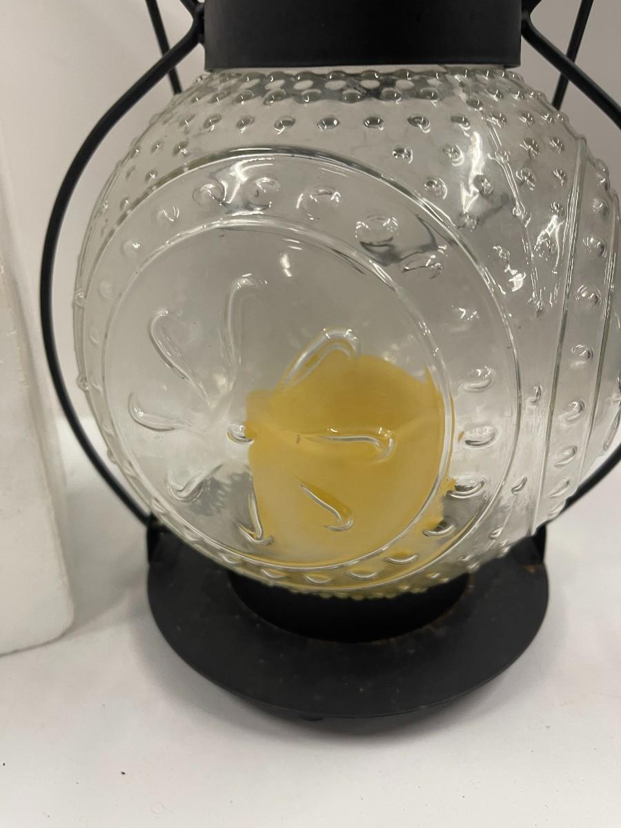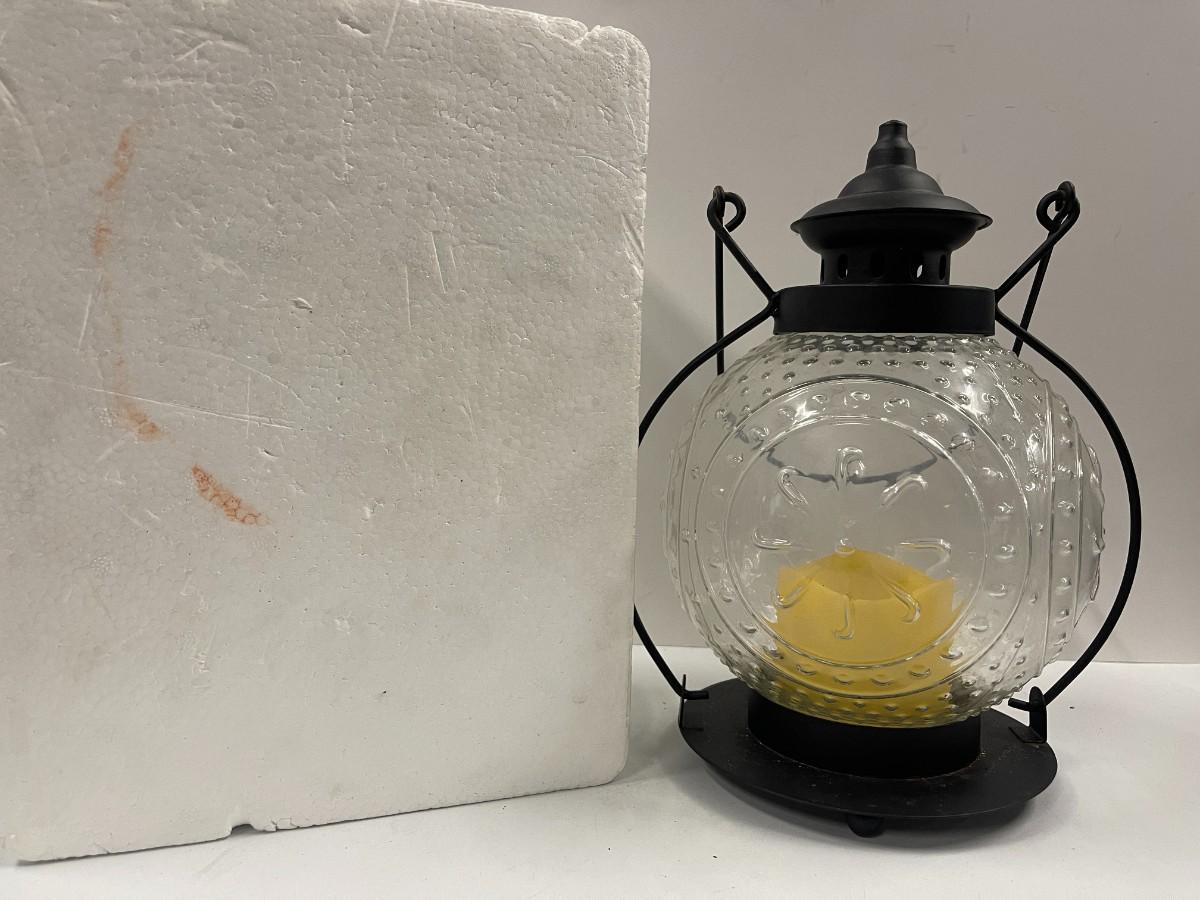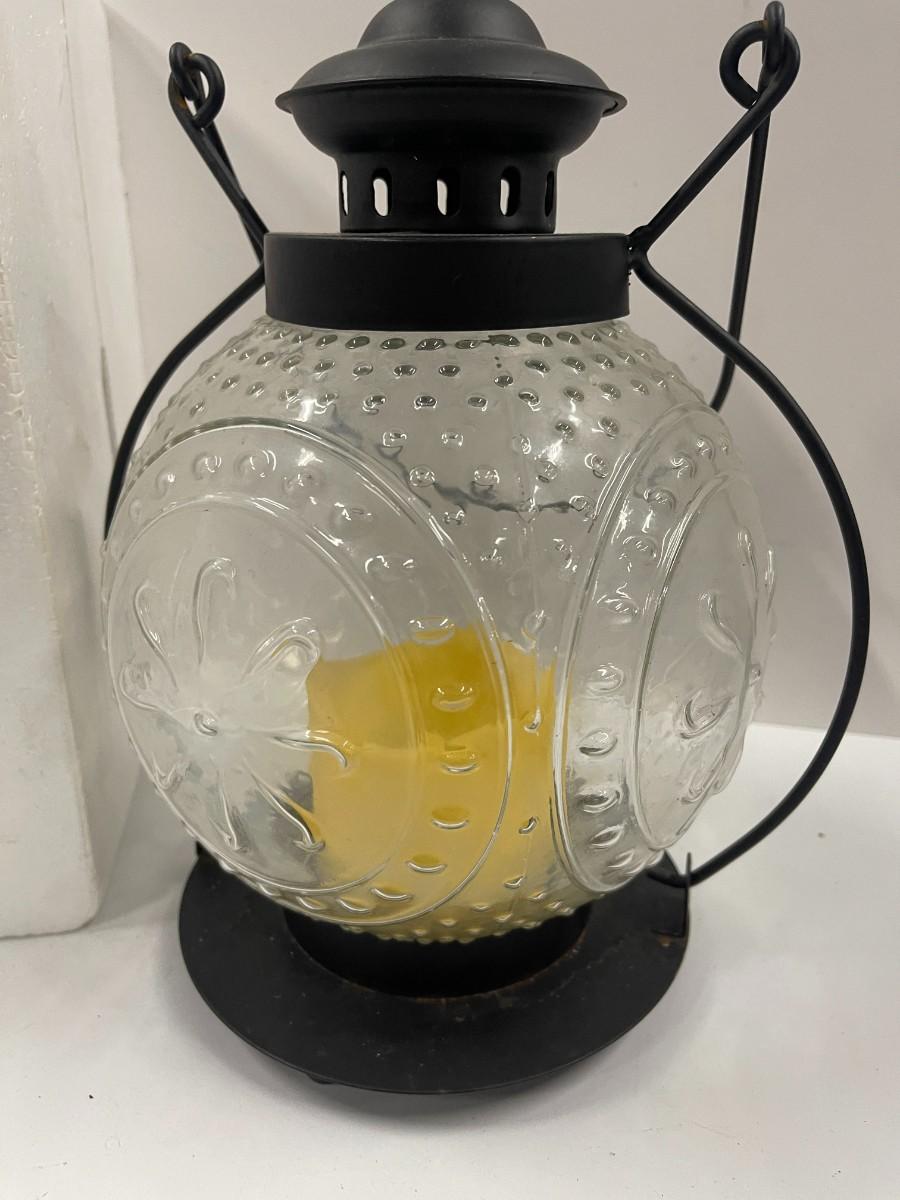 Lot of 3 battery operated candle lanterns. Two of them are new in the box. The one out of the box has been used. Approx 11" high.