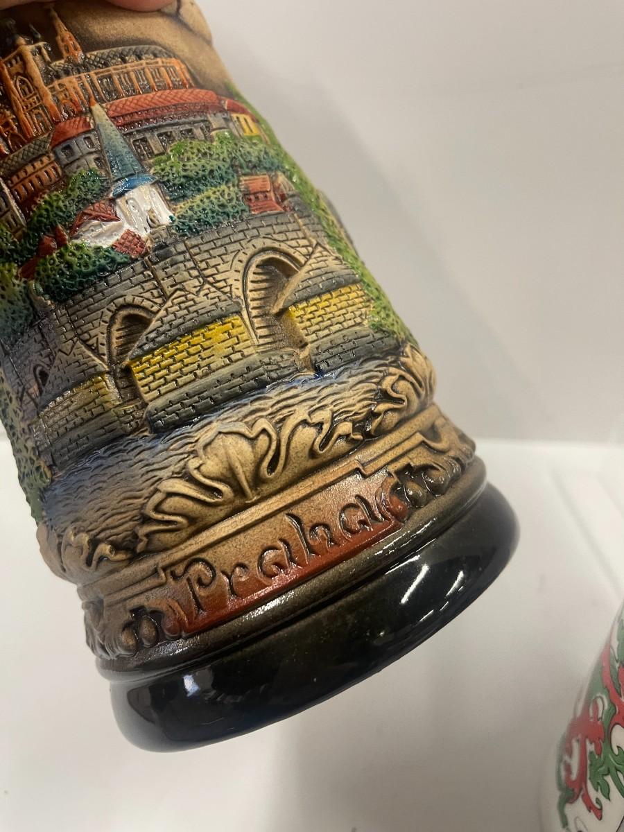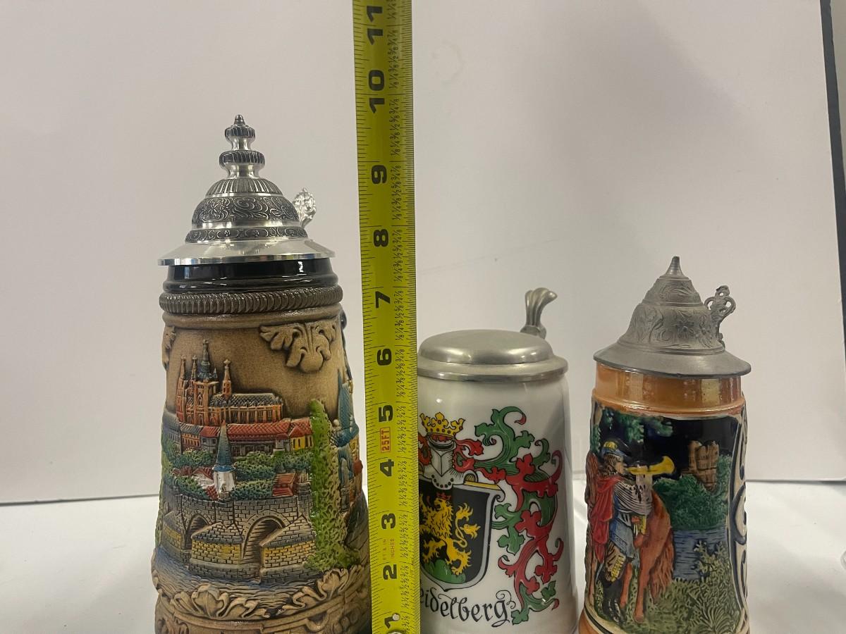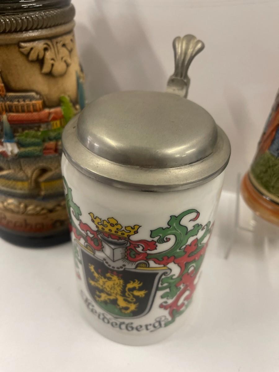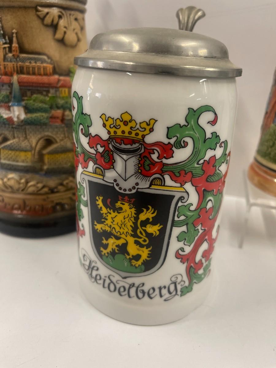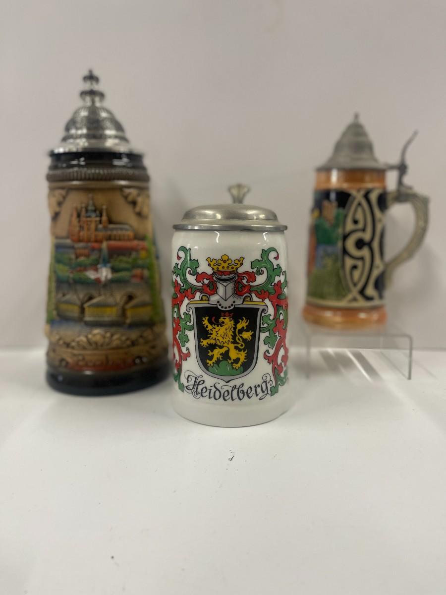 Lot of 3 beer steins: Vintage Heidelberg stein, stein marked Made in Germany, and one Stone Bridge stein from the Czech Republic