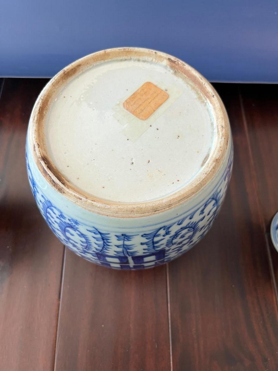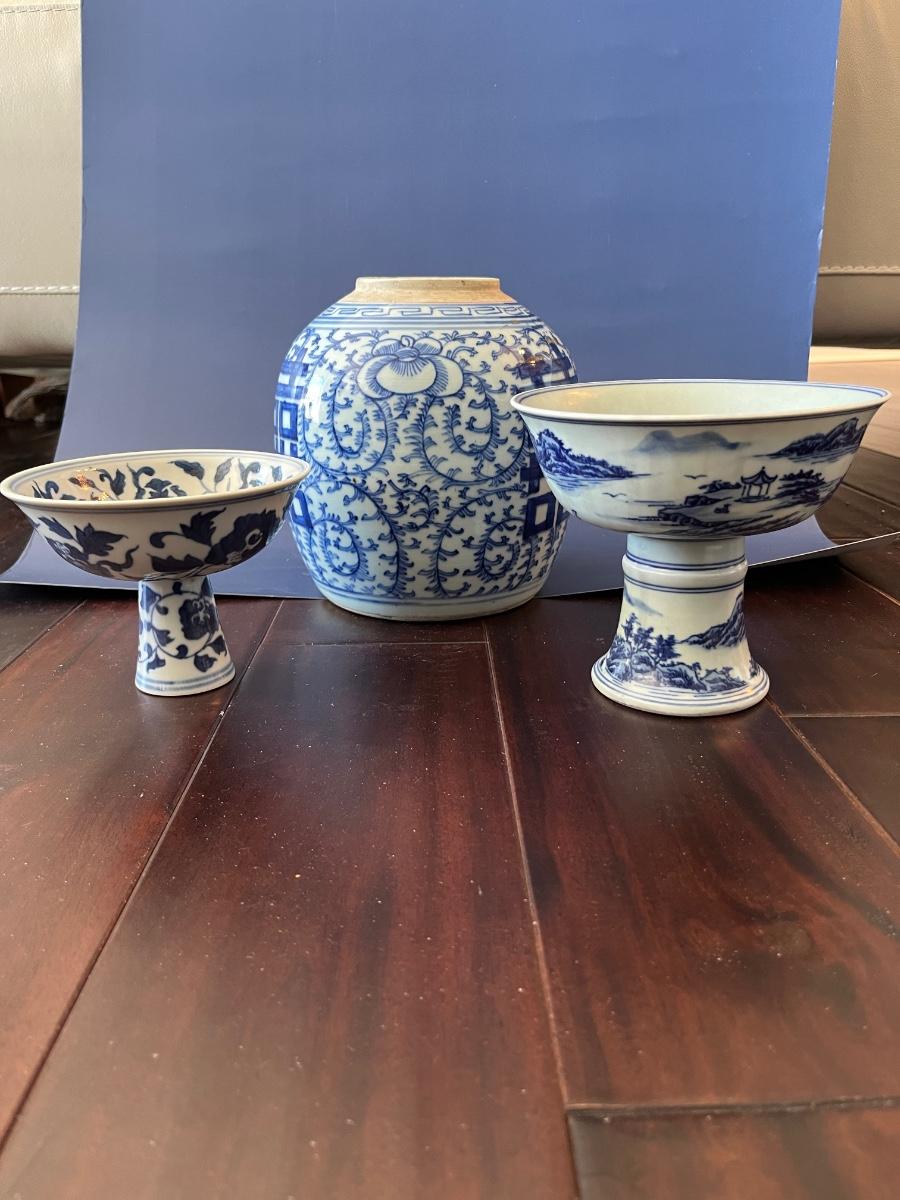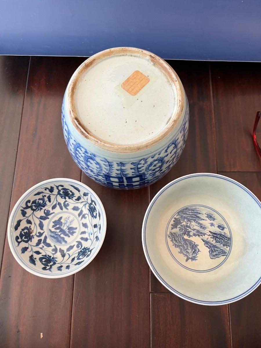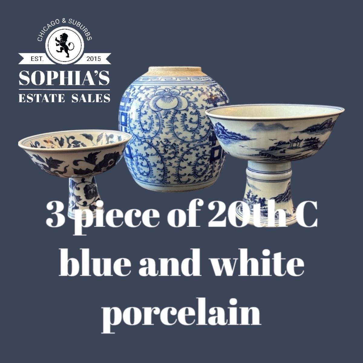 This is a lot of three 20th century pieces of Chinese blue and white porcelain. The jar is missing a lid, but otherwise all the pieces are in good condition.