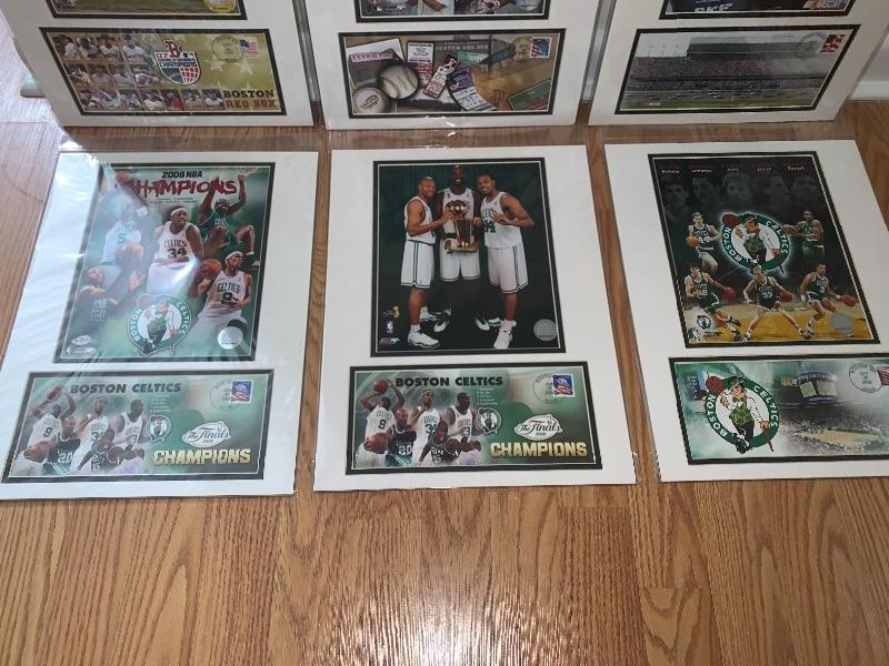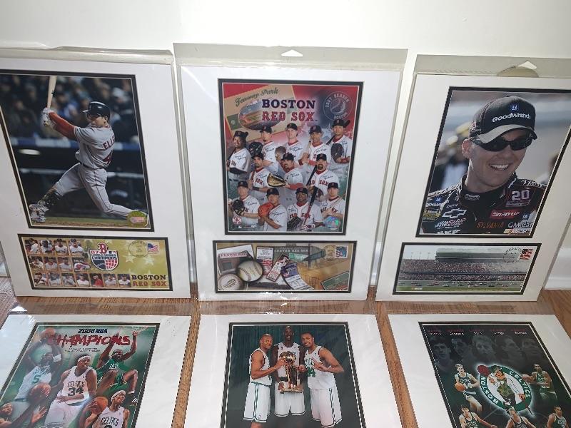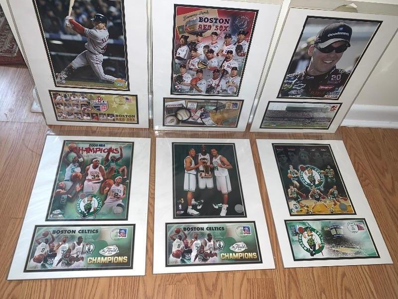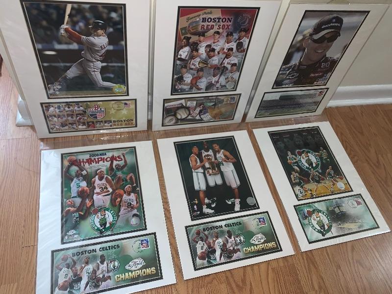 Lot of 3 Boston Celtics, 2 Boston Red Sox & 1 NASCAR Photo/Postcard & Cancelled Stamp Card