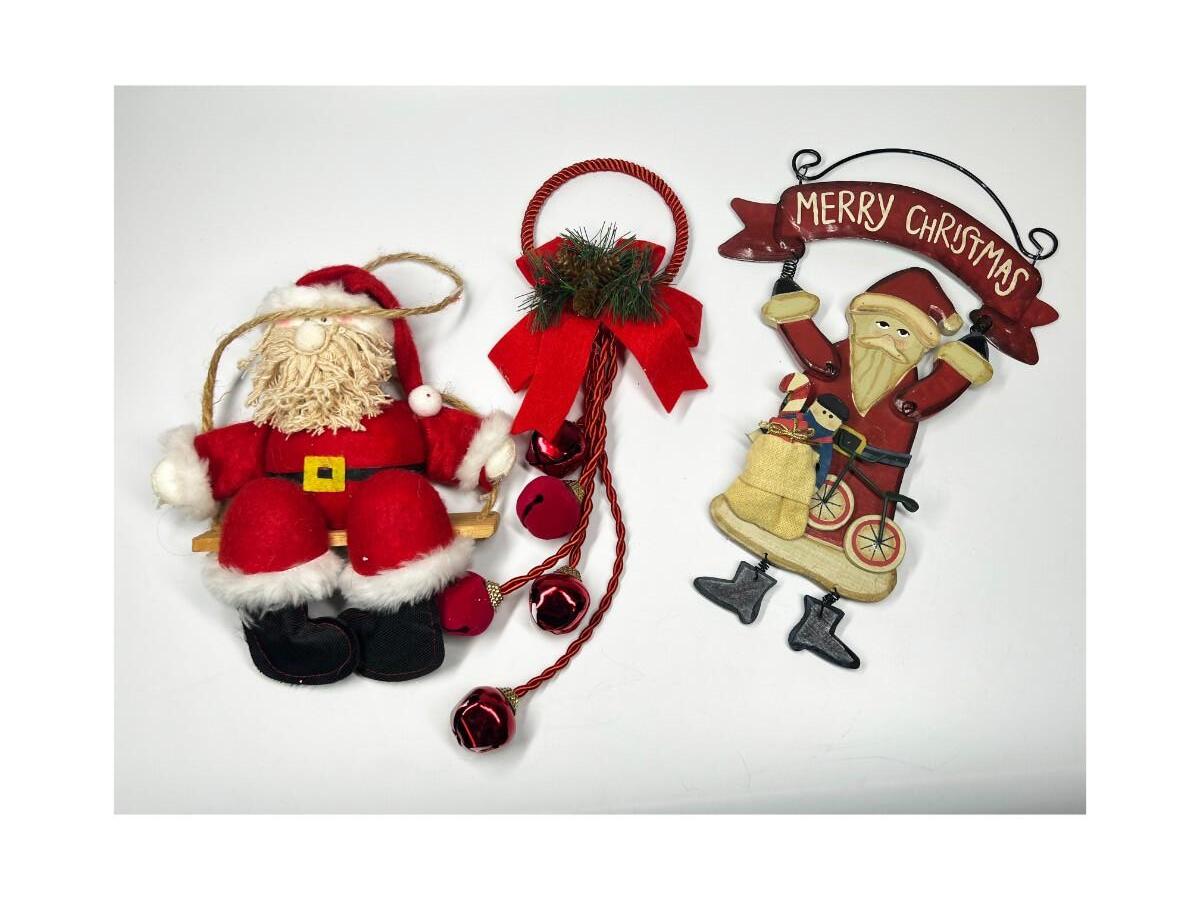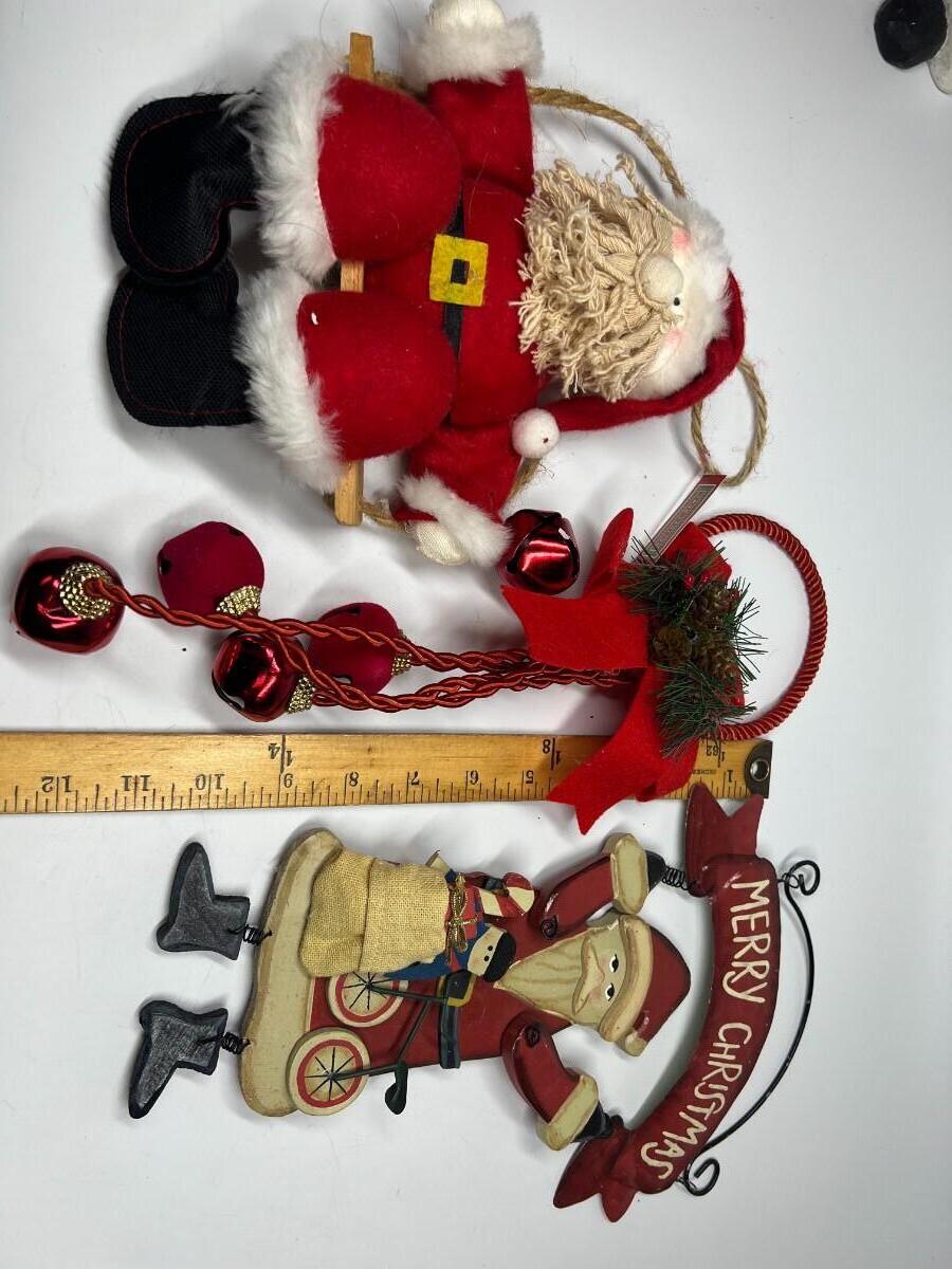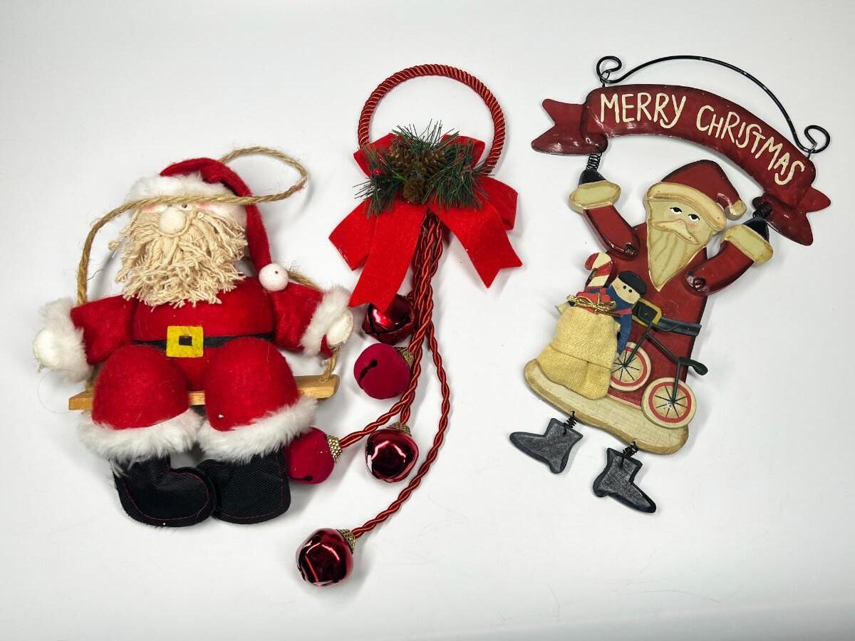 Lot of 3 Christmas Holiday Wall Hanging Decor. Pair of Santa Claus wall items and set of jiggle bells. Good condition.