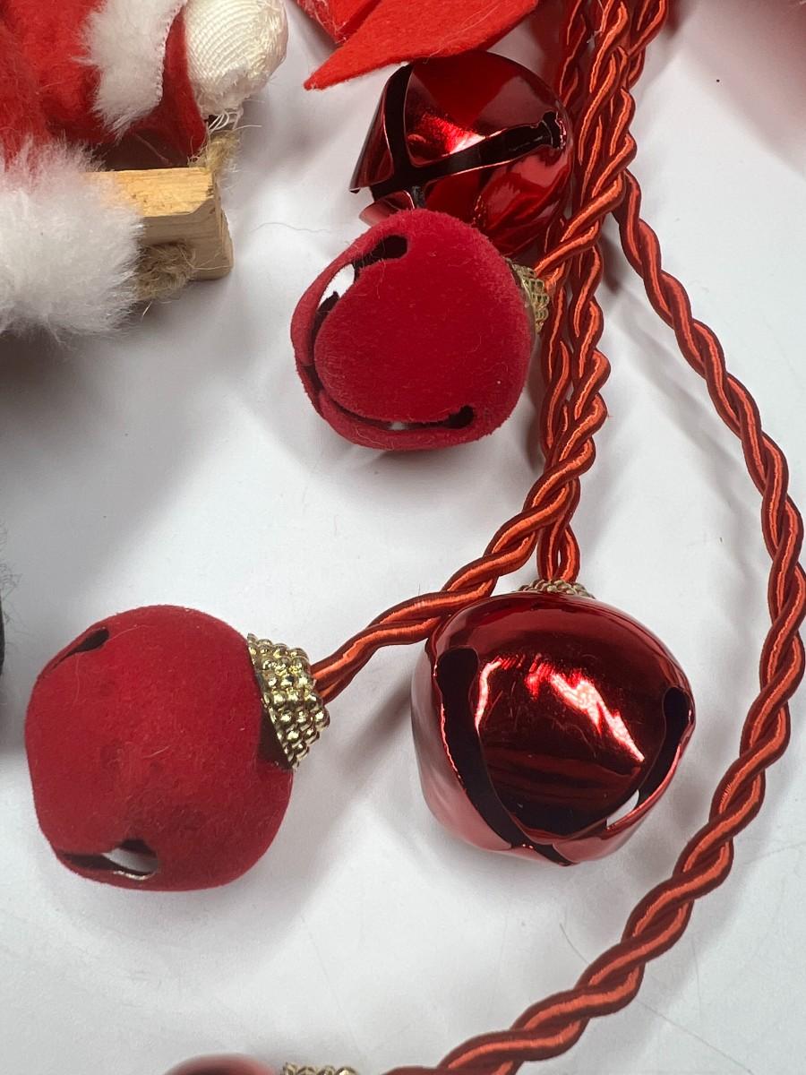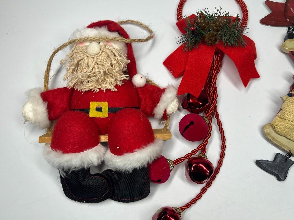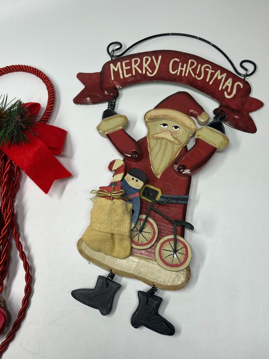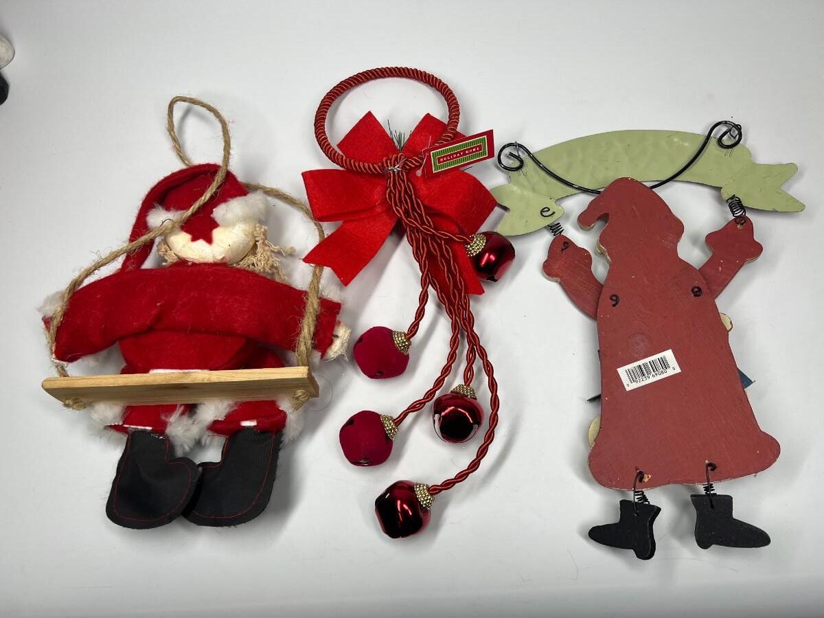 Lot of 3 Christmas Holiday Wall Hanging Decor. Pair of Santa Claus wall items and set of jiggle bells. Good condition.